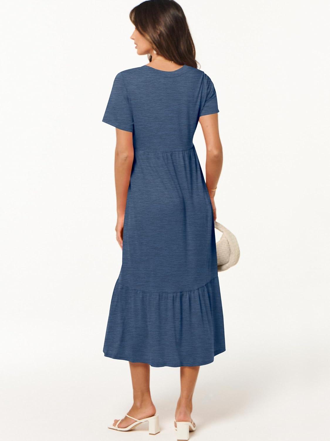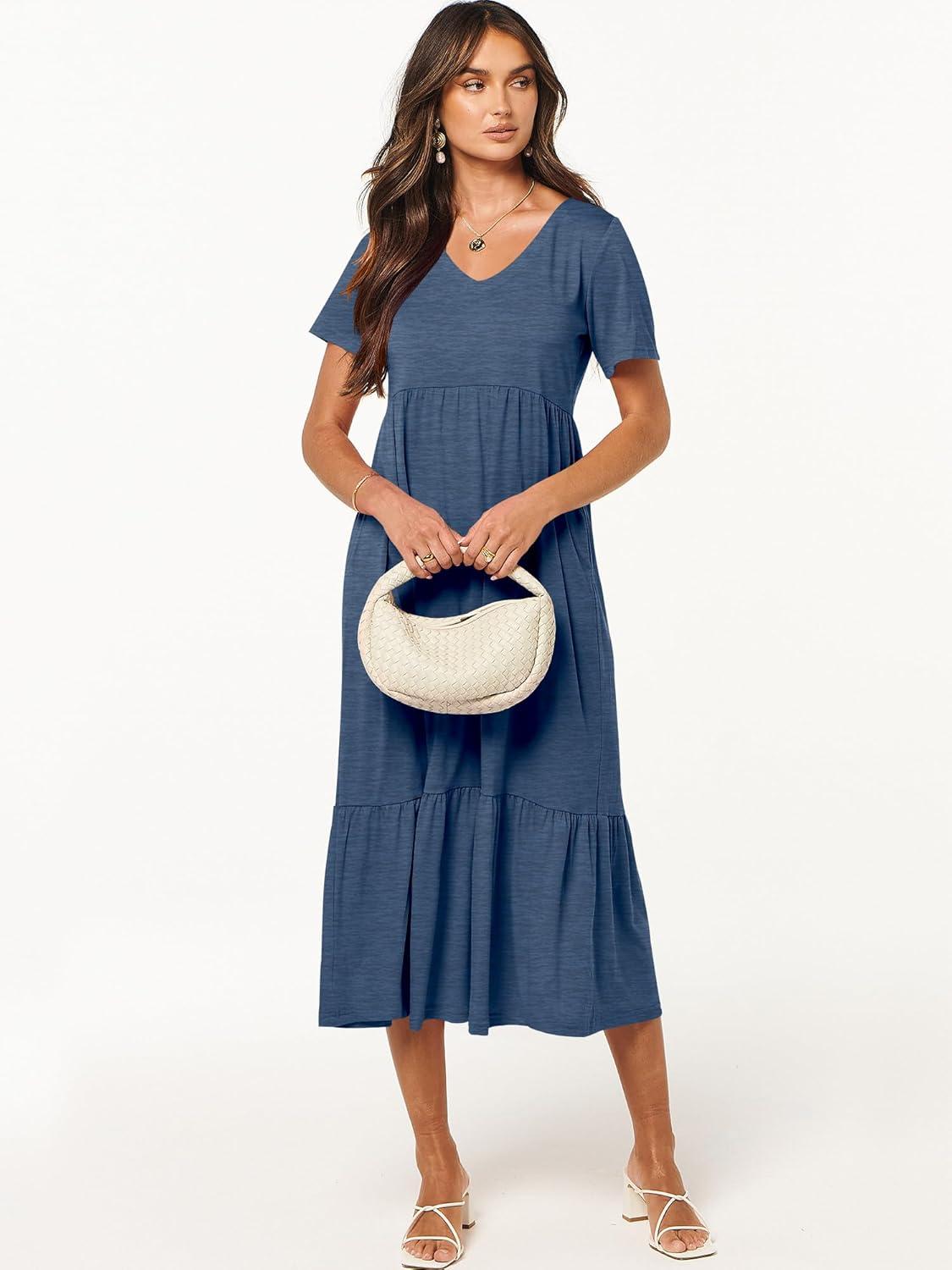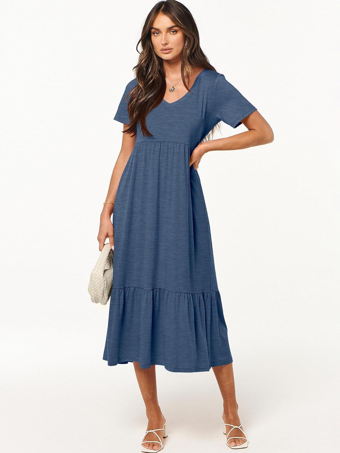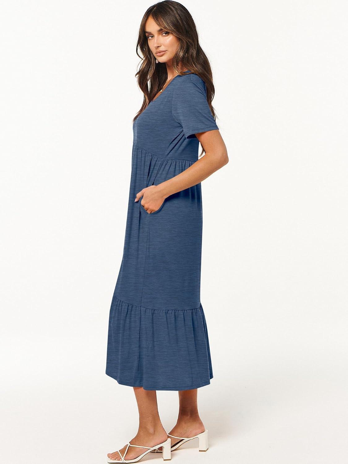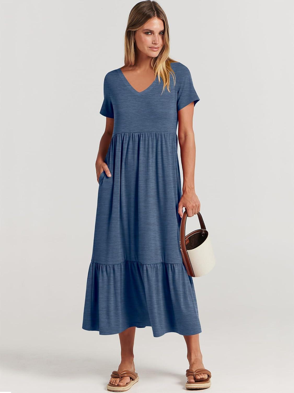 ANRABESS Women’s Summer Casual Short Sleeve T Shirts Maxi Dress Flowy V Neck Tiered Beach Vacation Sundress 2025 Outfits(Blue)