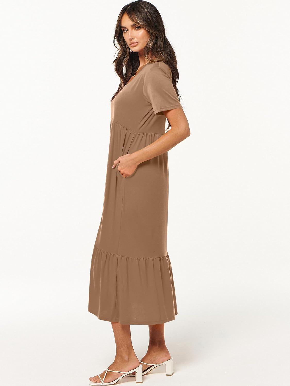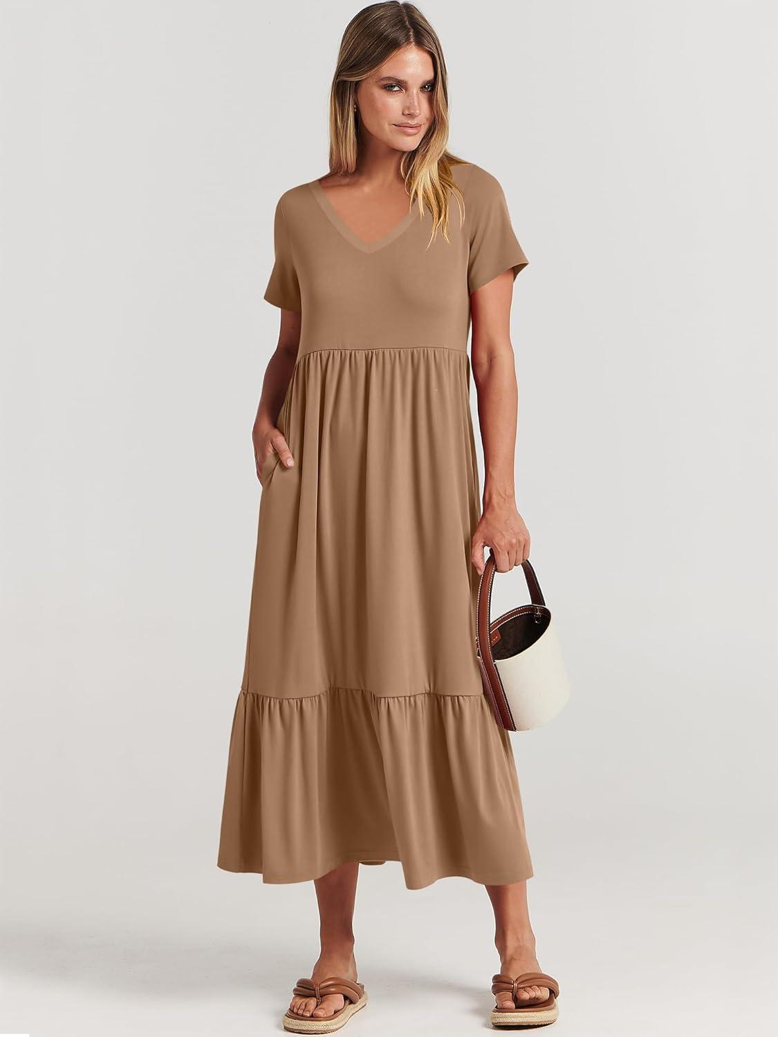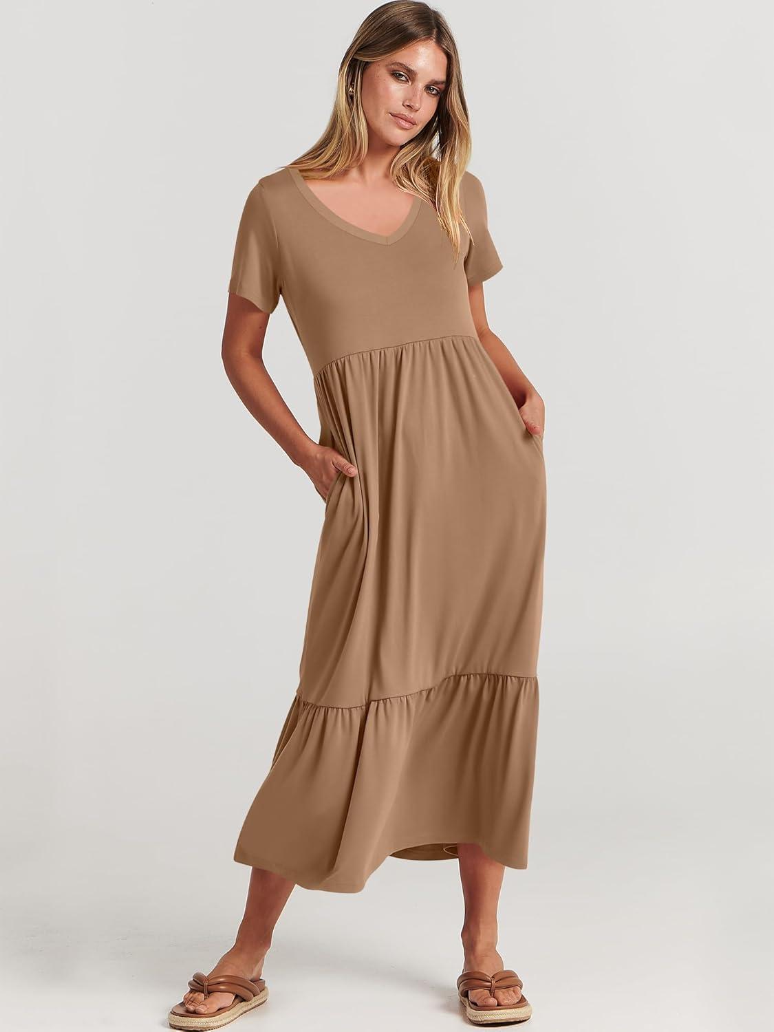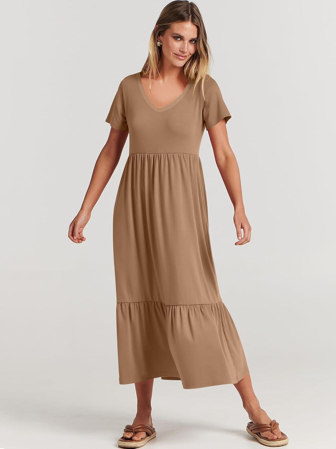 ANRABESS Women’s Summer Casual Short Sleeve T Shirts Maxi Dress Flowy V Neck Tiered Beach Vacation Sundress 2025 Outfits(Light Brown)