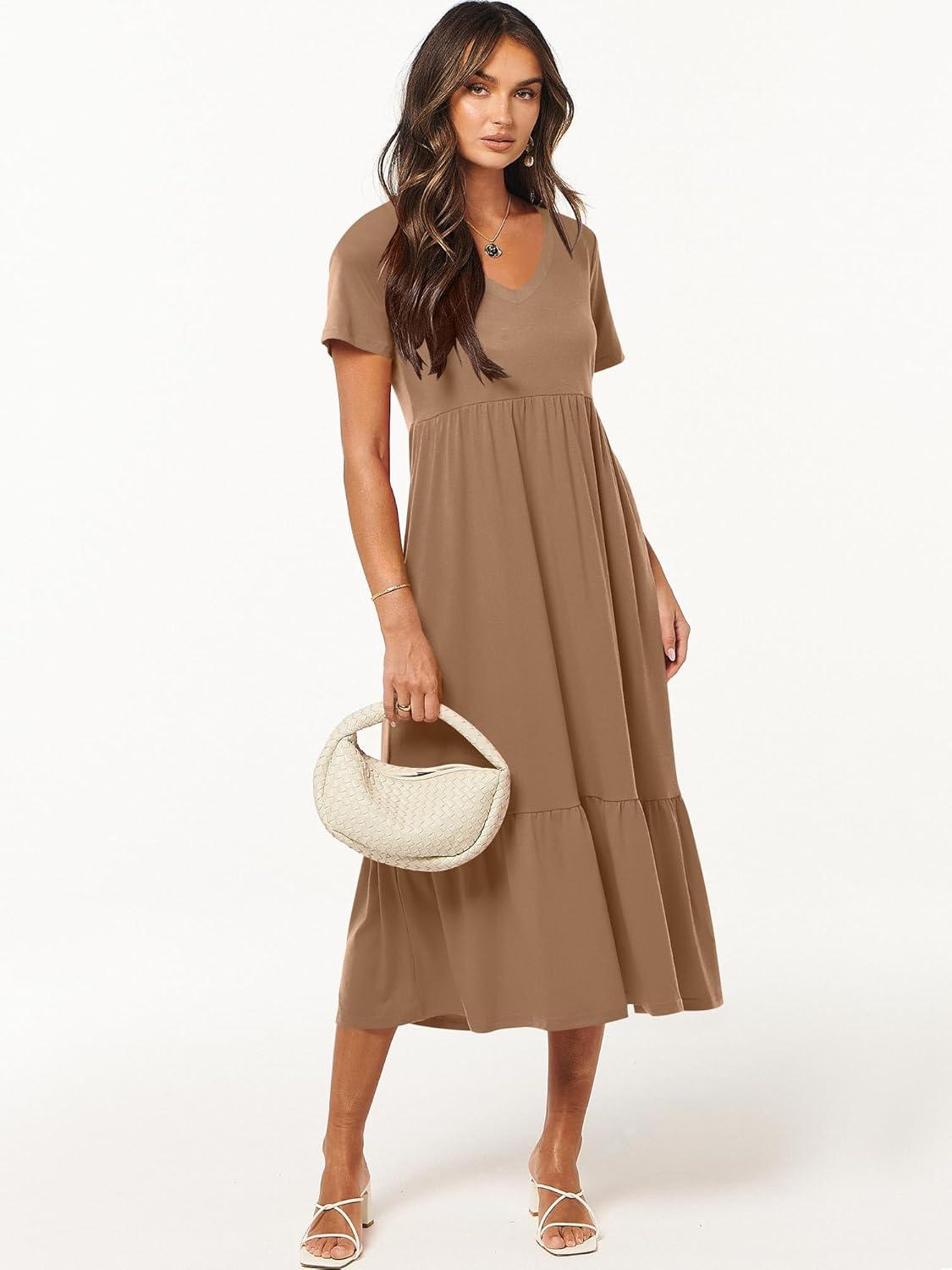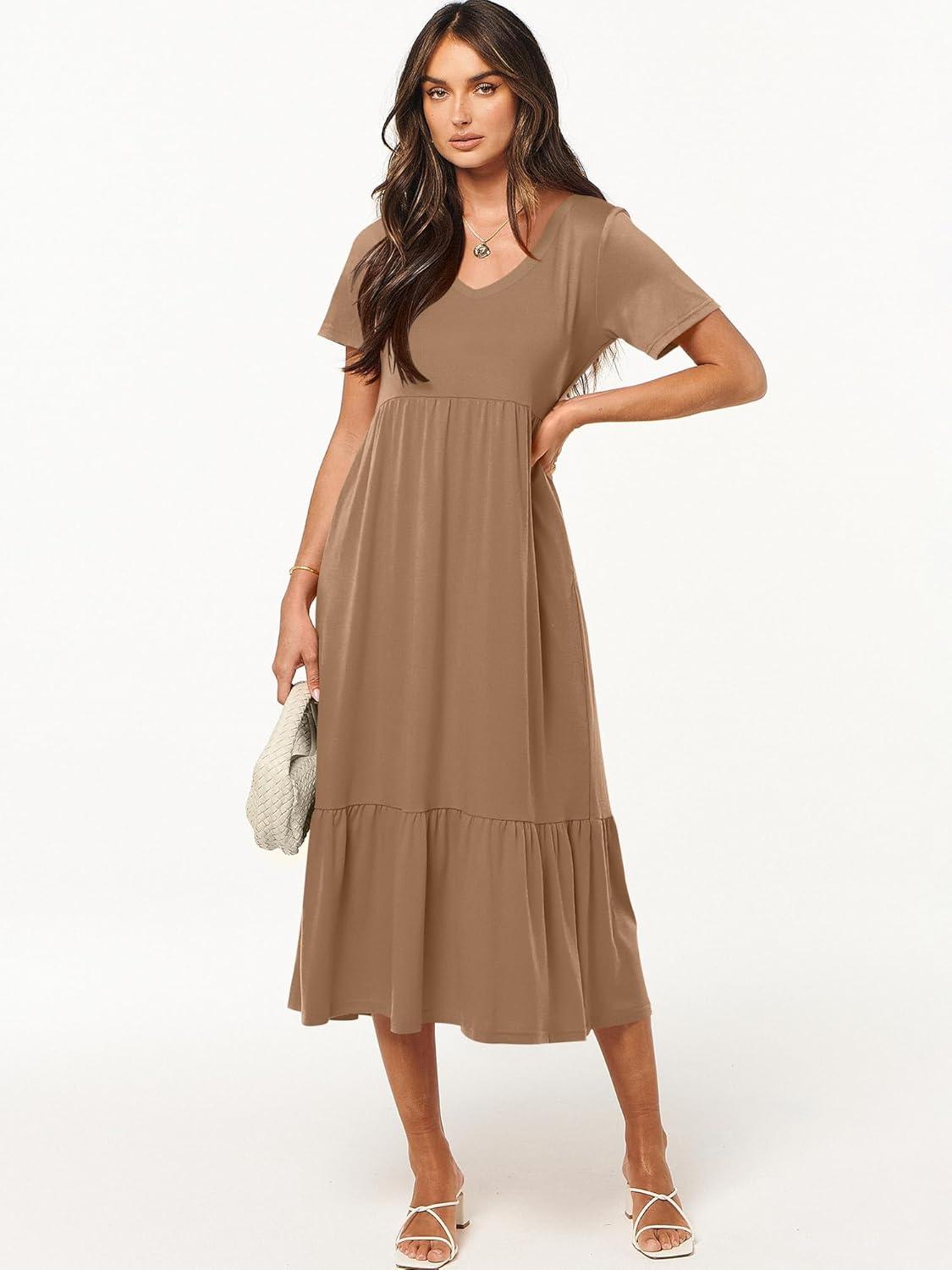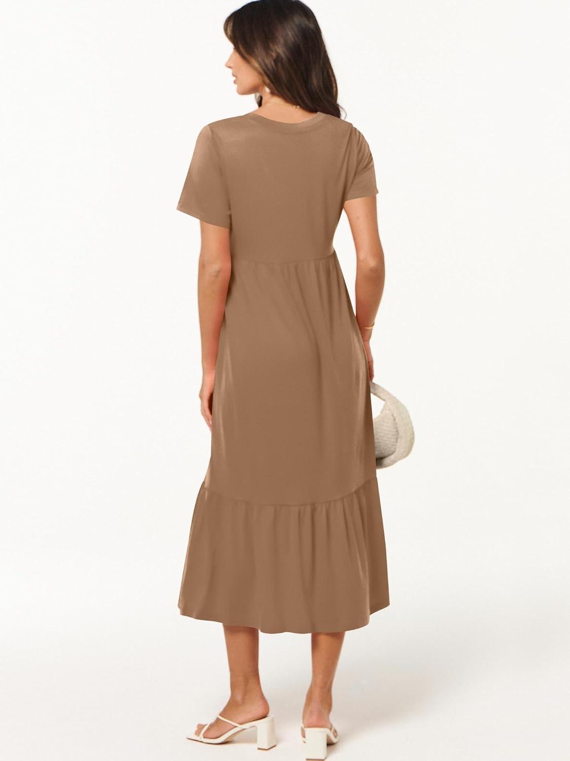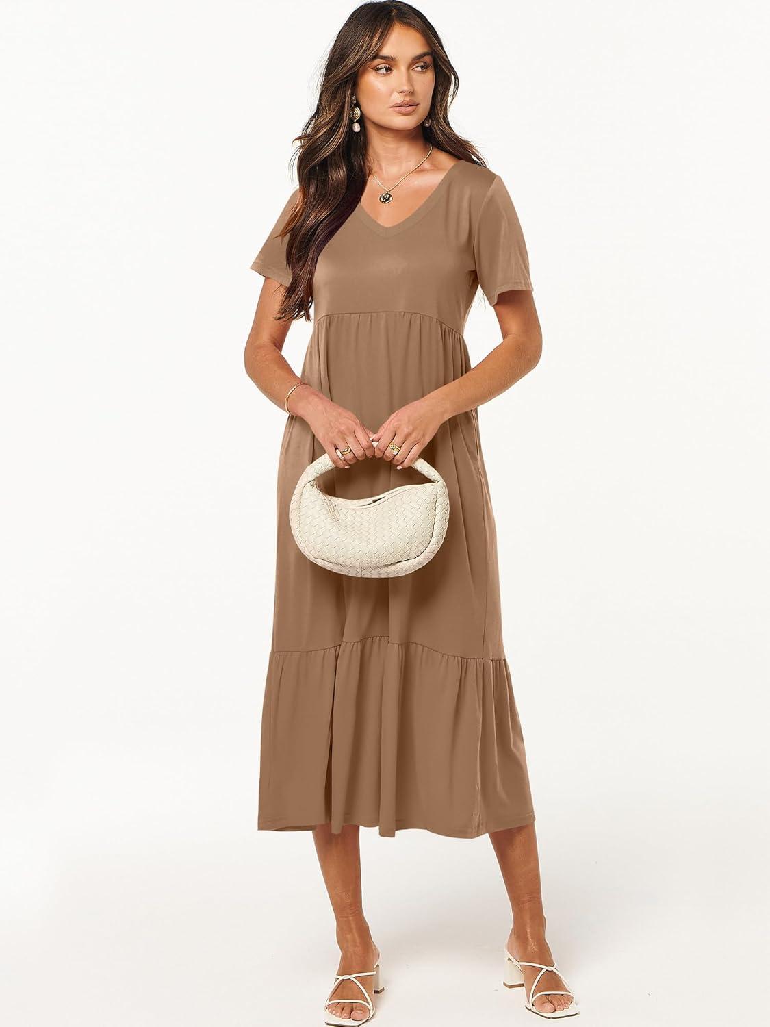 ANRABESS Women’s Summer Casual Short Sleeve T Shirts Maxi Dress Flowy V Neck Tiered Beach Vacation Sundress 2025 Outfits(Light Brown)