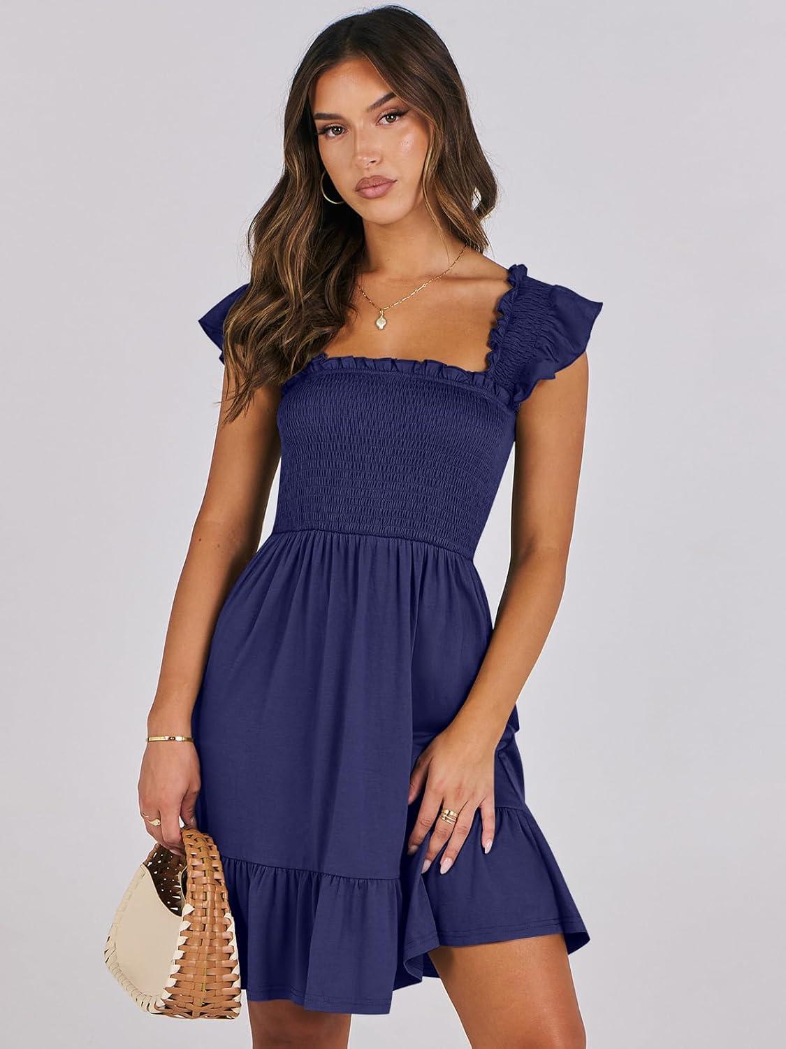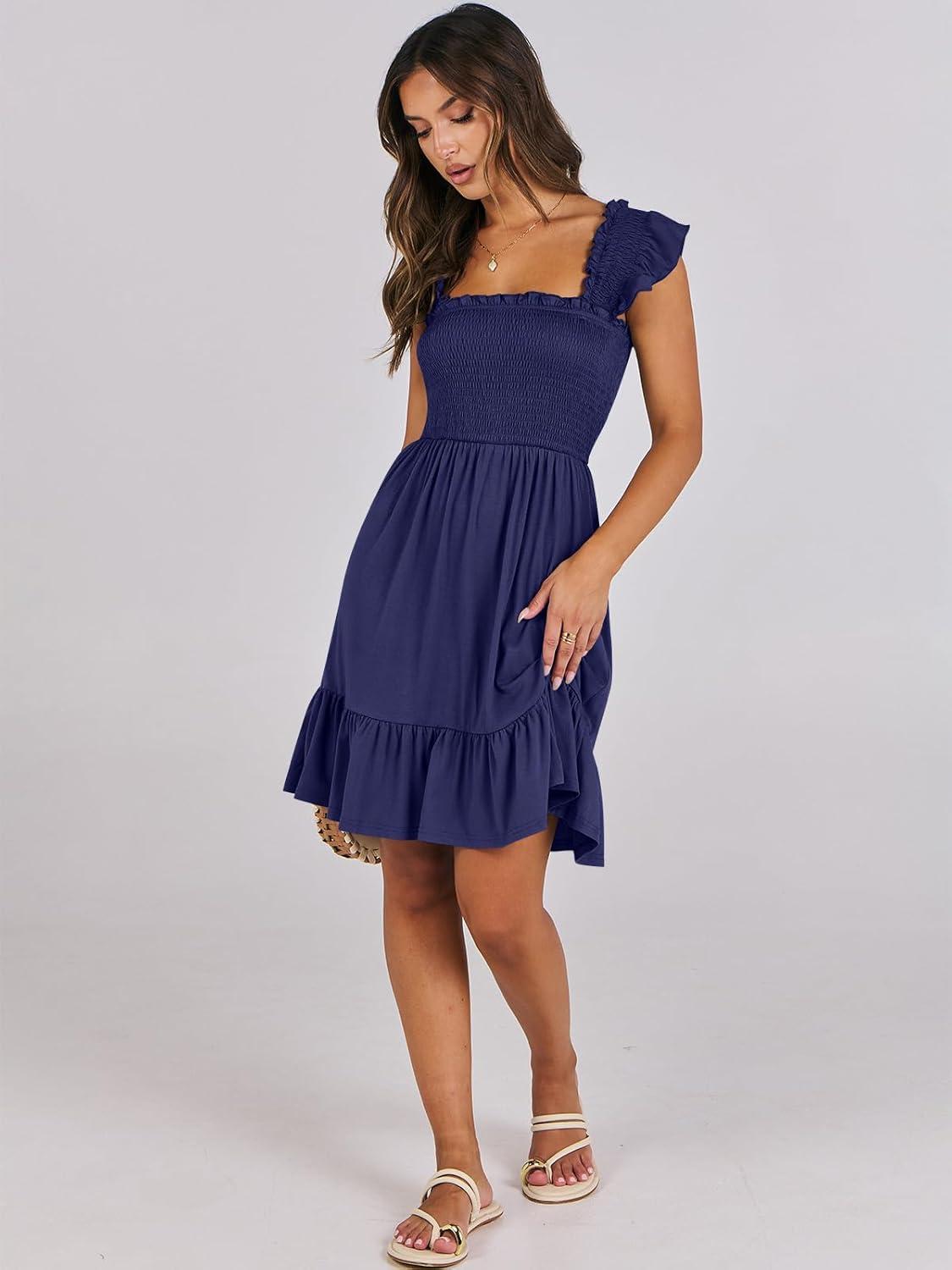 ANRABESS Women’s Summer Casual Sleeveless Square Neck Dress 2025 Smocked Ruffle Backless Boho Beach Cute Teen Short Sundress(Navy Blue)