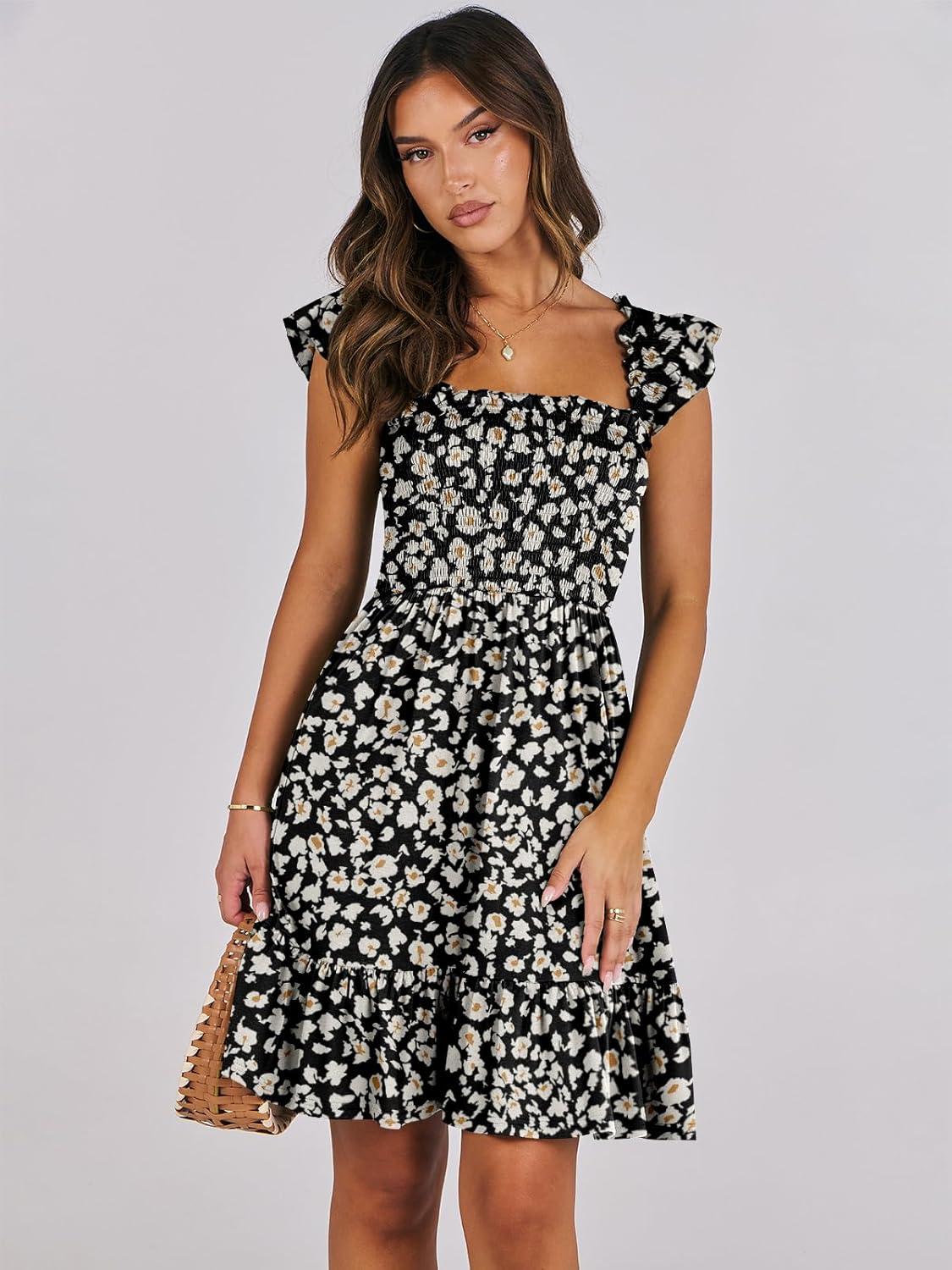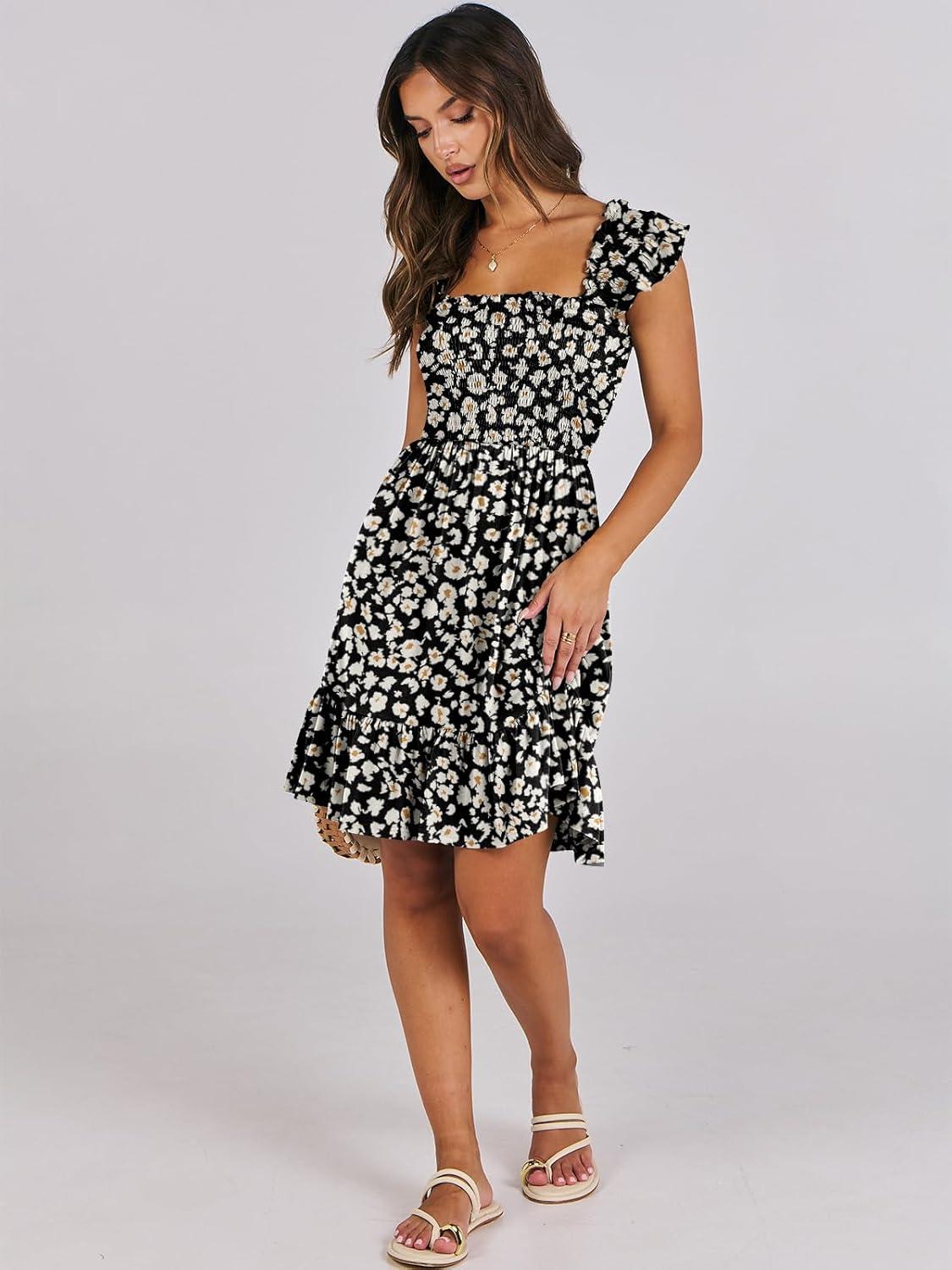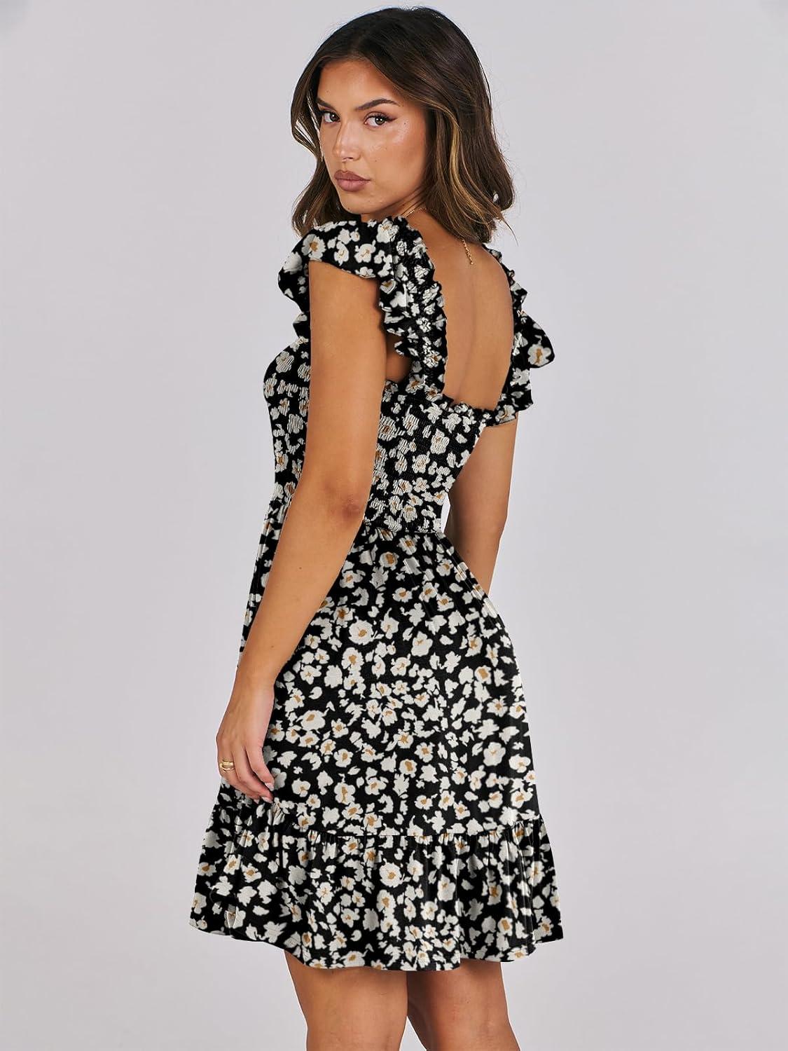 ANRABESS Women’s Summer Casual Sleeveless Square Neck Dress 2025 Smocked Ruffle Backless Boho Beach Cute Teen Short Sundress(Print Floral Black)
