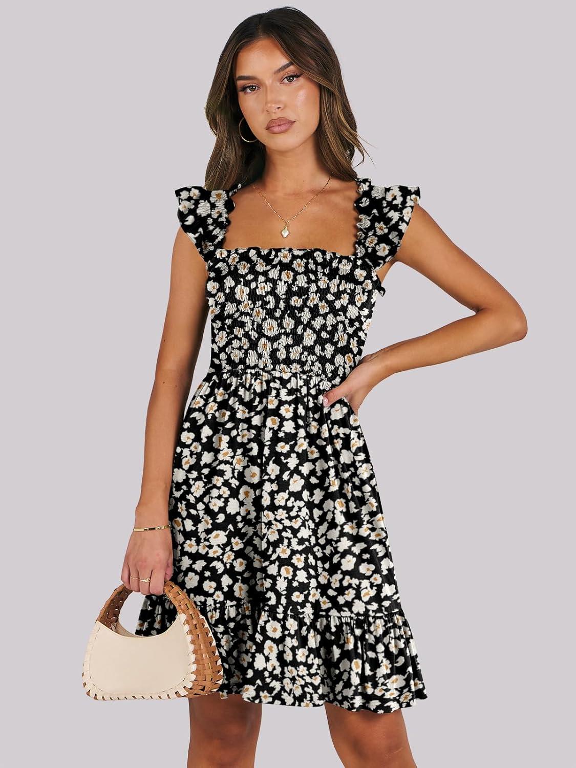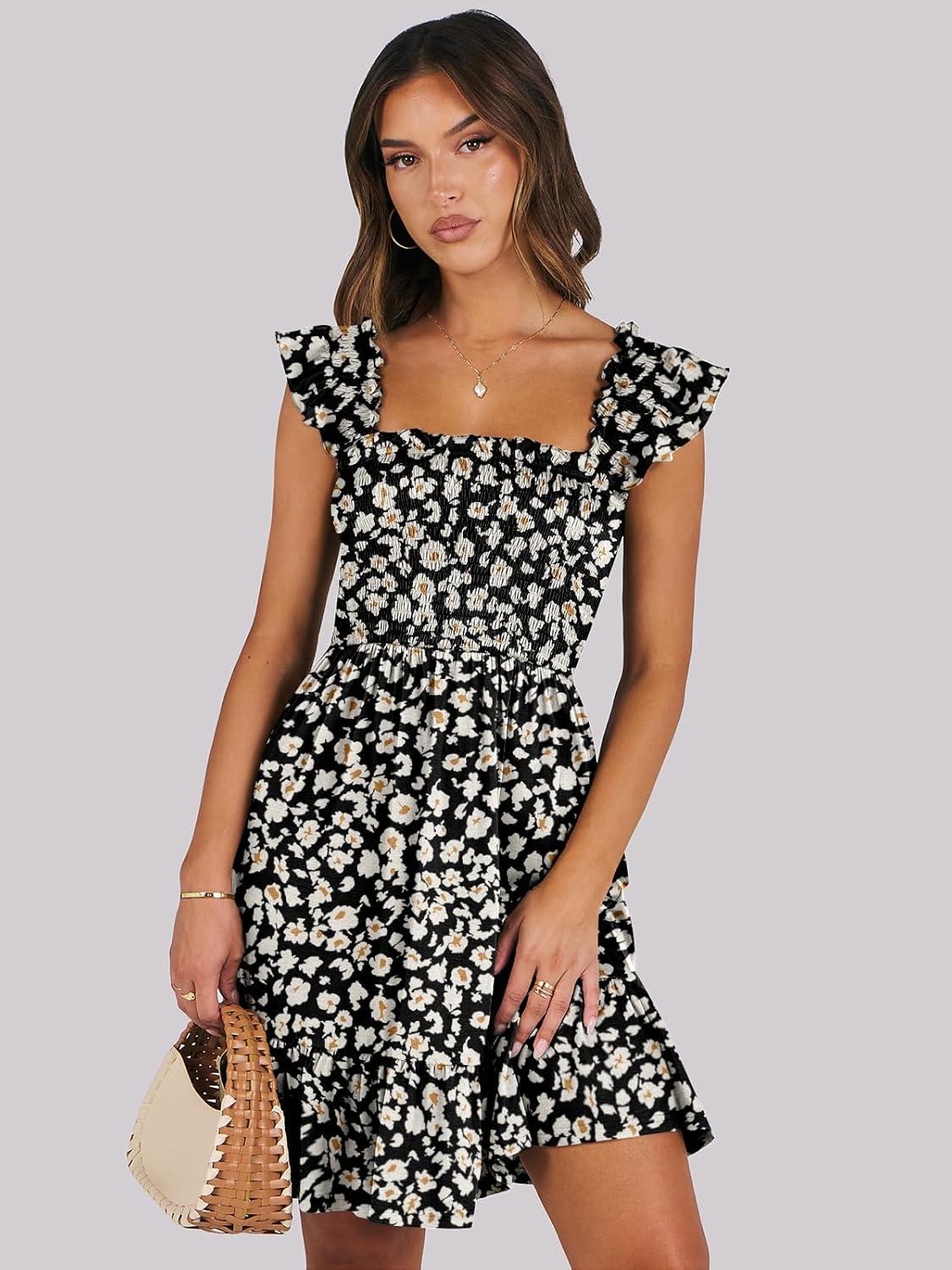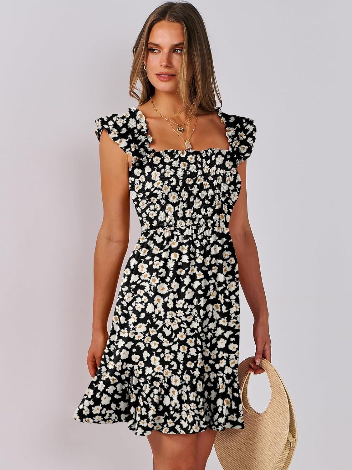 ANRABESS Women’s Summer Casual Sleeveless Square Neck Dress 2025 Smocked Ruffle Backless Boho Beach Cute Teen Short Sundress(Print Floral Black)