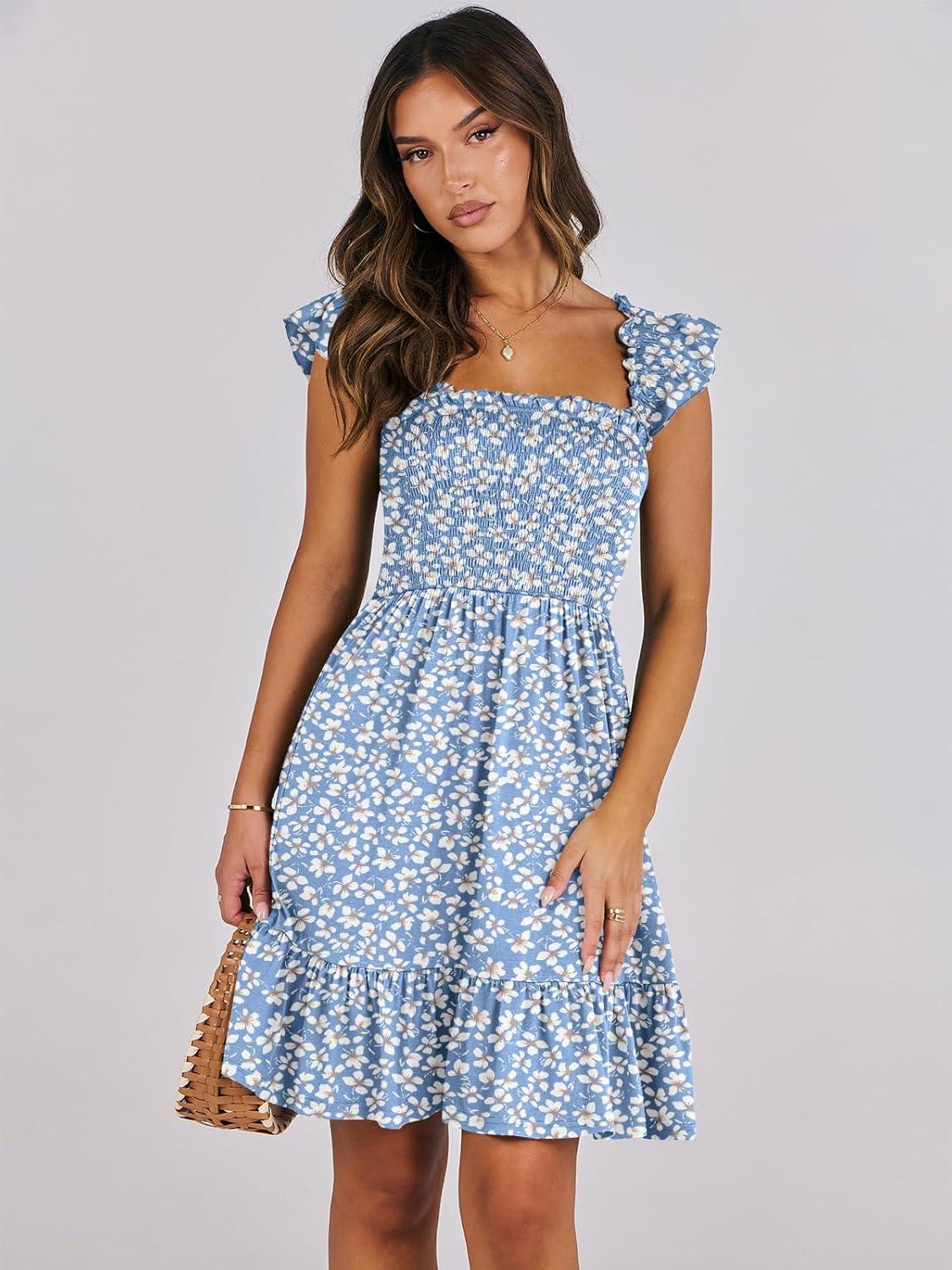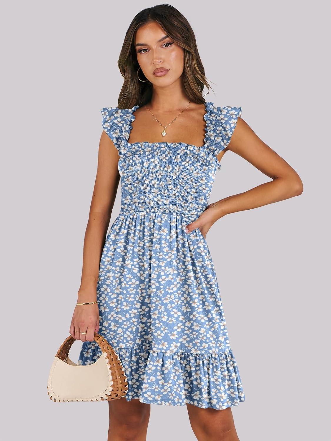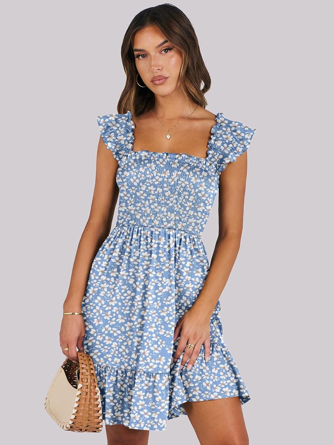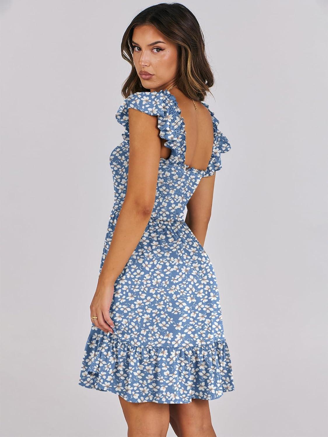 ANRABESS Women’s Summer Casual Sleeveless Square Neck Dress 2025 Smocked Ruffle Backless Boho Beach Cute Teen Short Sundress(Print Floral Blue)