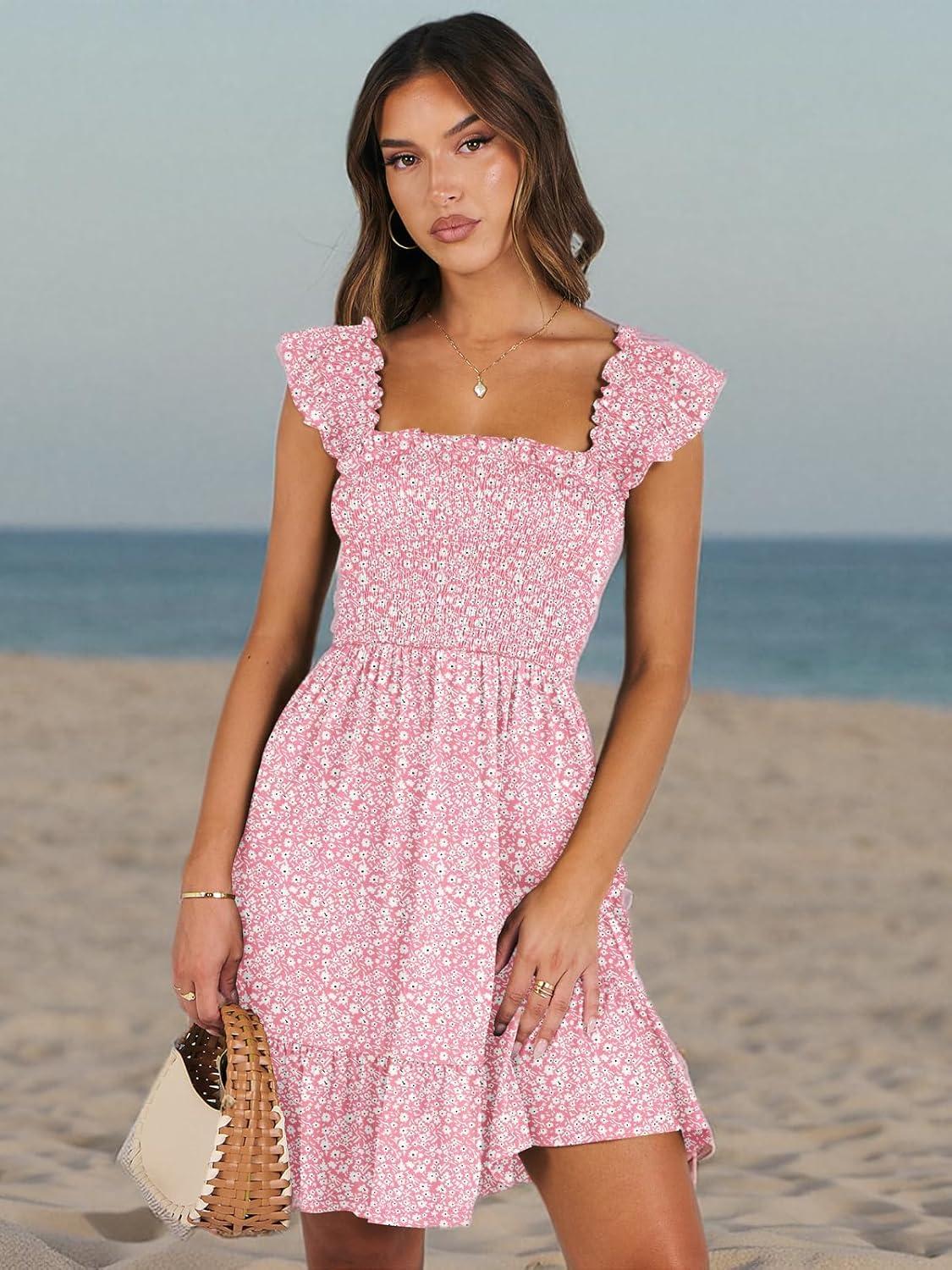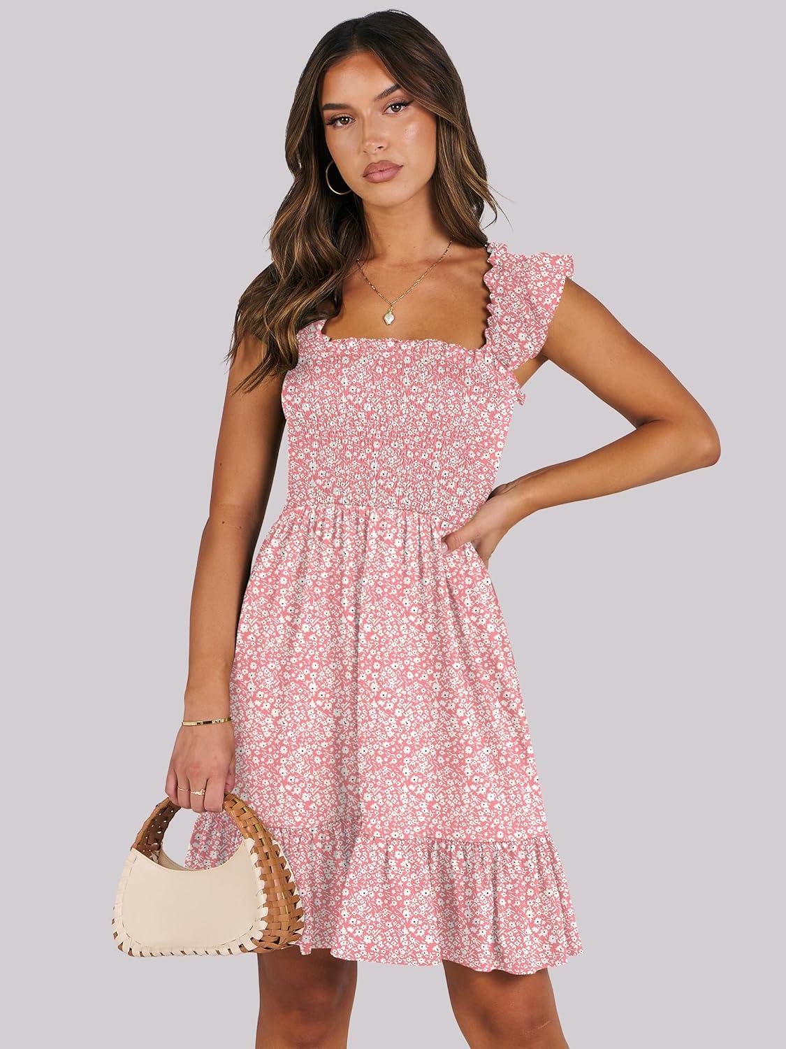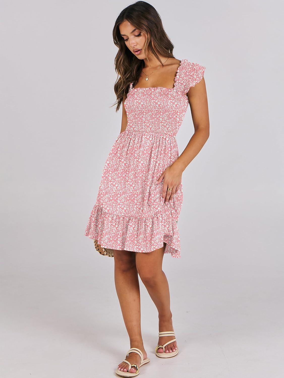 ANRABESS Women’s Summer Casual Sleeveless Square Neck Dress 2025 Smocked Ruffle Backless Boho Beach Cute Teen Short Sundress(Print Floral Pink)