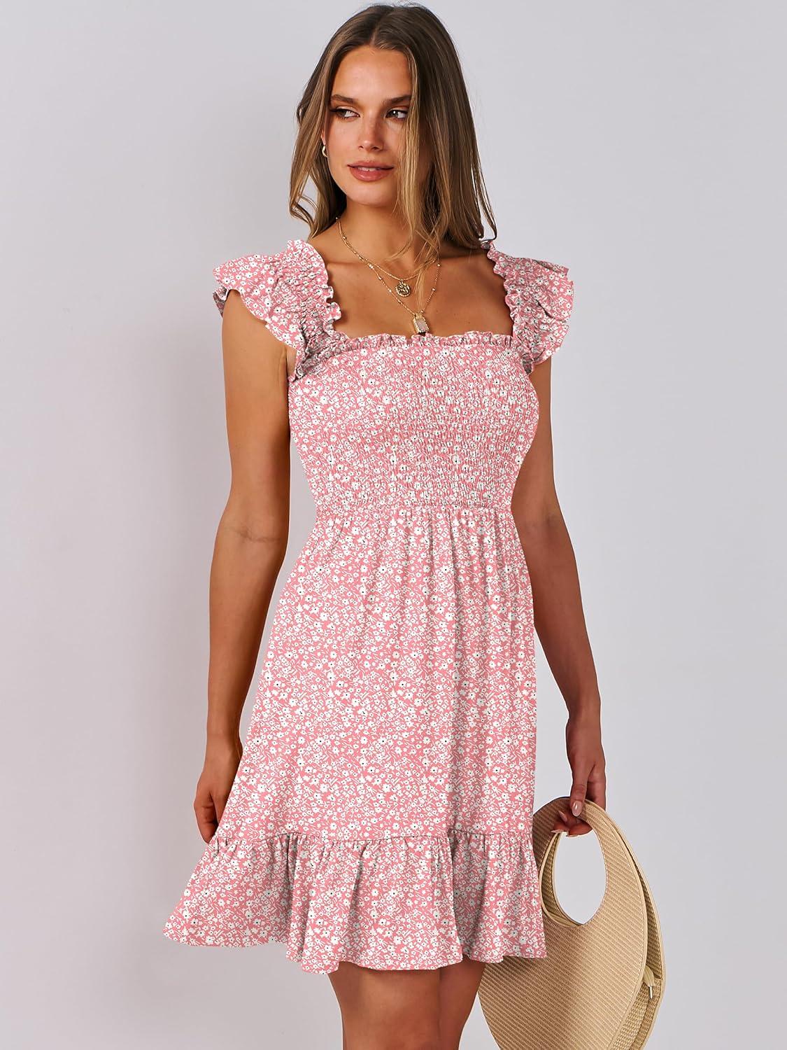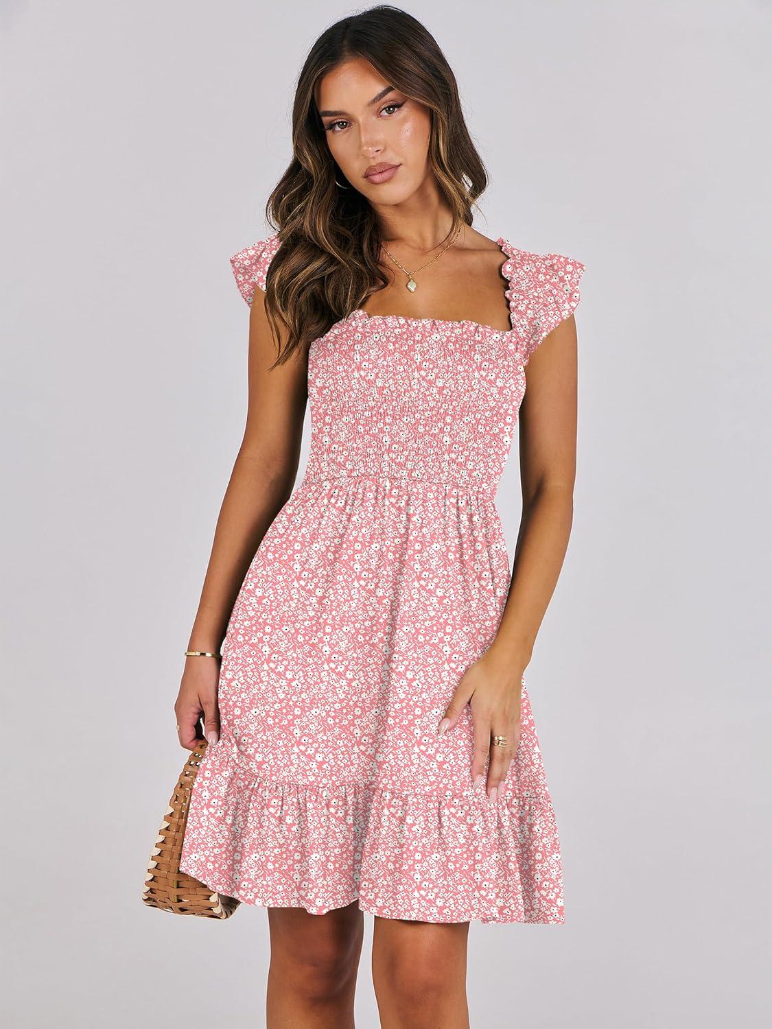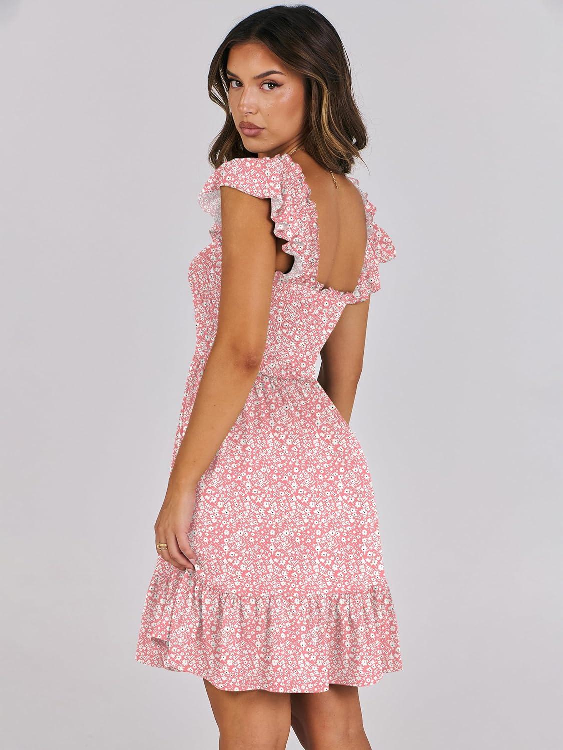 ANRABESS Women’s Summer Casual Sleeveless Square Neck Dress 2025 Smocked Ruffle Backless Boho Beach Cute Teen Short Sundress(Print Floral Pink)