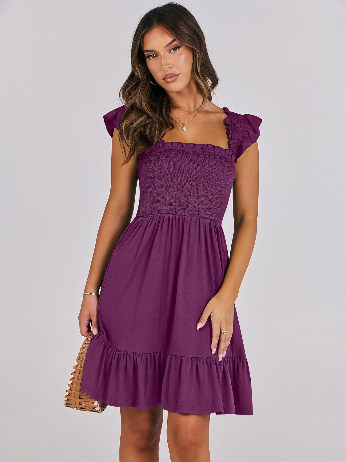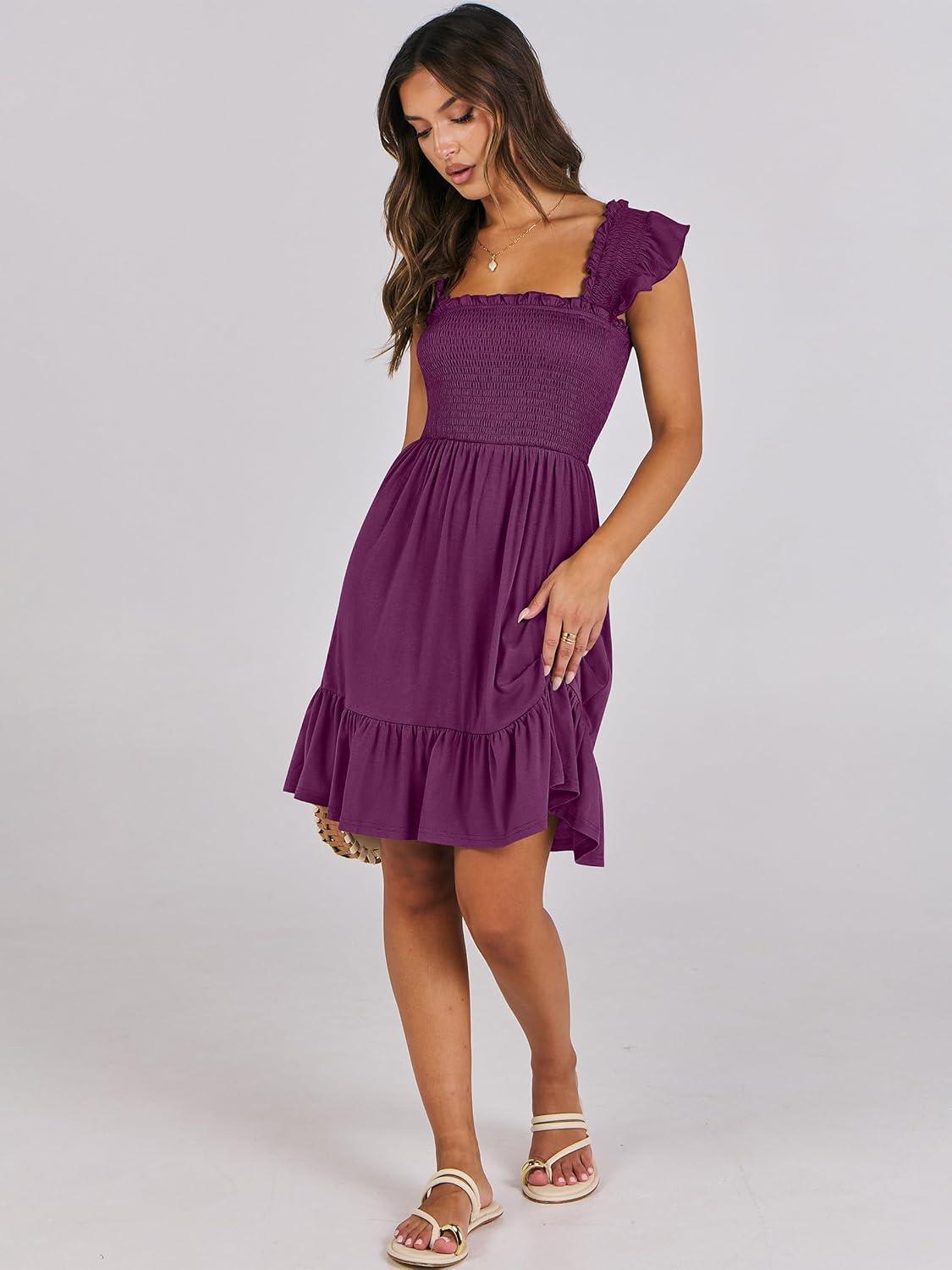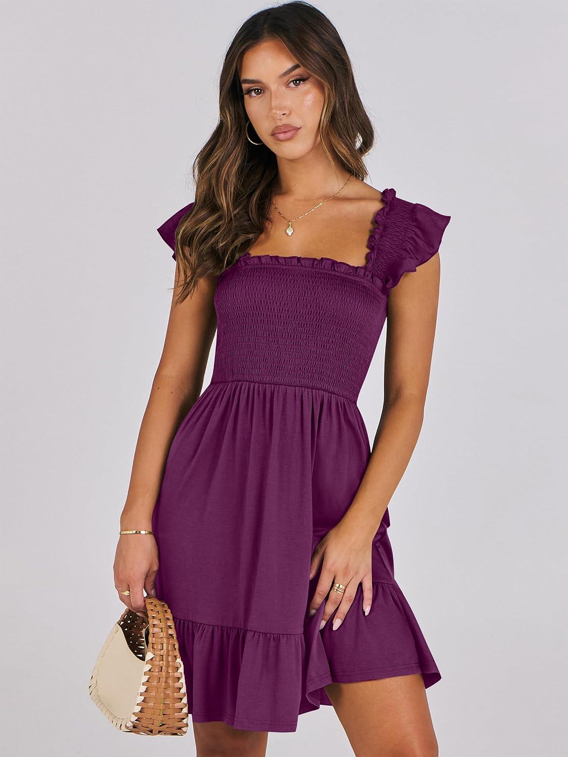 ANRABESS Women’s Summer Casual Sleeveless Square Neck Dress 2025 Smocked Ruffle Backless Boho Beach Cute Teen Short Sundress(Purple Red)