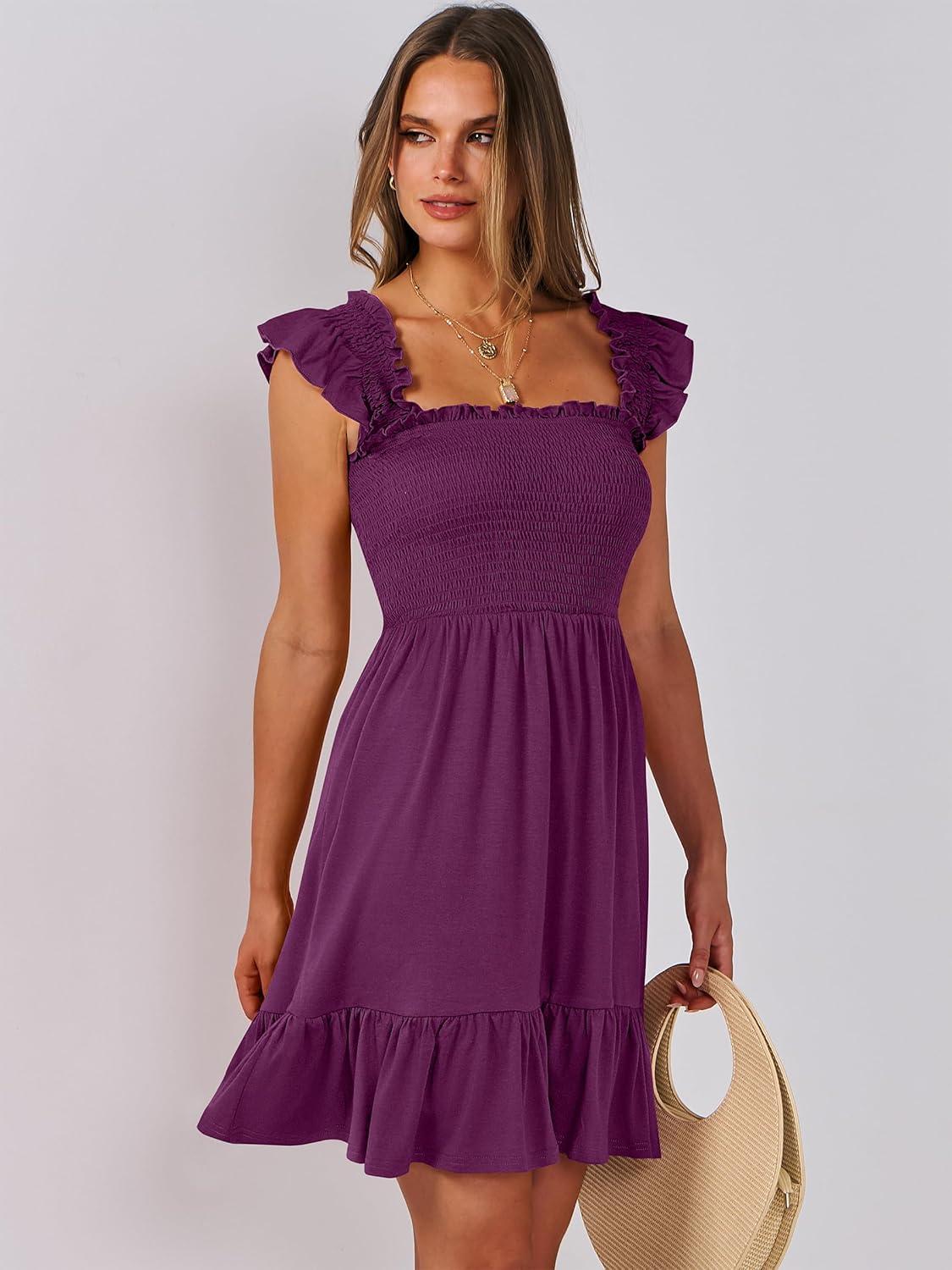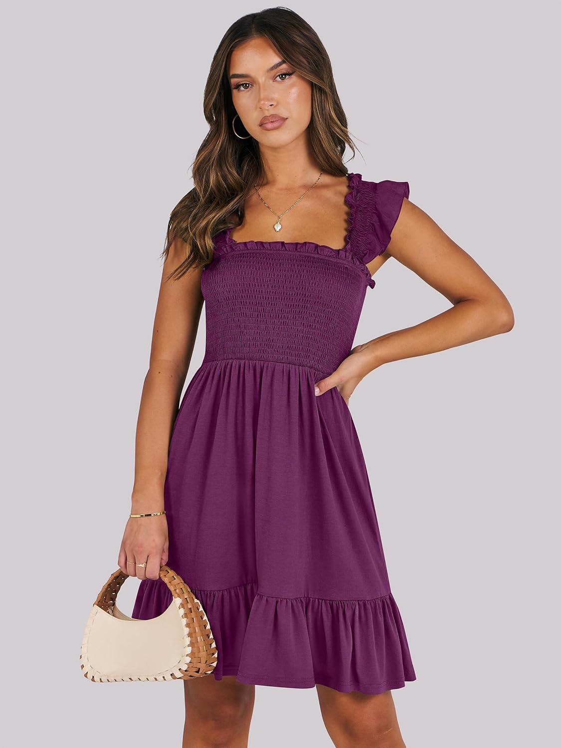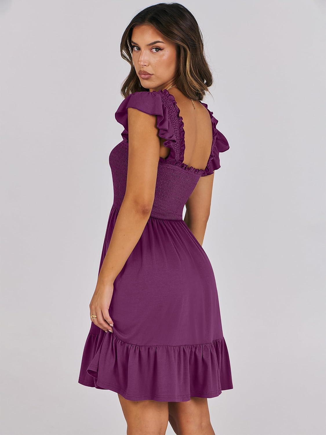 ANRABESS Women’s Summer Casual Sleeveless Square Neck Dress 2025 Smocked Ruffle Backless Boho Beach Cute Teen Short Sundress(Purple Red)