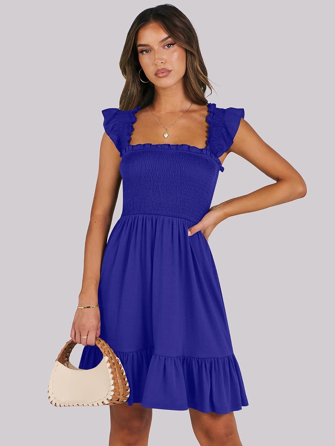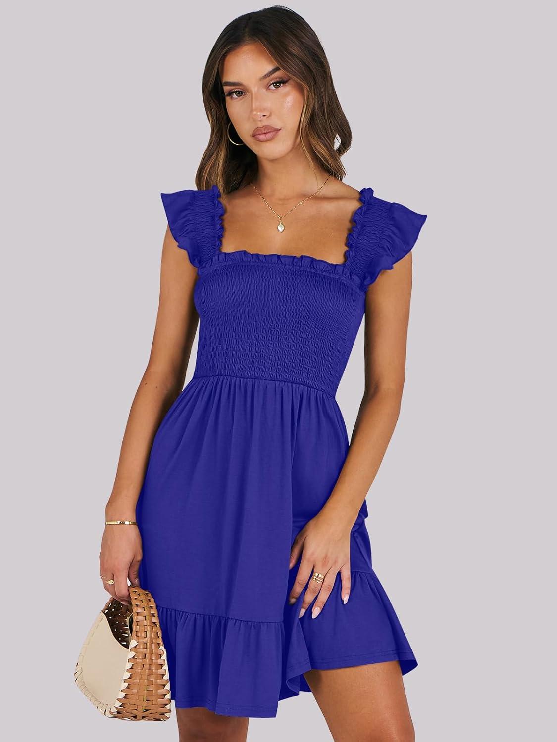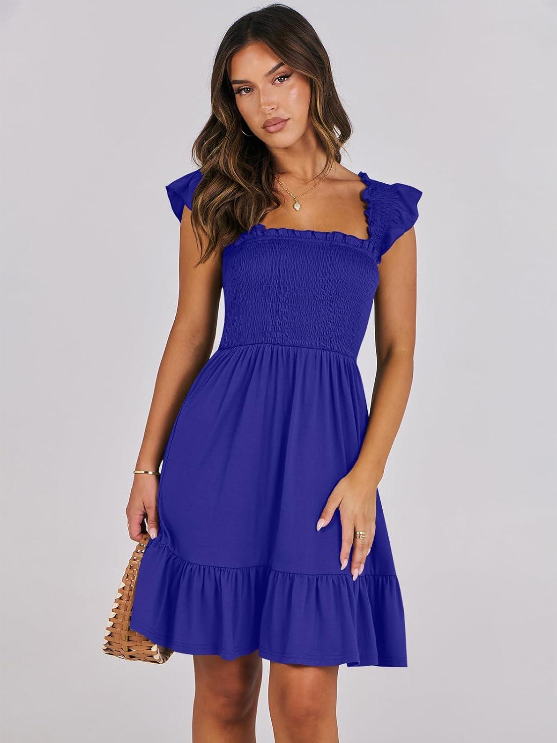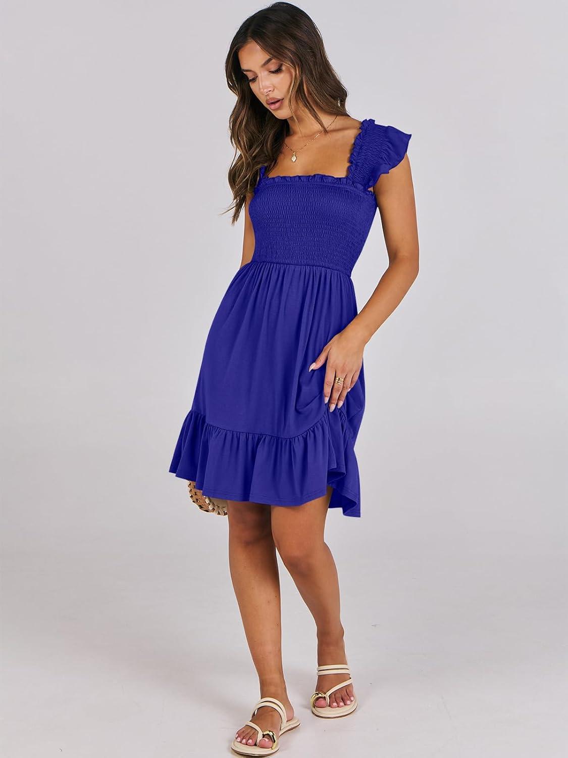 ANRABESS Women’s Summer Casual Sleeveless Square Neck Dress 2025 Smocked Ruffle Backless Boho Beach Cute Teen Short Sundress(Royal Blue)