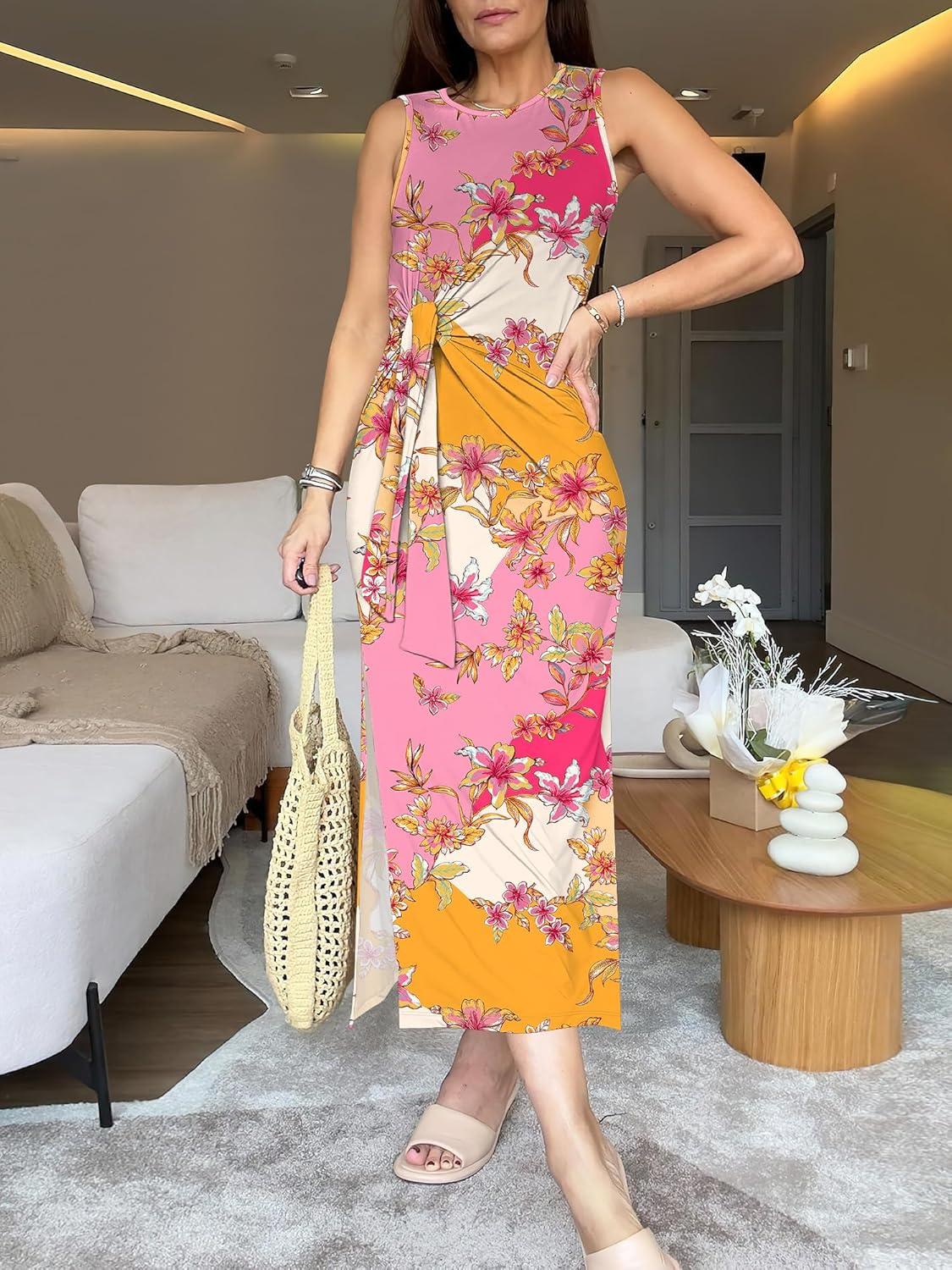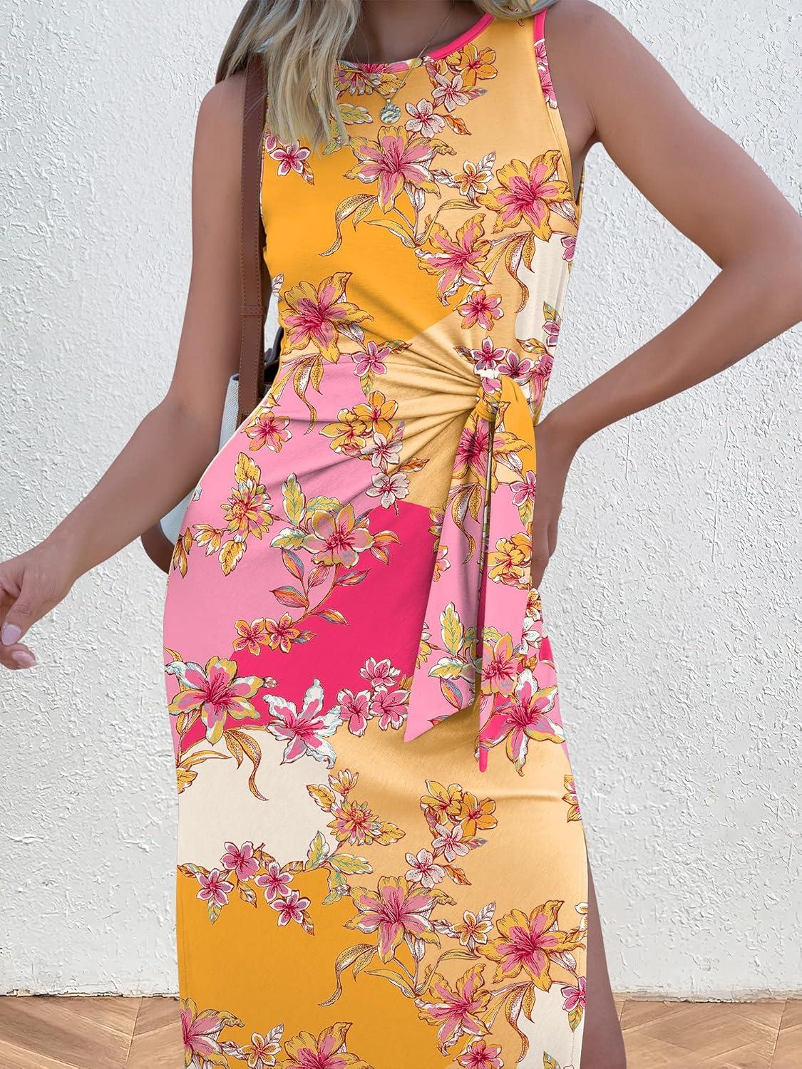 ANRABESS Womens Summer Casual Sleeveless T Shirt Midi Dress Slim Fit Tie Waist Split Tank Long Dresses 2025 Vacation Sundress(Pink Yellow Floral)
