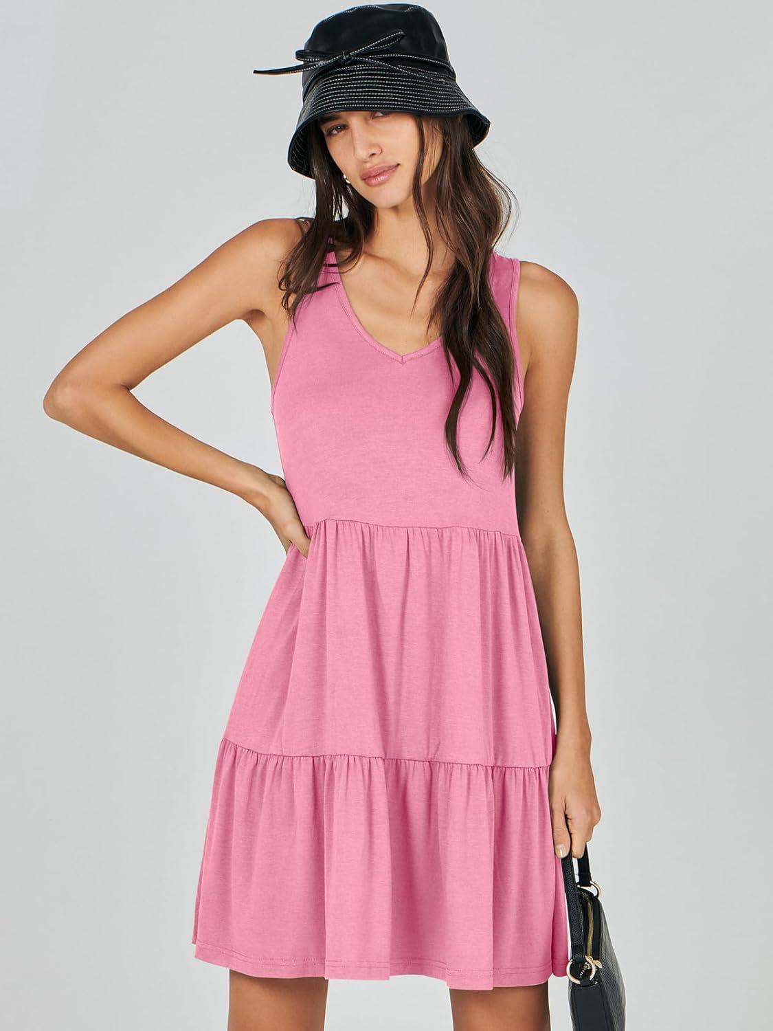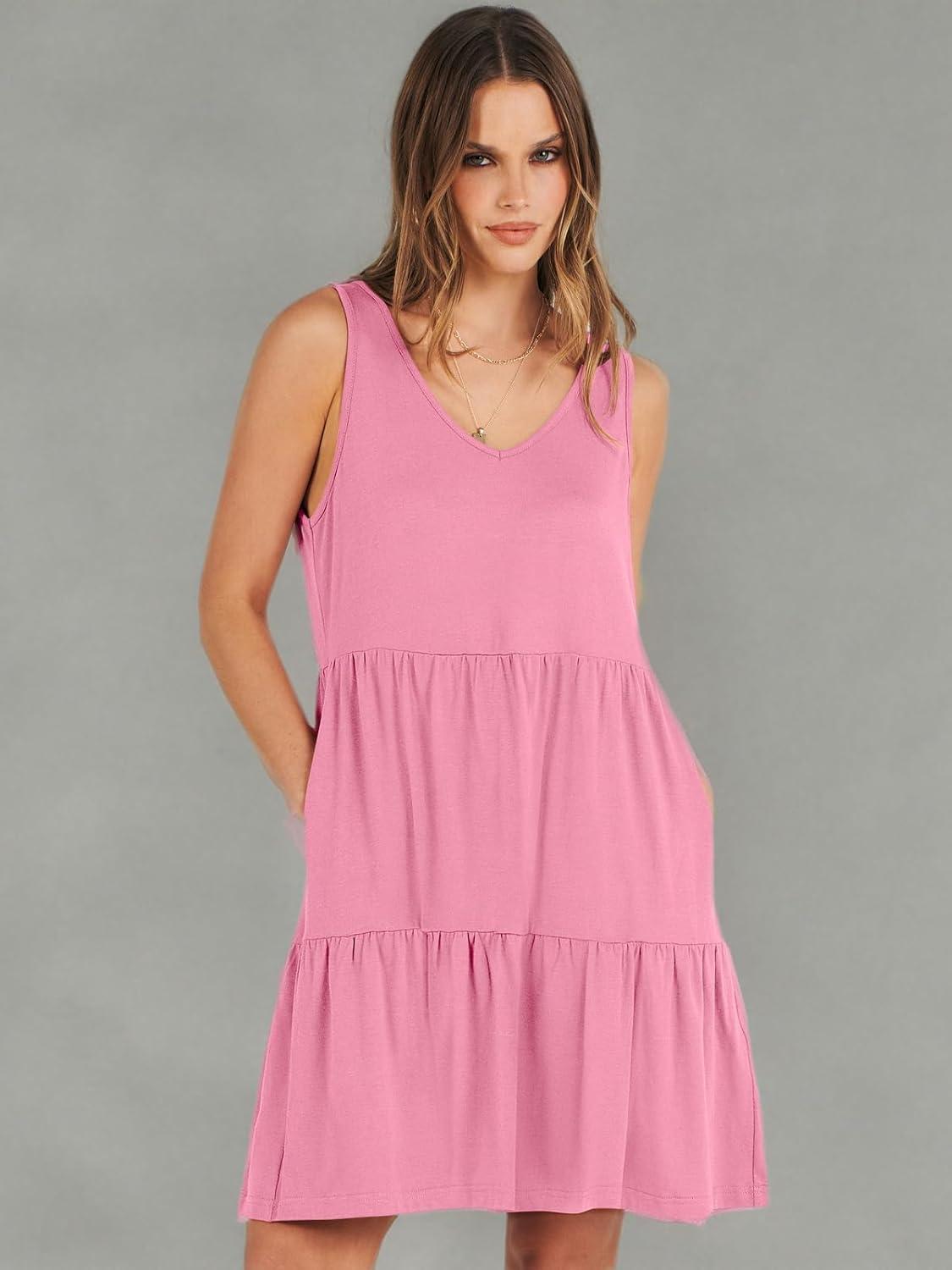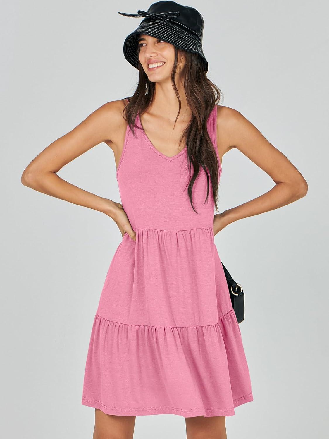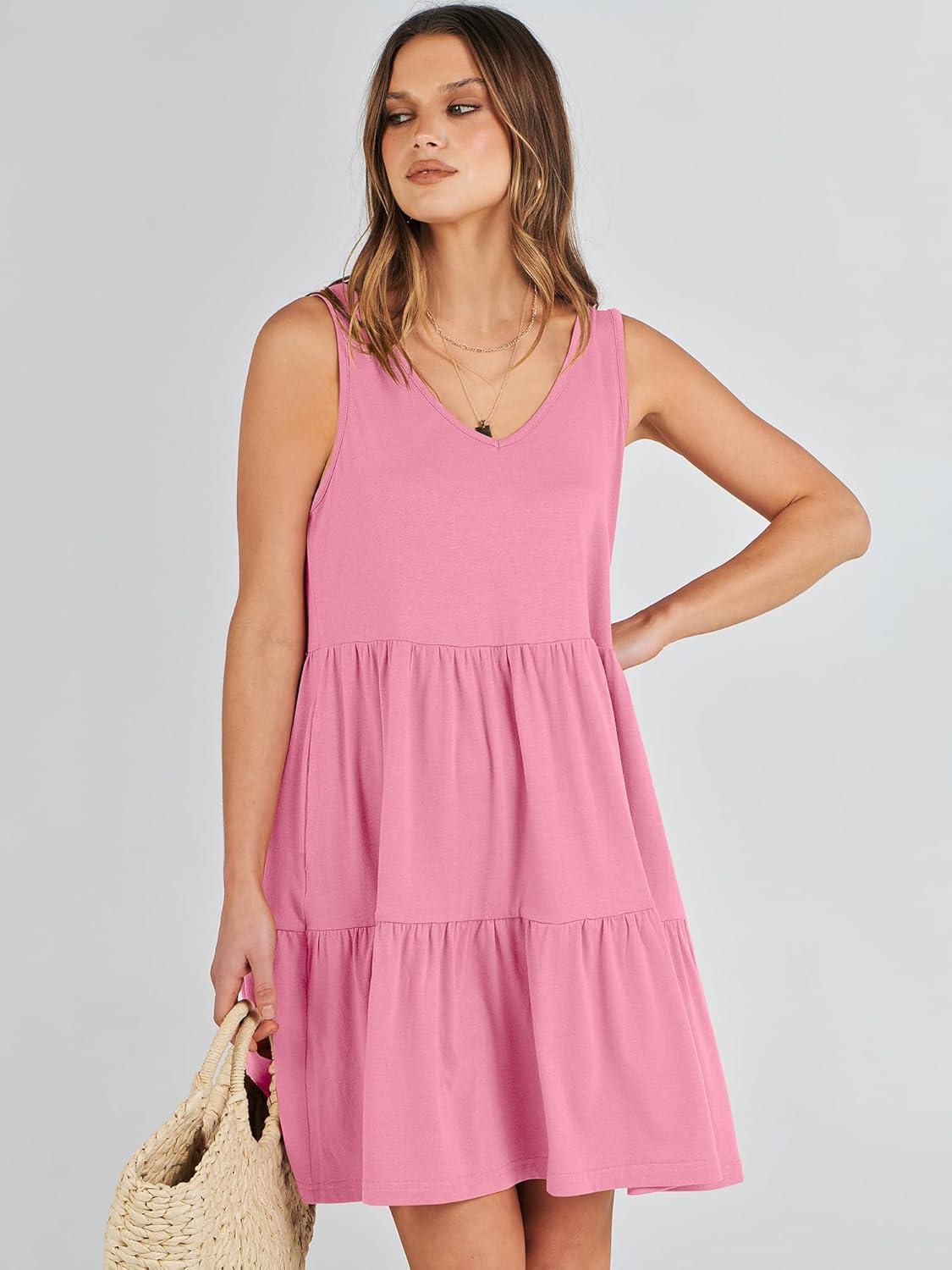 ANRABESS Womens Summer Casual Tank Dress Sleeveless V Neck T Shirt Sundress Flowy Tiered Swing Mini Beach Vacation Dresses(Pink)