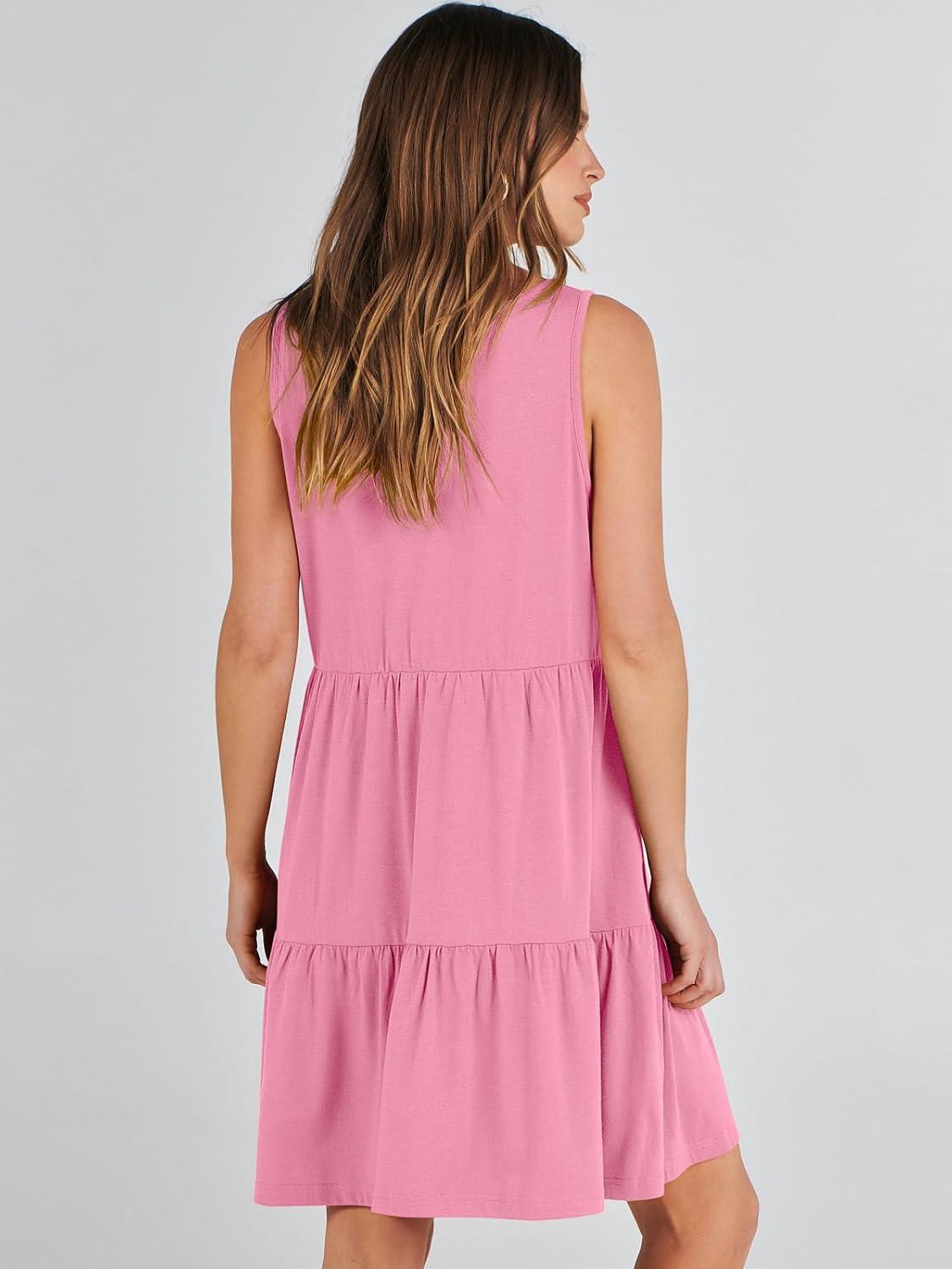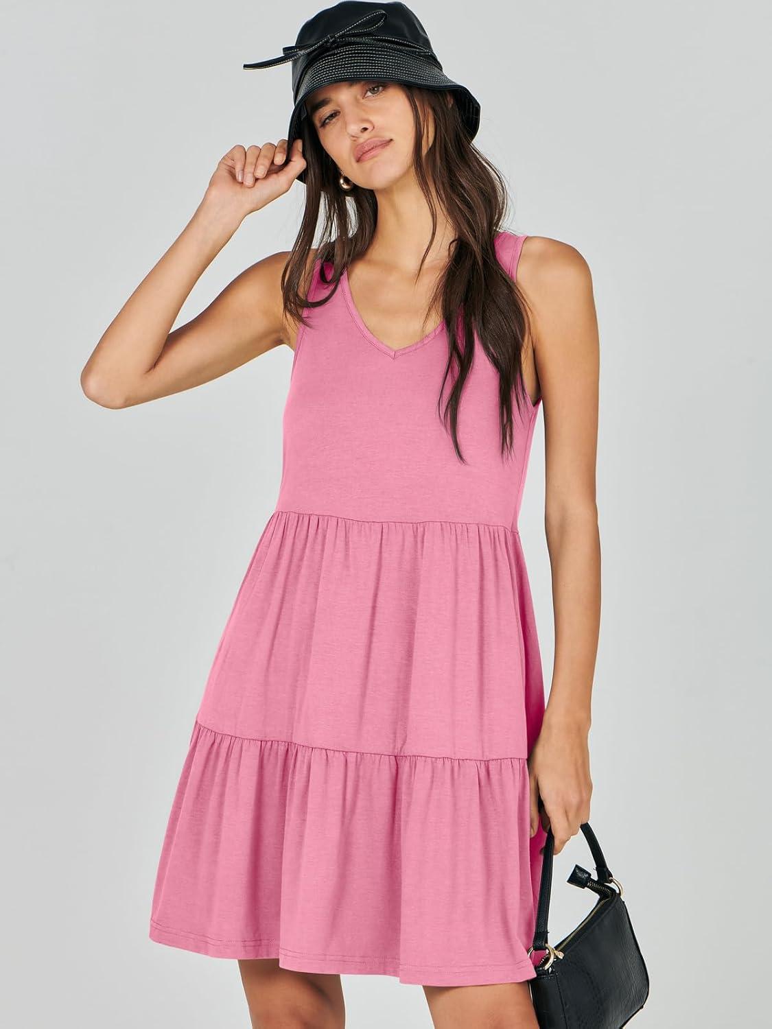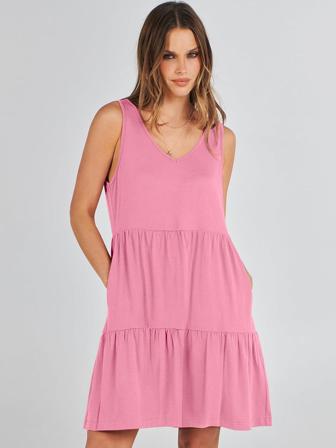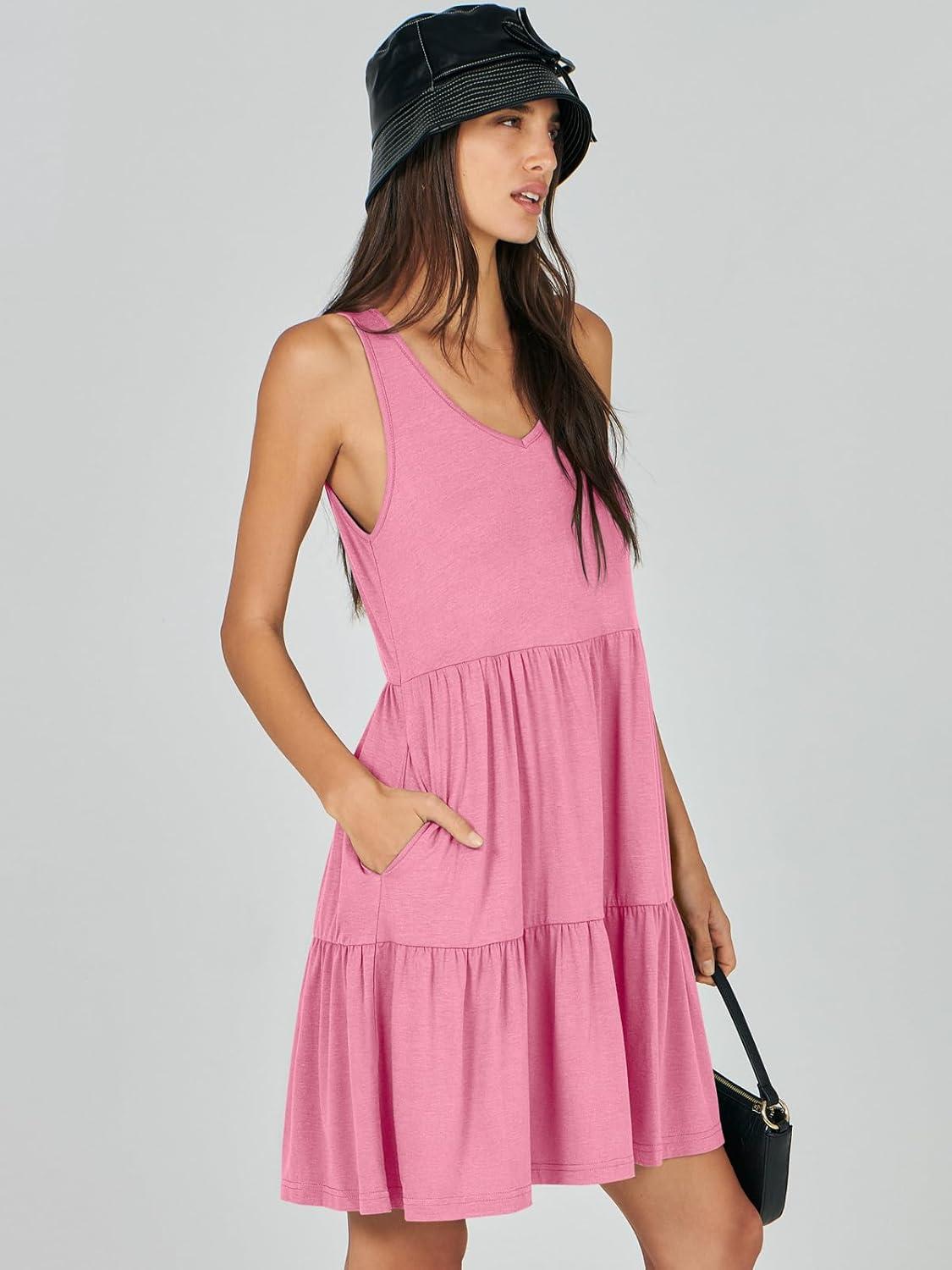 ANRABESS Womens Summer Casual Tank Dress Sleeveless V Neck T Shirt Sundress Flowy Tiered Swing Mini Beach Vacation Dresses(Pink)