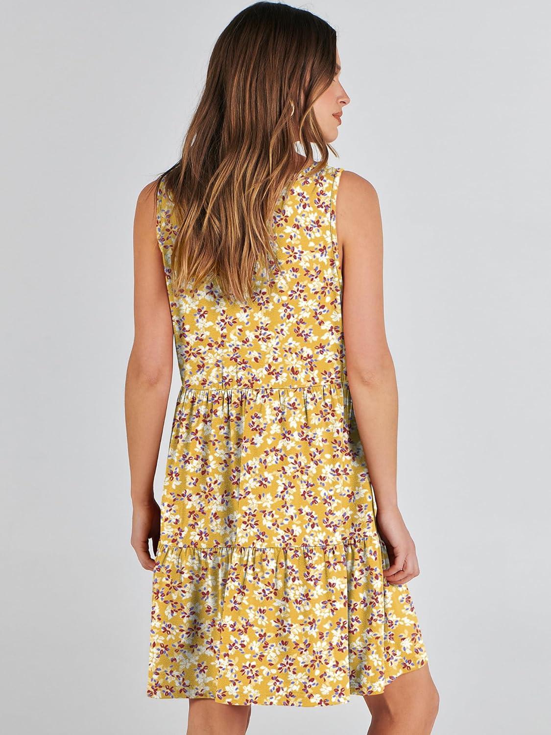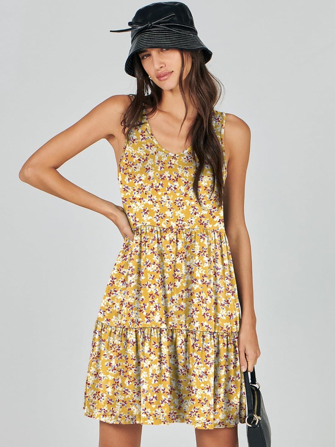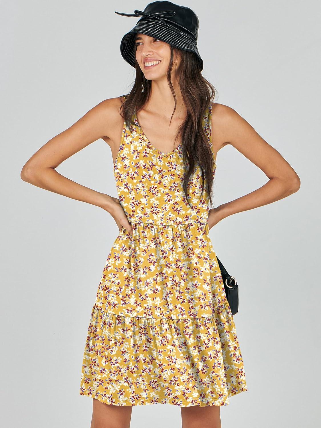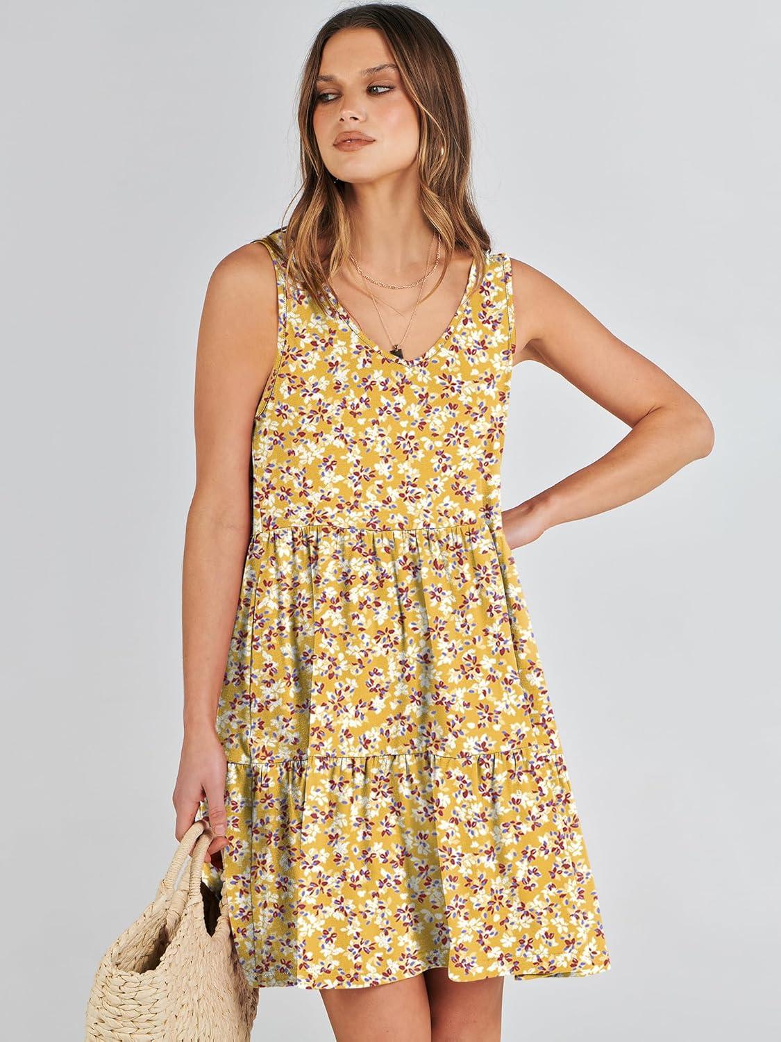 ANRABESS Womens Summer Casual Tank Dress Sleeveless V Neck T Shirt Sundress Flowy Tiered Swing Mini Beach Vacation Dresses(Yellow Floral)
