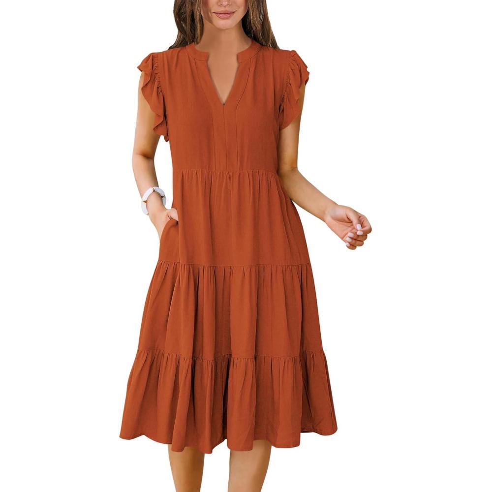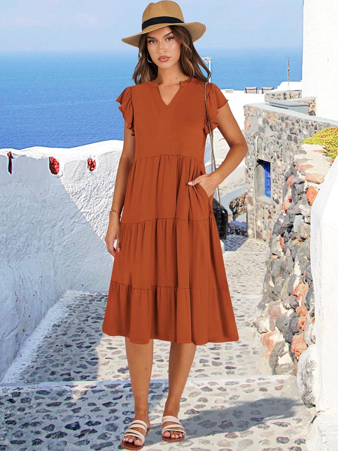 ANRABESS Womens Summer Dress Ruffle Sleeve V Neck Midi Dresses Fashion Casual Fit Flowy Tiered Boho Beach Vacation Sundress(Rust)