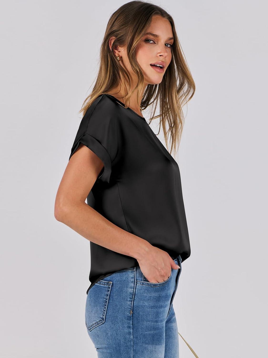 ANRABESS Women’s Summer Dressy Casual Short Sleeve Shirts Crewneck Satin 2025 Business Office Work Blouse Tops(Black)