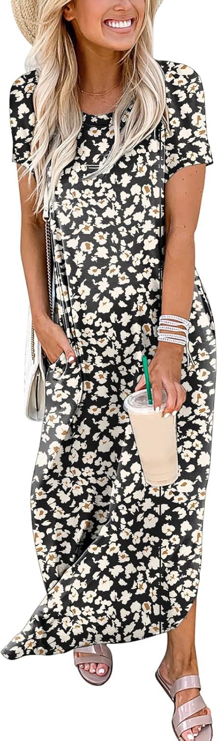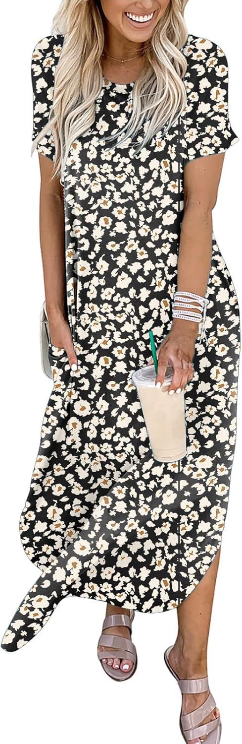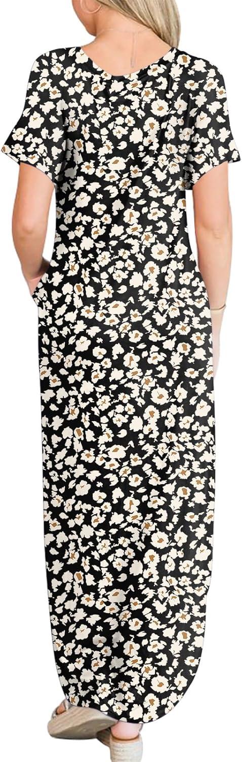 ANRABESS Womens Summer Maxi Dress Short Sleeve Casual Loose Long T Shirt Dresses Split Vacation Beach Sundress Travel Outfits(Floral Black)