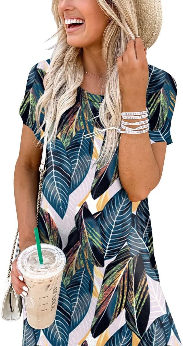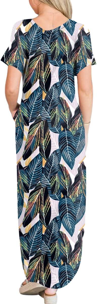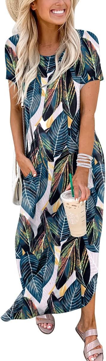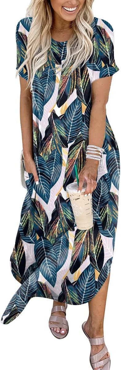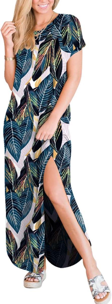 ANRABESS Womens Summer Maxi Dress Short Sleeve Casual Loose Long T Shirt Dresses Split Vacation Beach Sundress Travel Outfits(Leaf Printed)