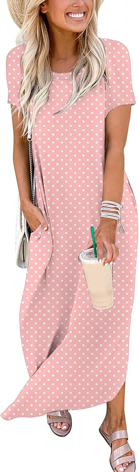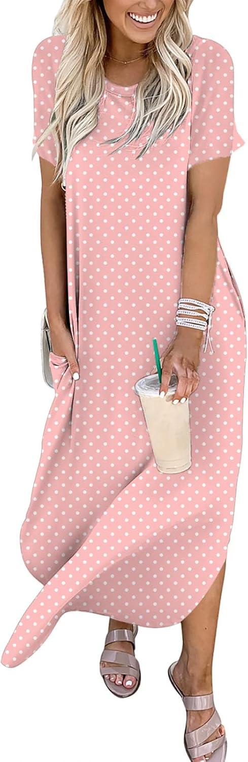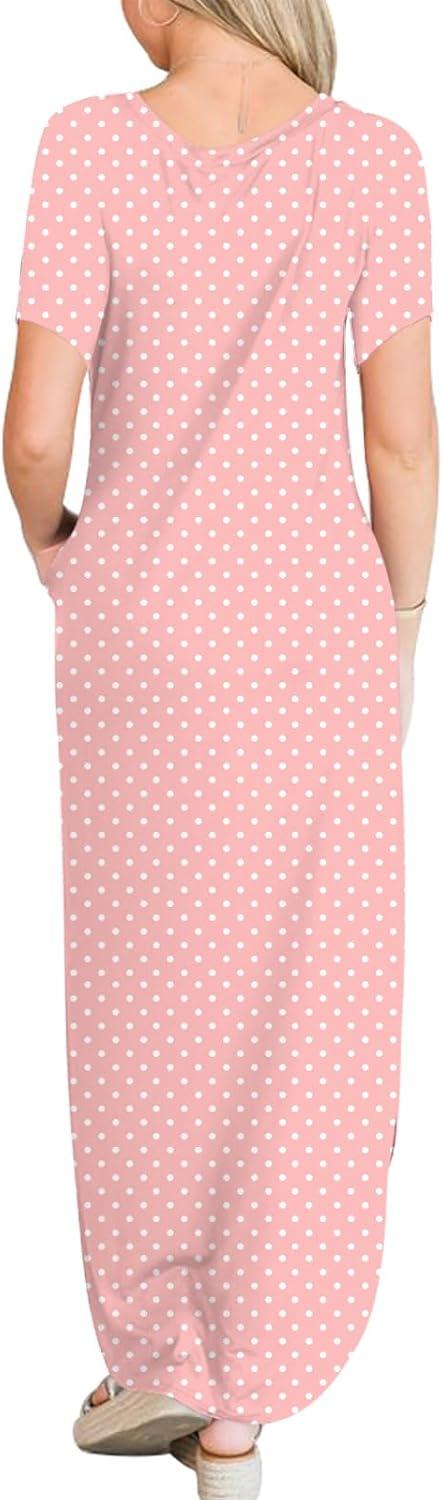 ANRABESS Womens Summer Maxi Dress Short Sleeve Casual Loose Long T Shirt Dresses Split Vacation Beach Sundress Travel Outfits(Pink White Dot)