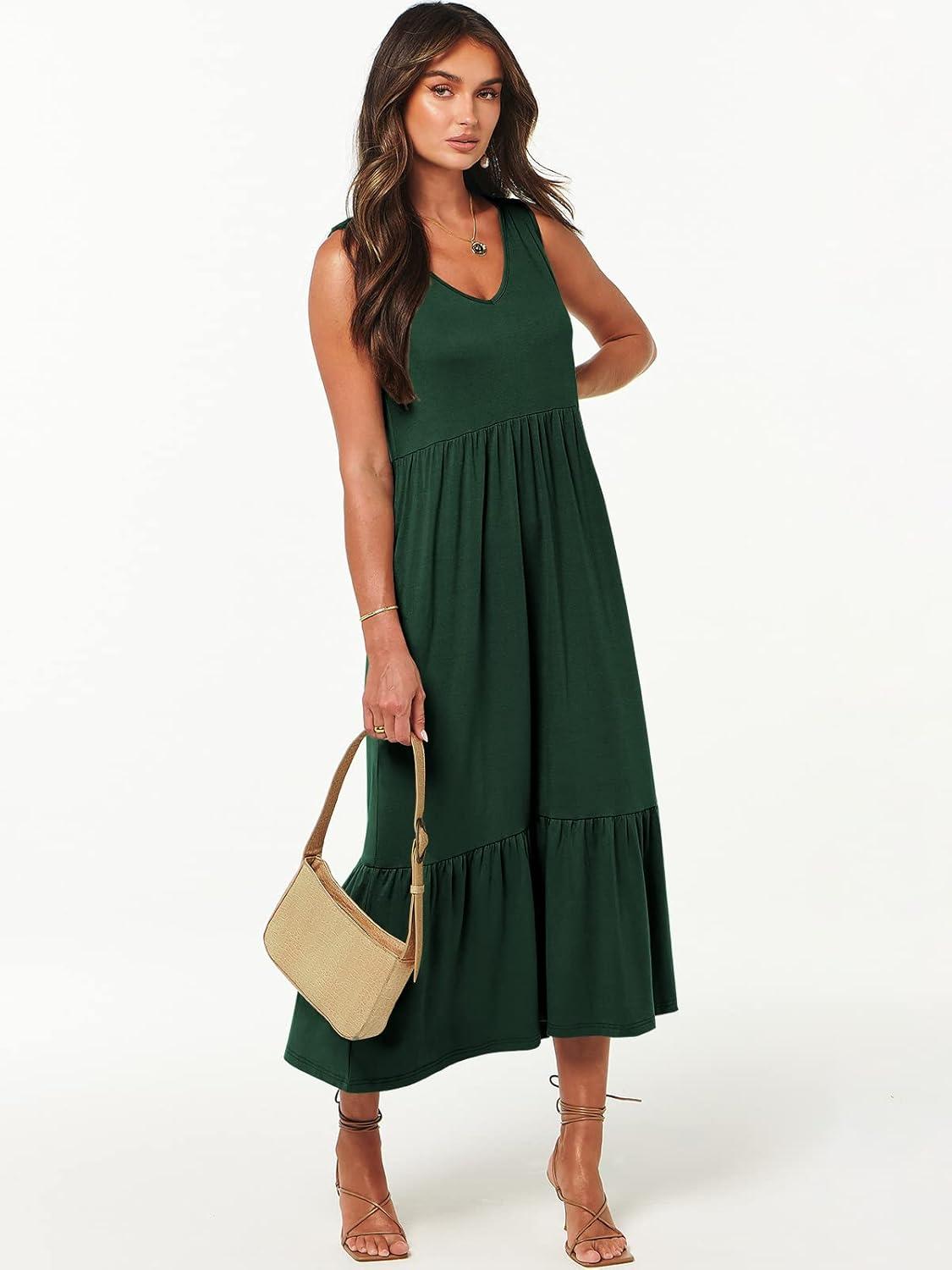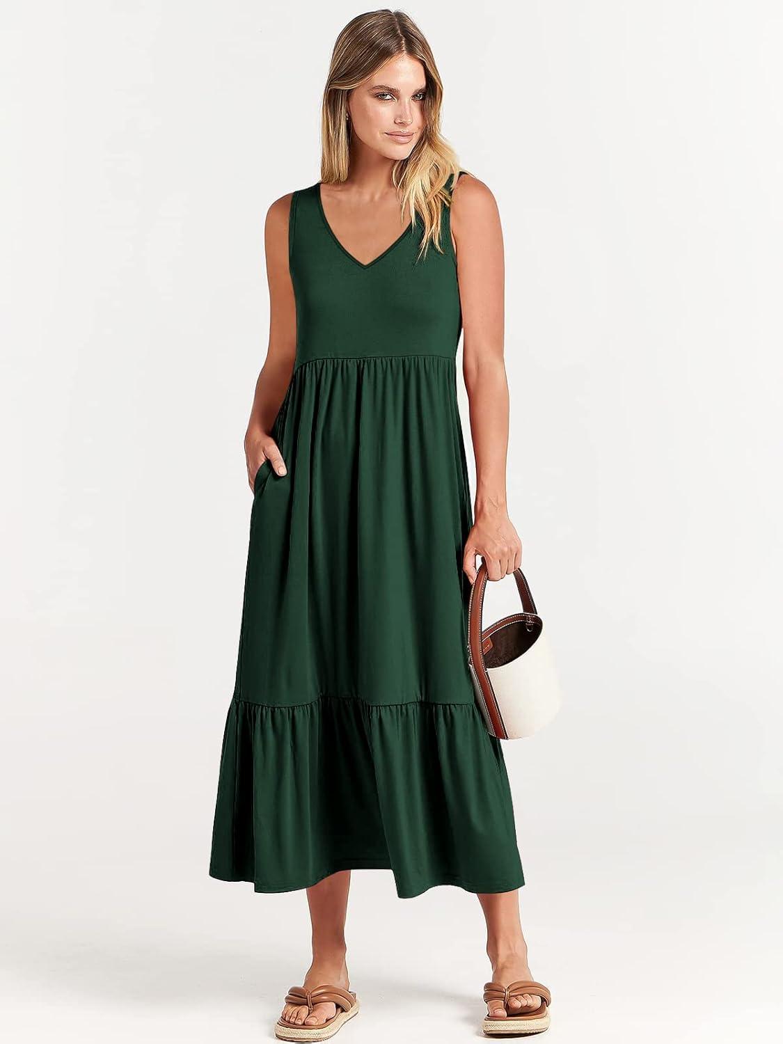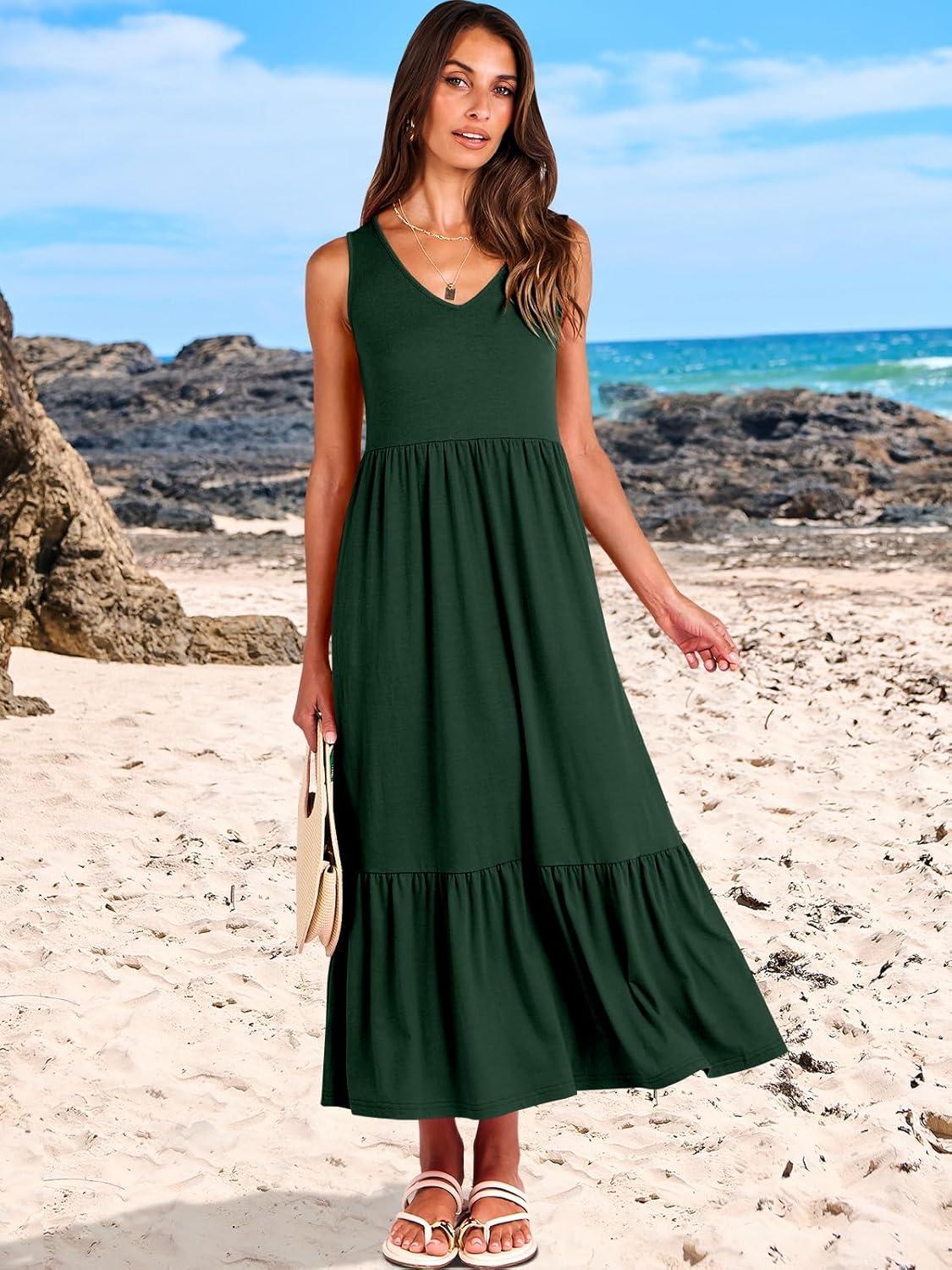 ANRABESS Womens Summer Maxi Dresses Fit & Flare Flowy V Neck Sleeveless Swing Casual Tiered Beach Sundress with Pockets(Deep Green)
