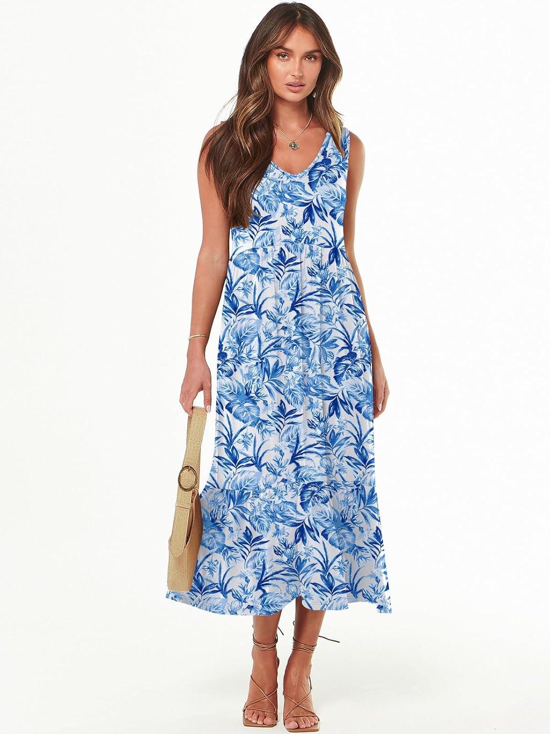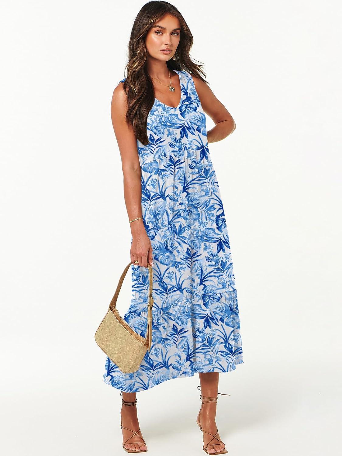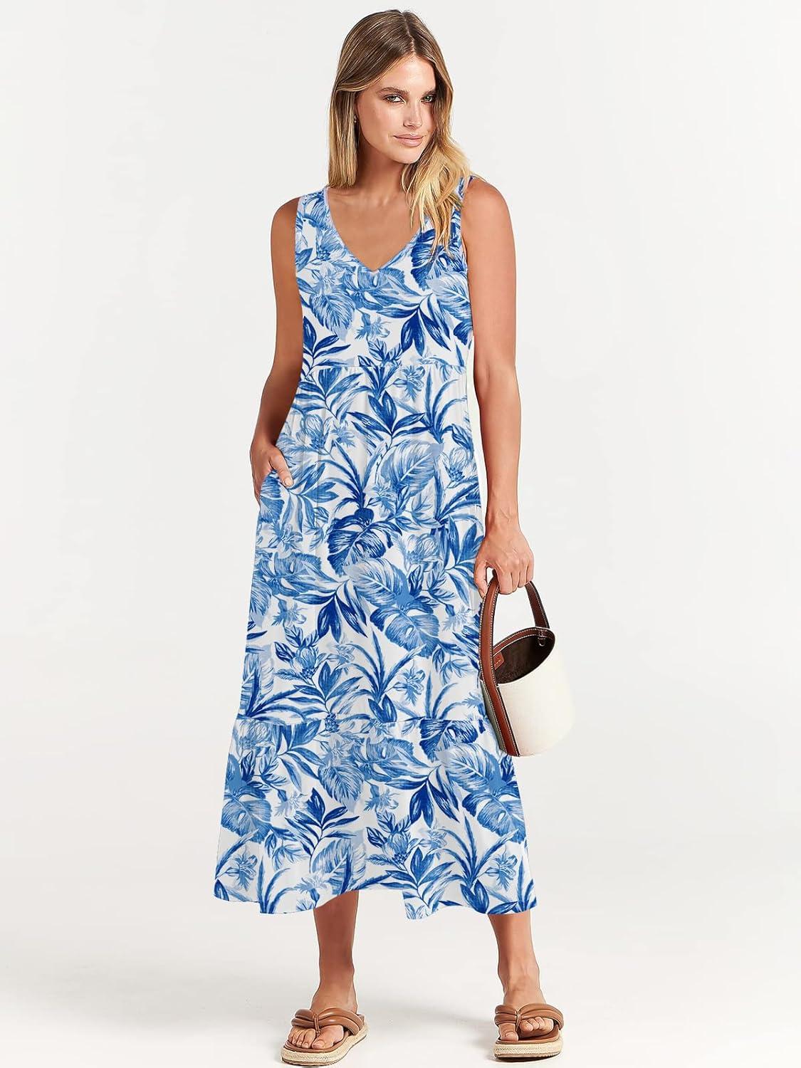 ANRABESS Womens Summer Maxi Dresses Fit & Flare Flowy V Neck Sleeveless Swing Casual Tiered Beach Sundress with Pockets(Floral Royal Blue)