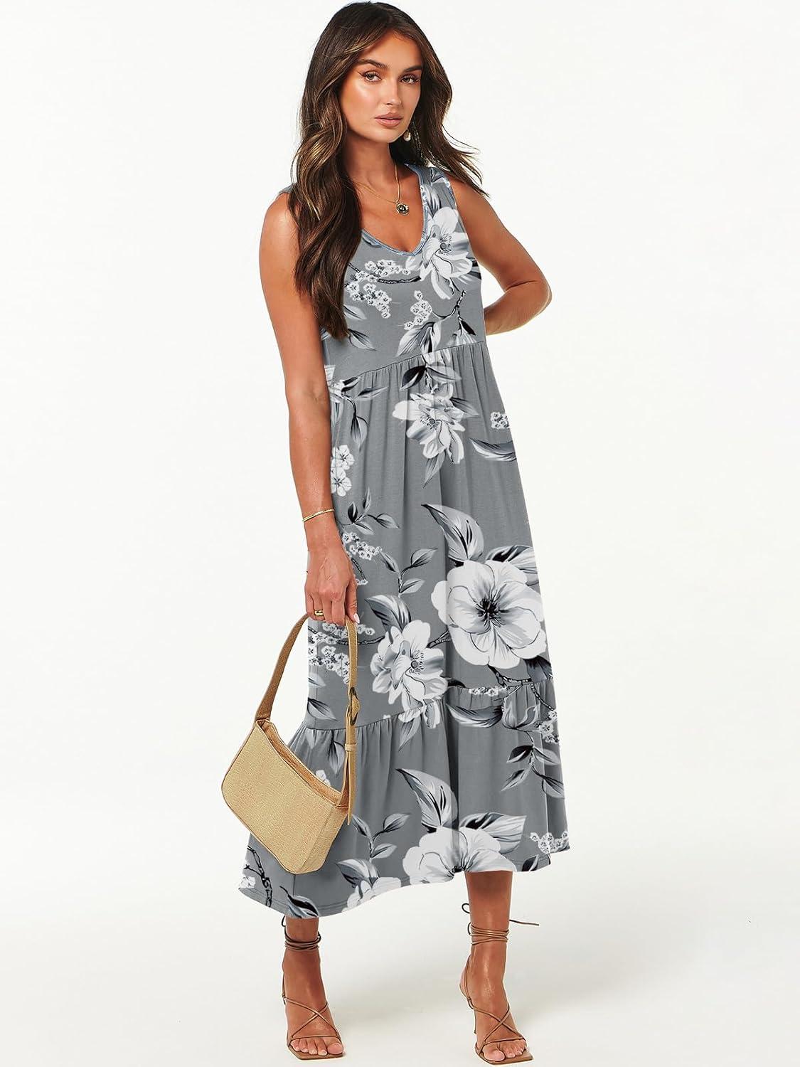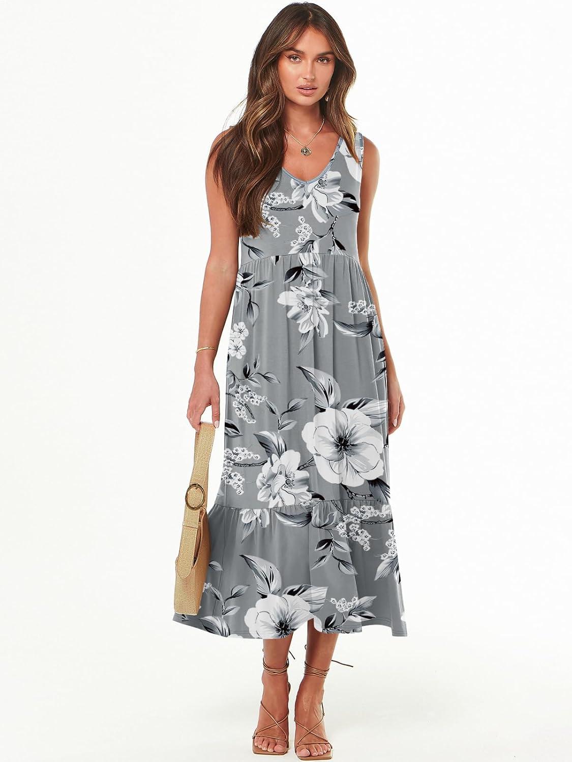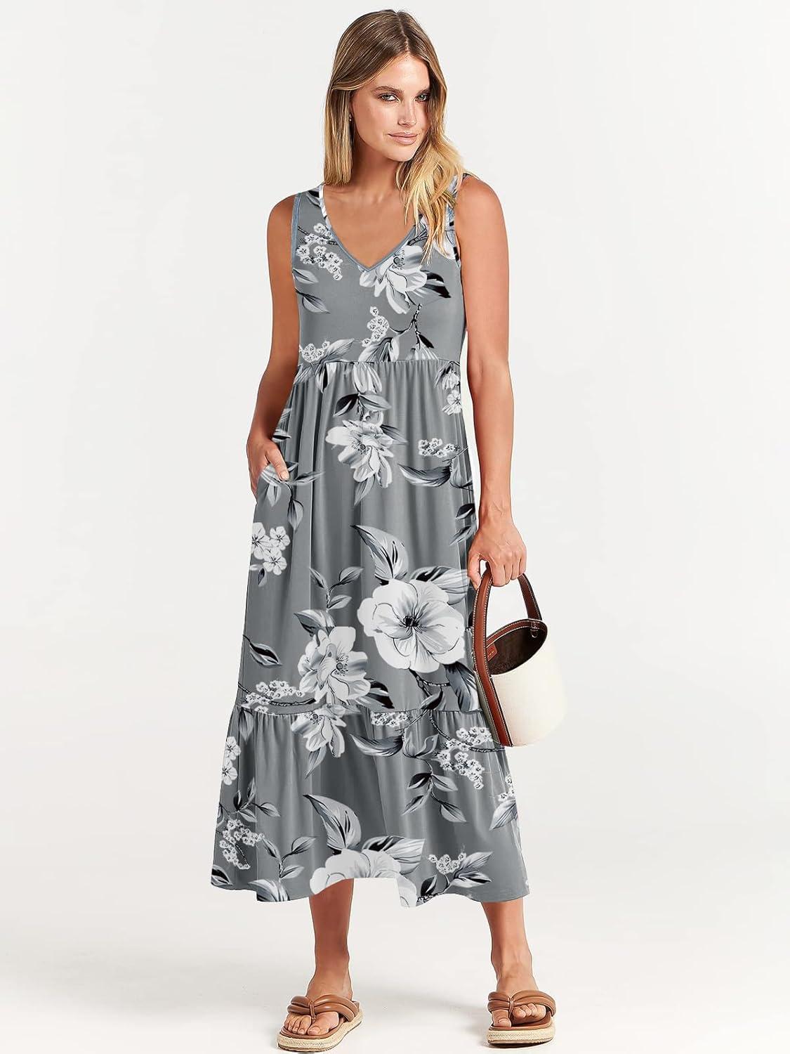 ANRABESS Womens Summer Maxi Dresses Fit & Flare Flowy V Neck Sleeveless Swing Casual Tiered Beach Sundress with Pockets(Grey With Floral White)