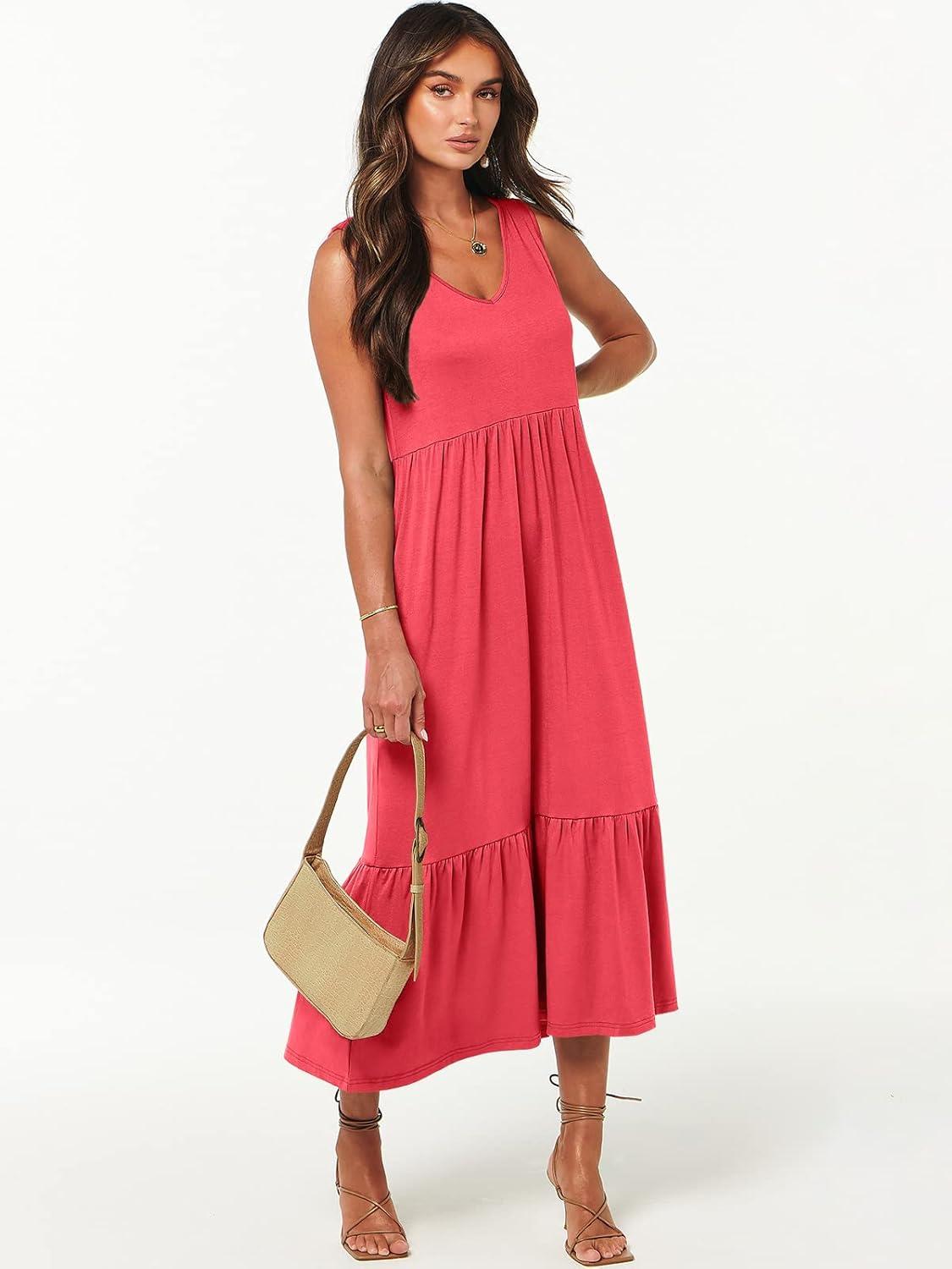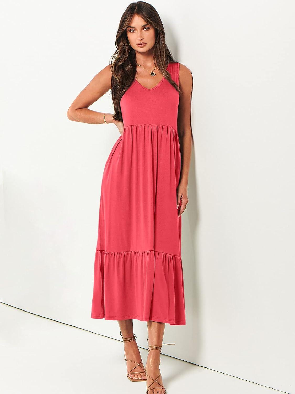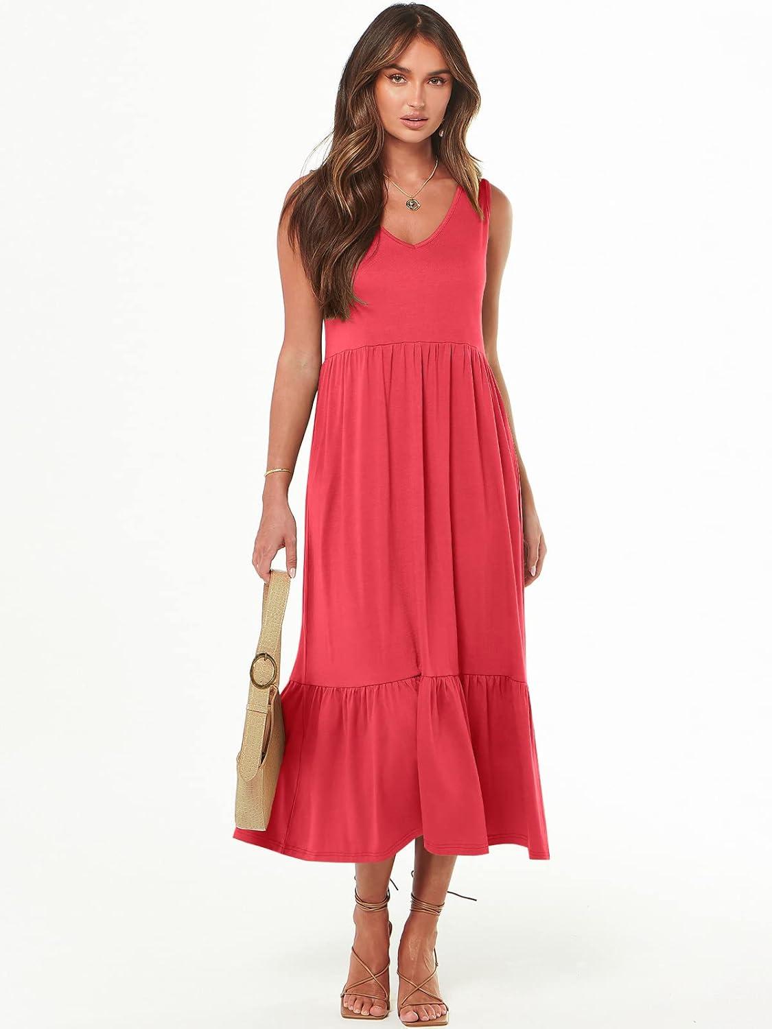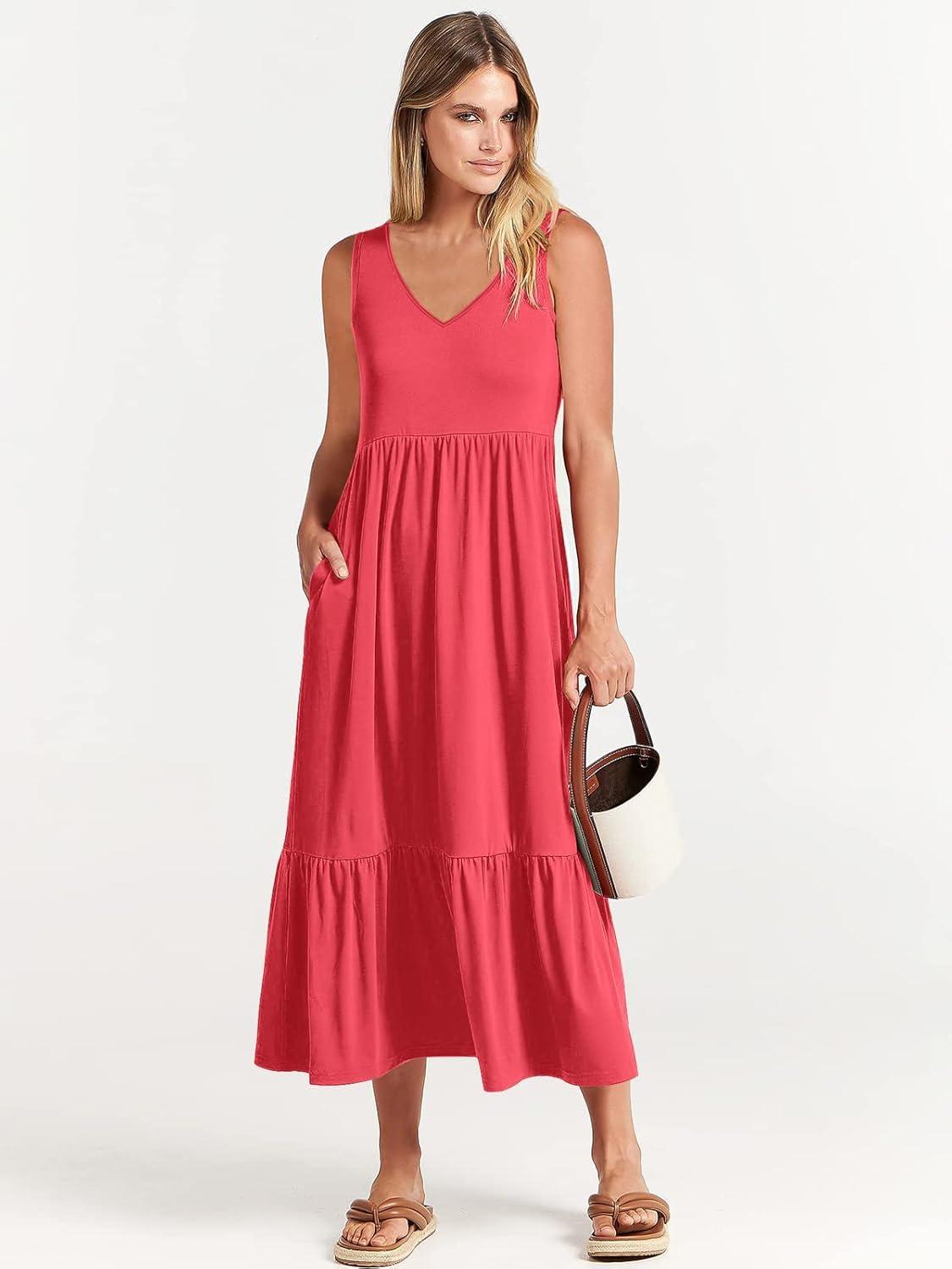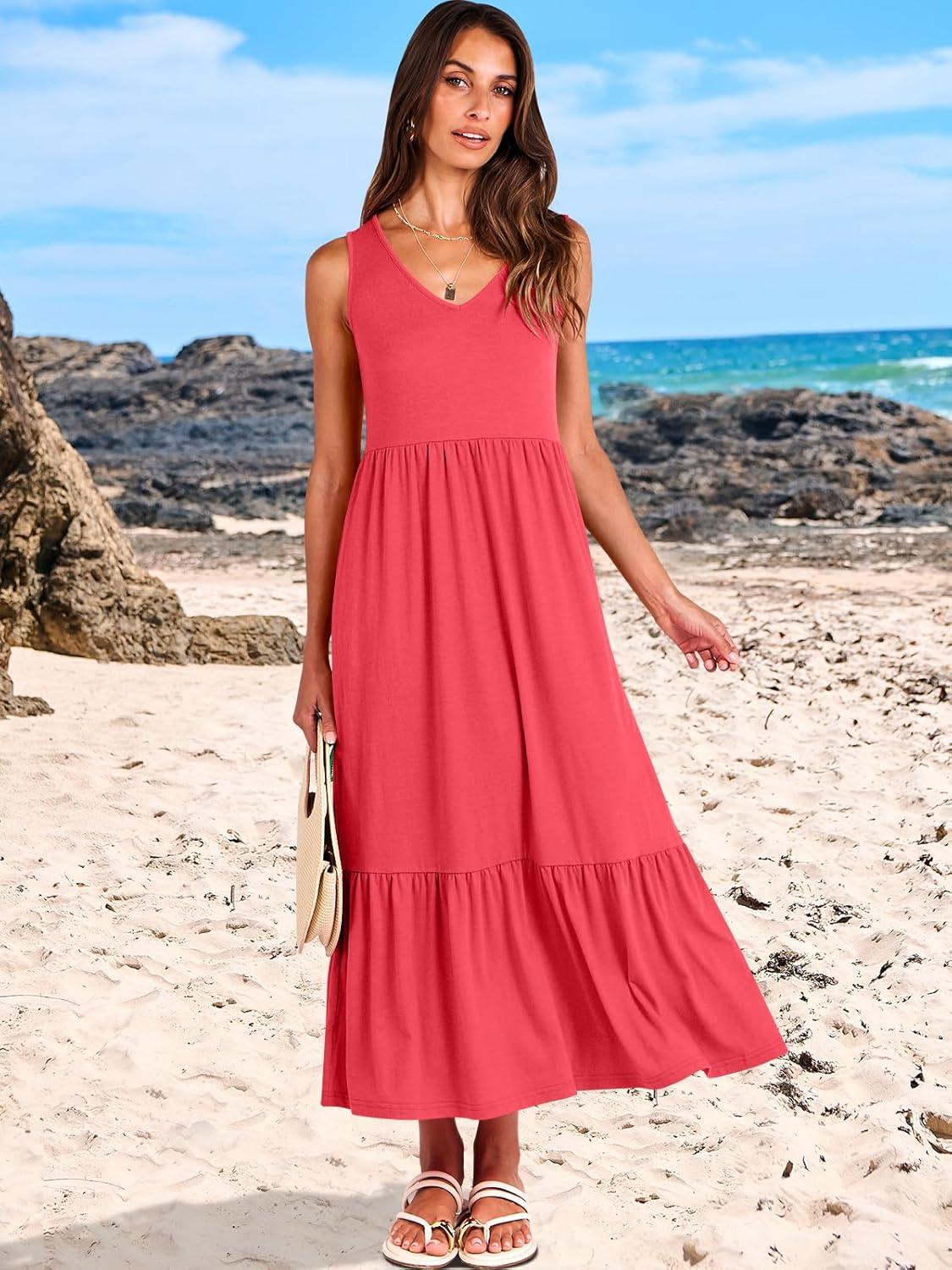 ANRABESS Womens Summer Maxi Dresses Fit & Flare Flowy V Neck Sleeveless Swing Casual Tiered Beach Sundress with Pockets(Peach)