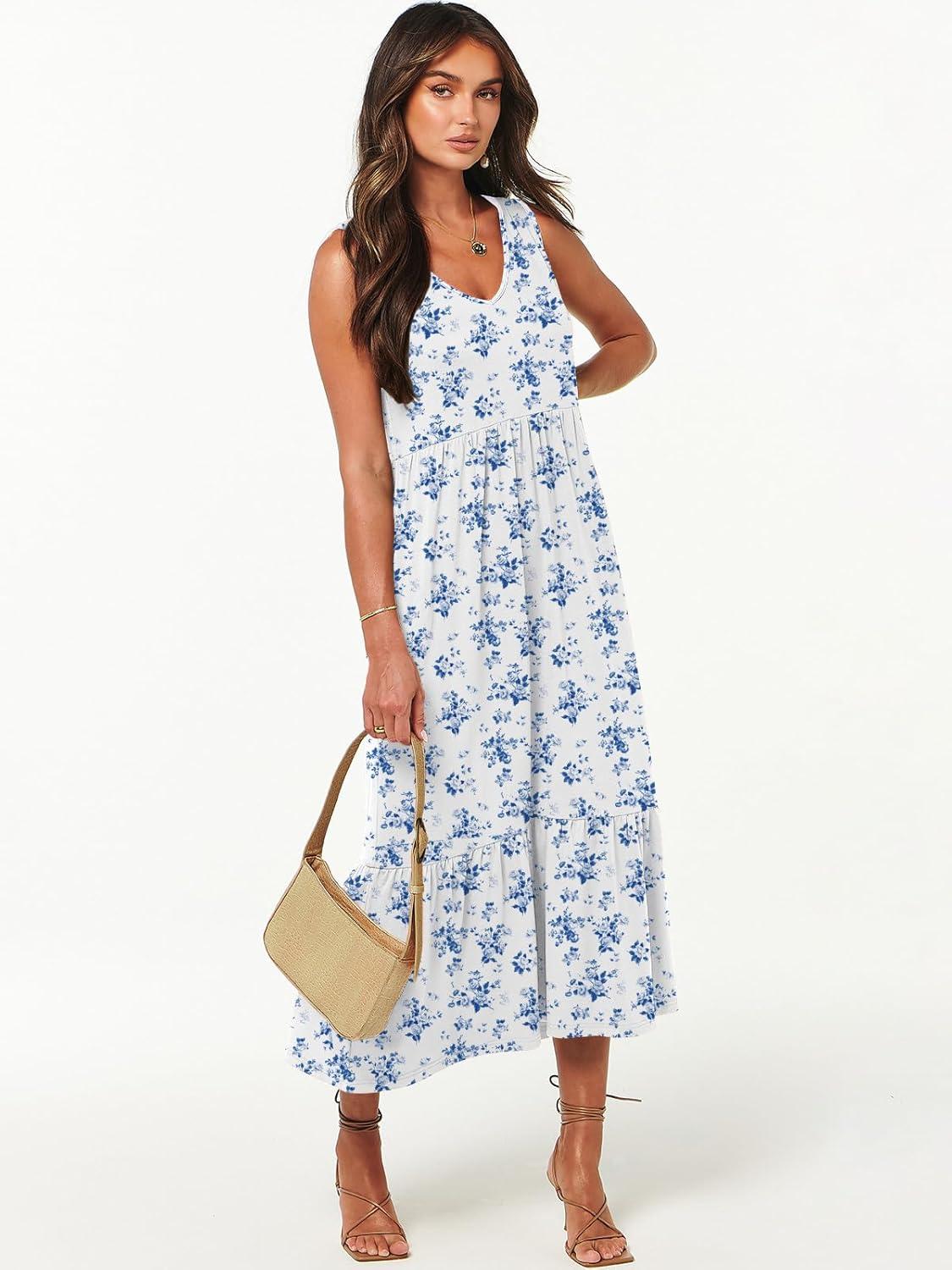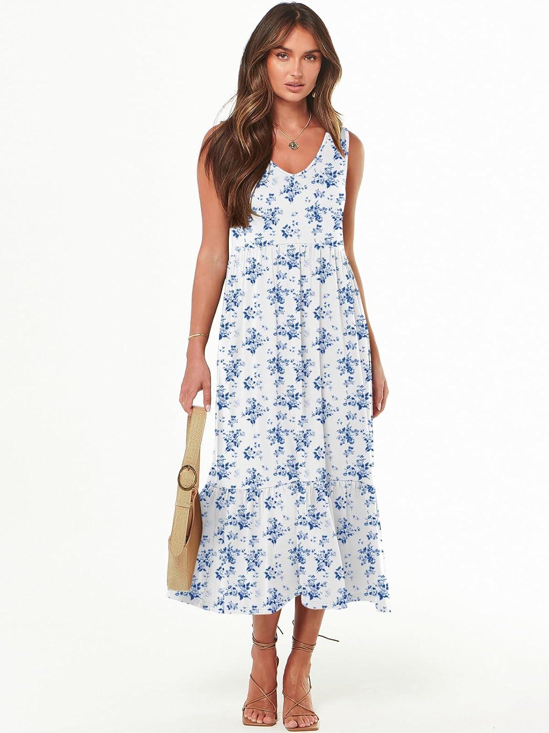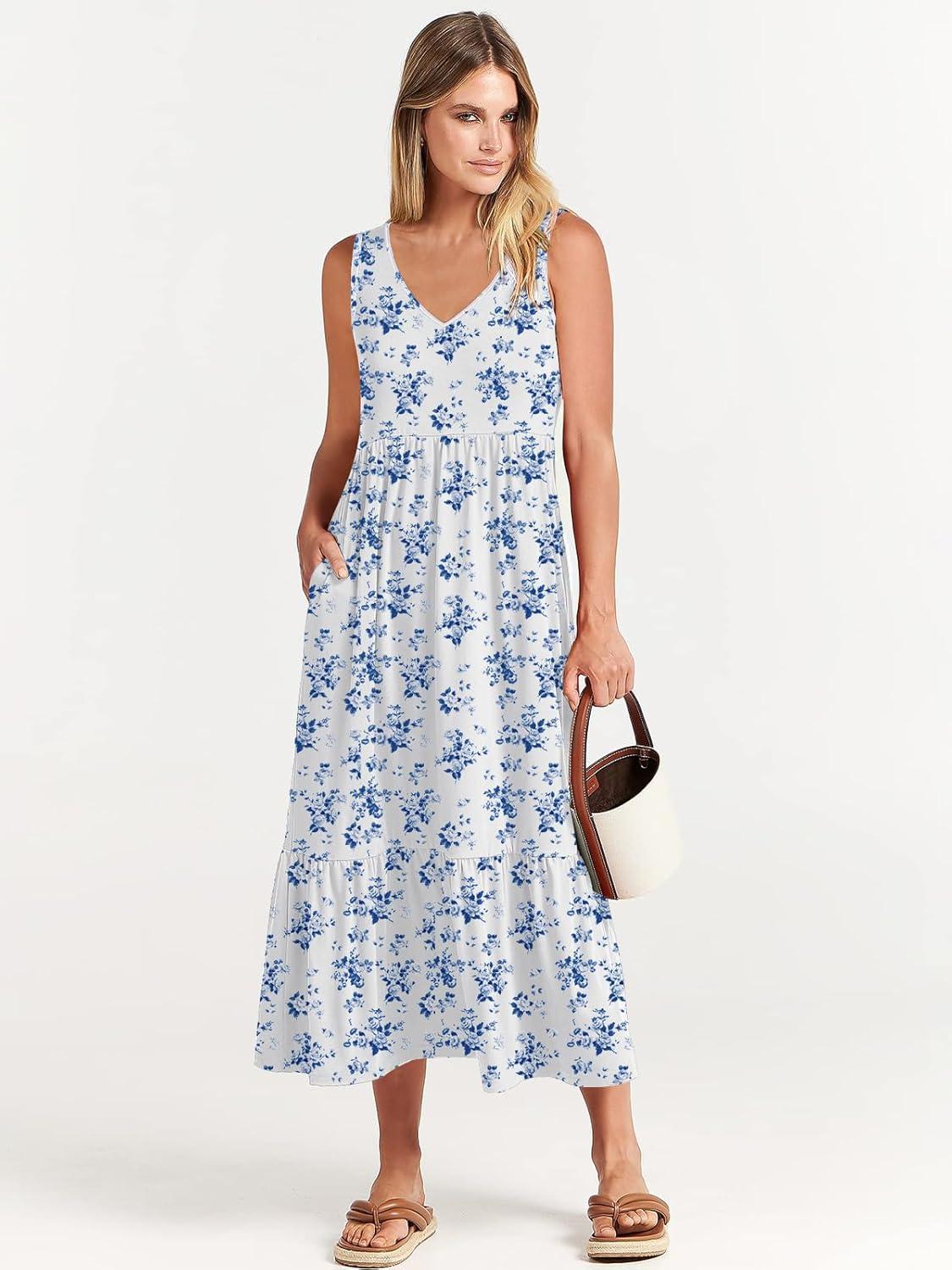 ANRABESS Womens Summer Maxi Dresses Fit & Flare Flowy V Neck Sleeveless Swing Casual Tiered Beach Sundress with Pockets(White With Floral Blue)