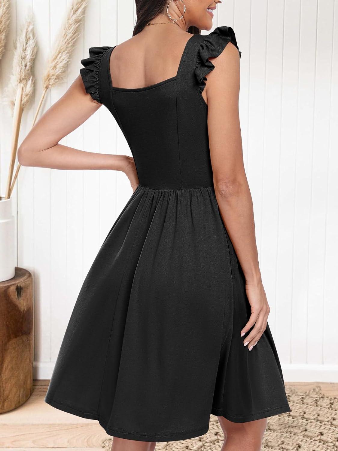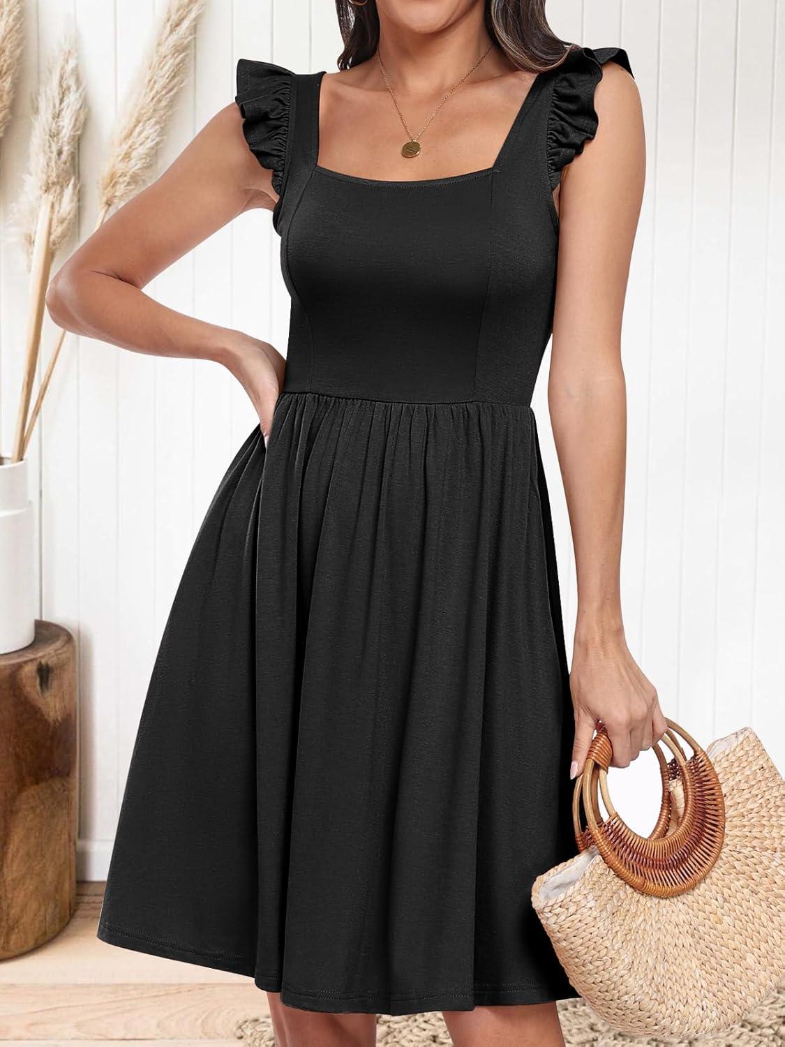 ANRABESS Womens Summer Short Dress 2025 Square Neck Sleeveless A Line Ruffled Wedding Casual Cute Teen Beach Mini Sundress(Black)