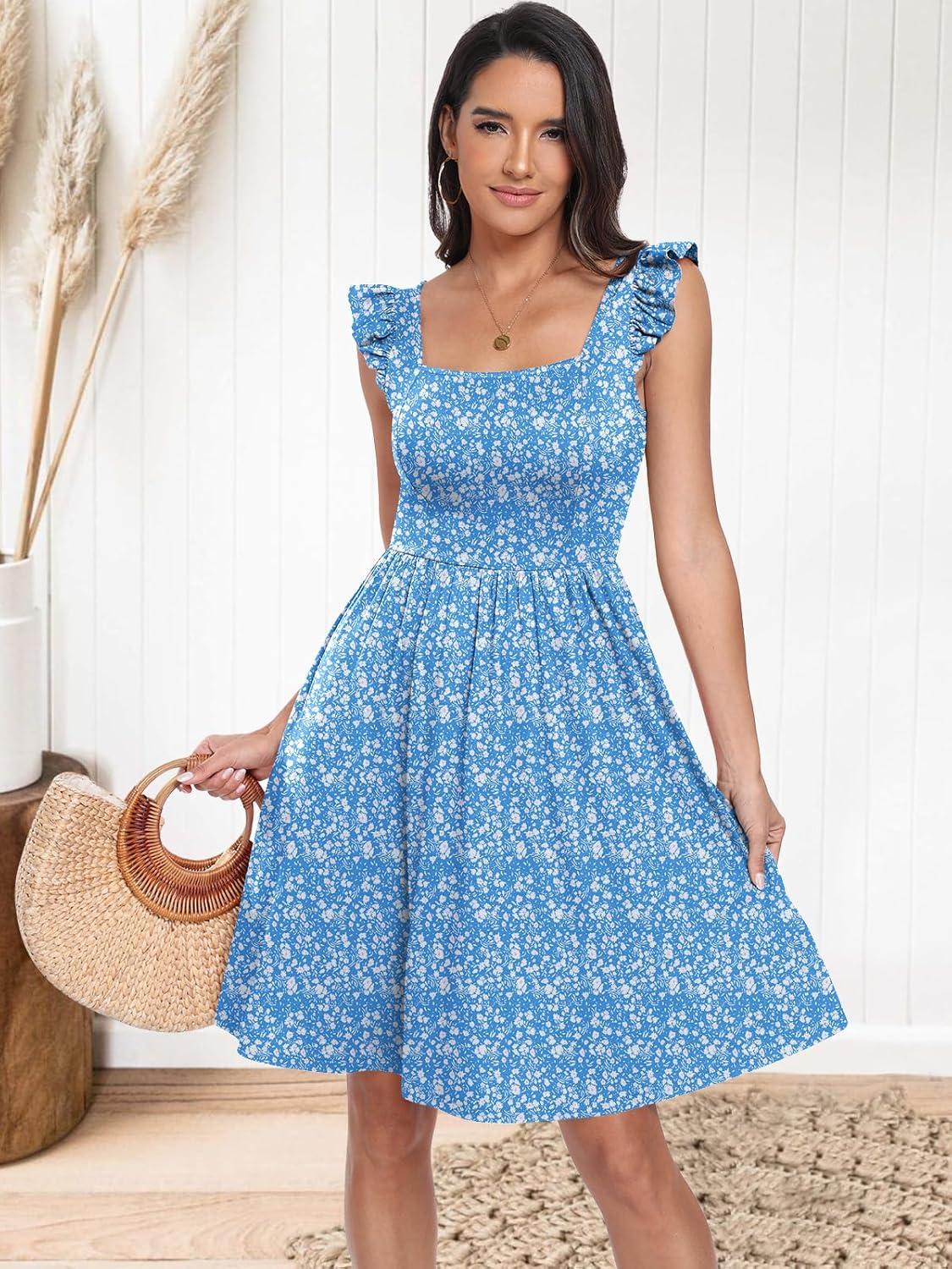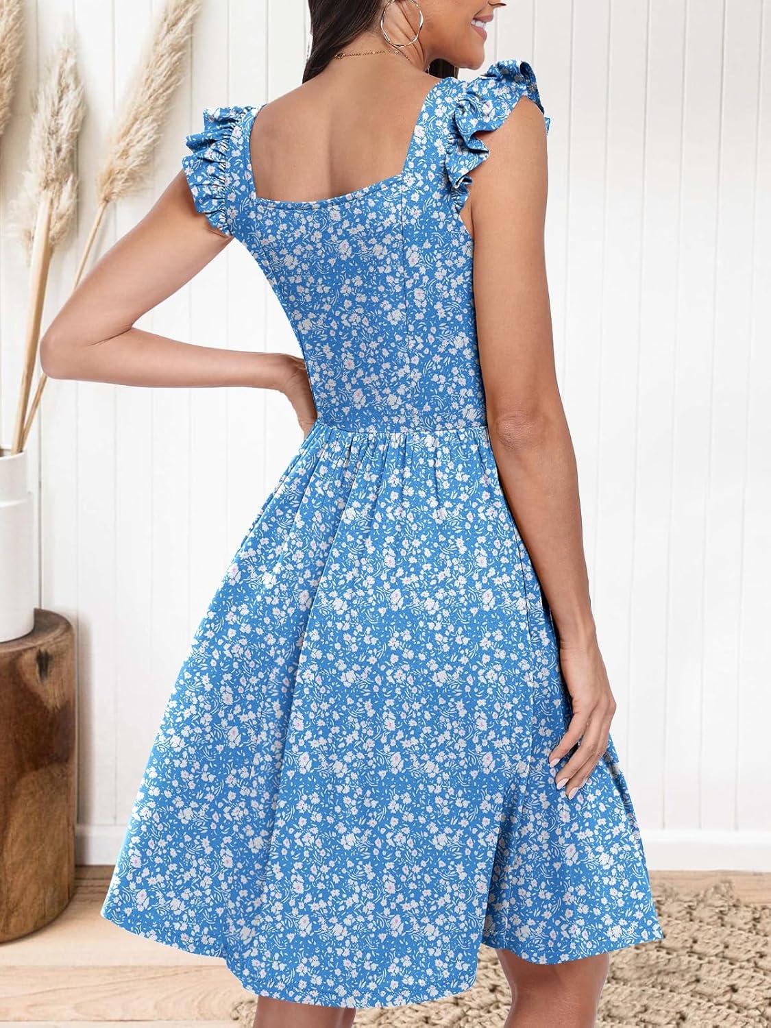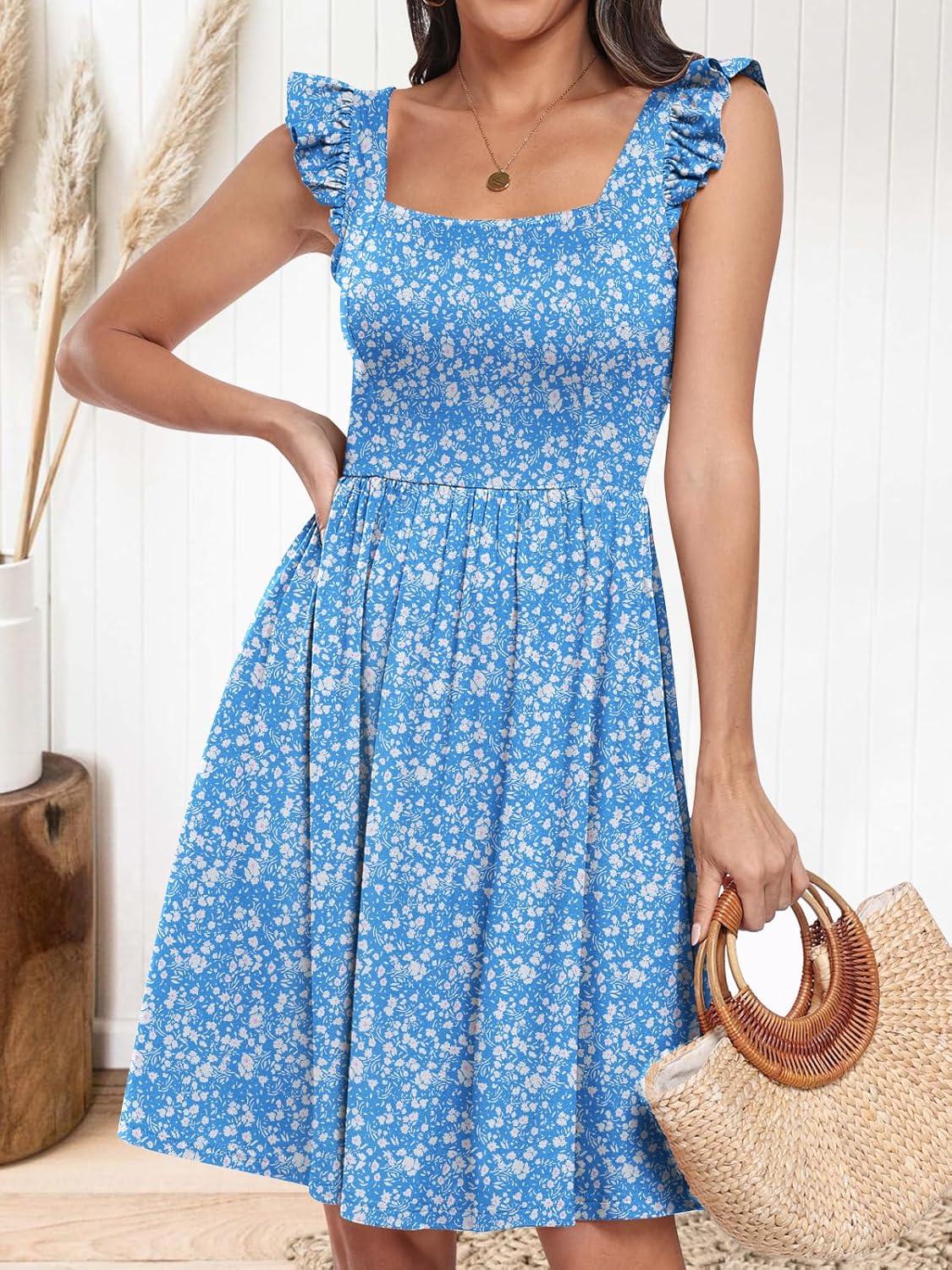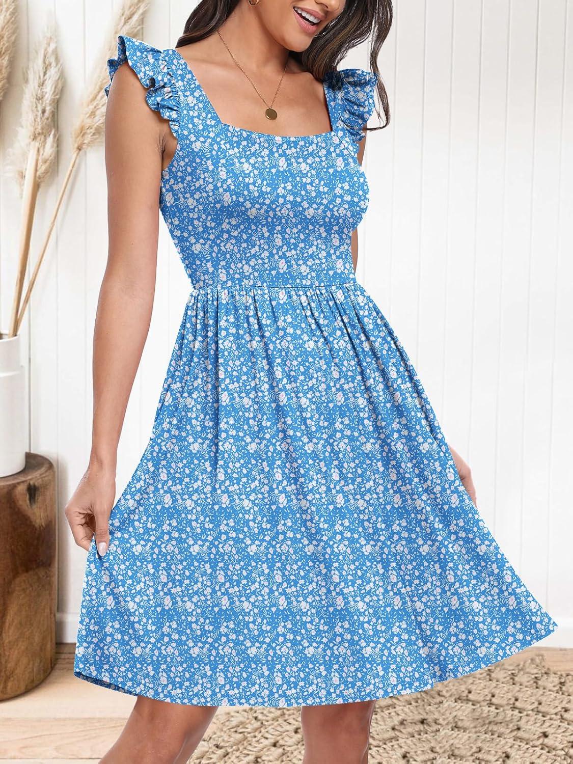 ANRABESS Womens Summer Short Dress 2025 Square Neck Sleeveless A Line Ruffled Wedding Casual Cute Teen Beach Mini Sundress(Blue Floral 01)