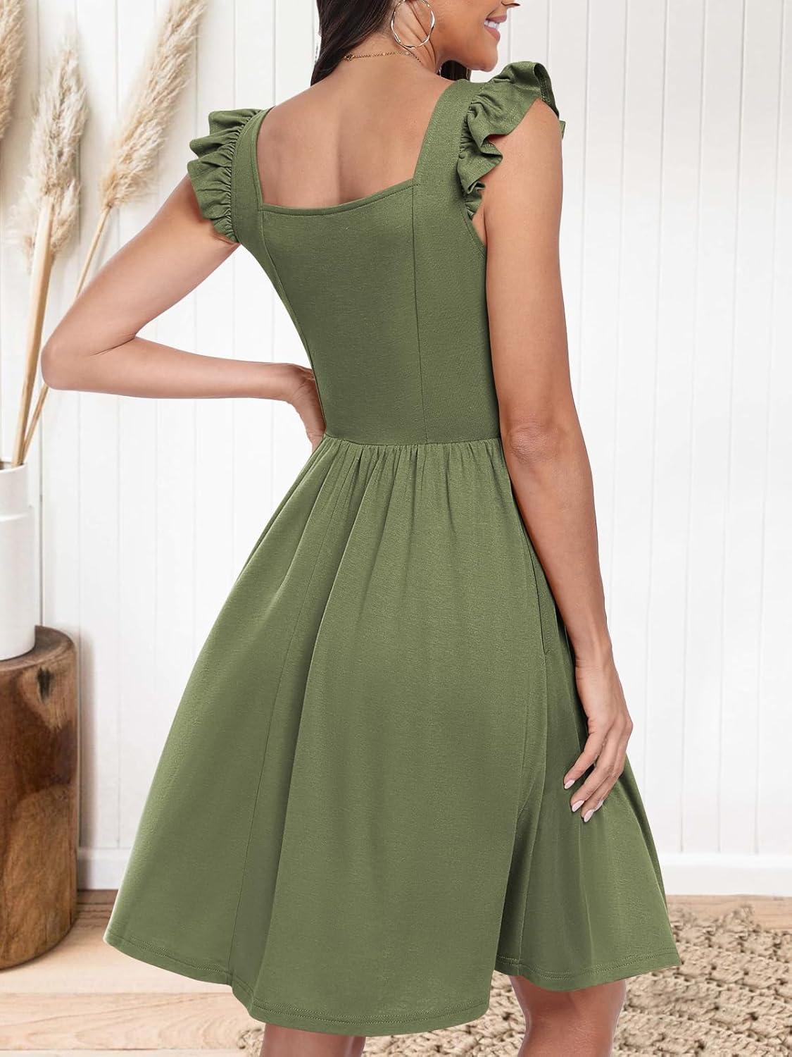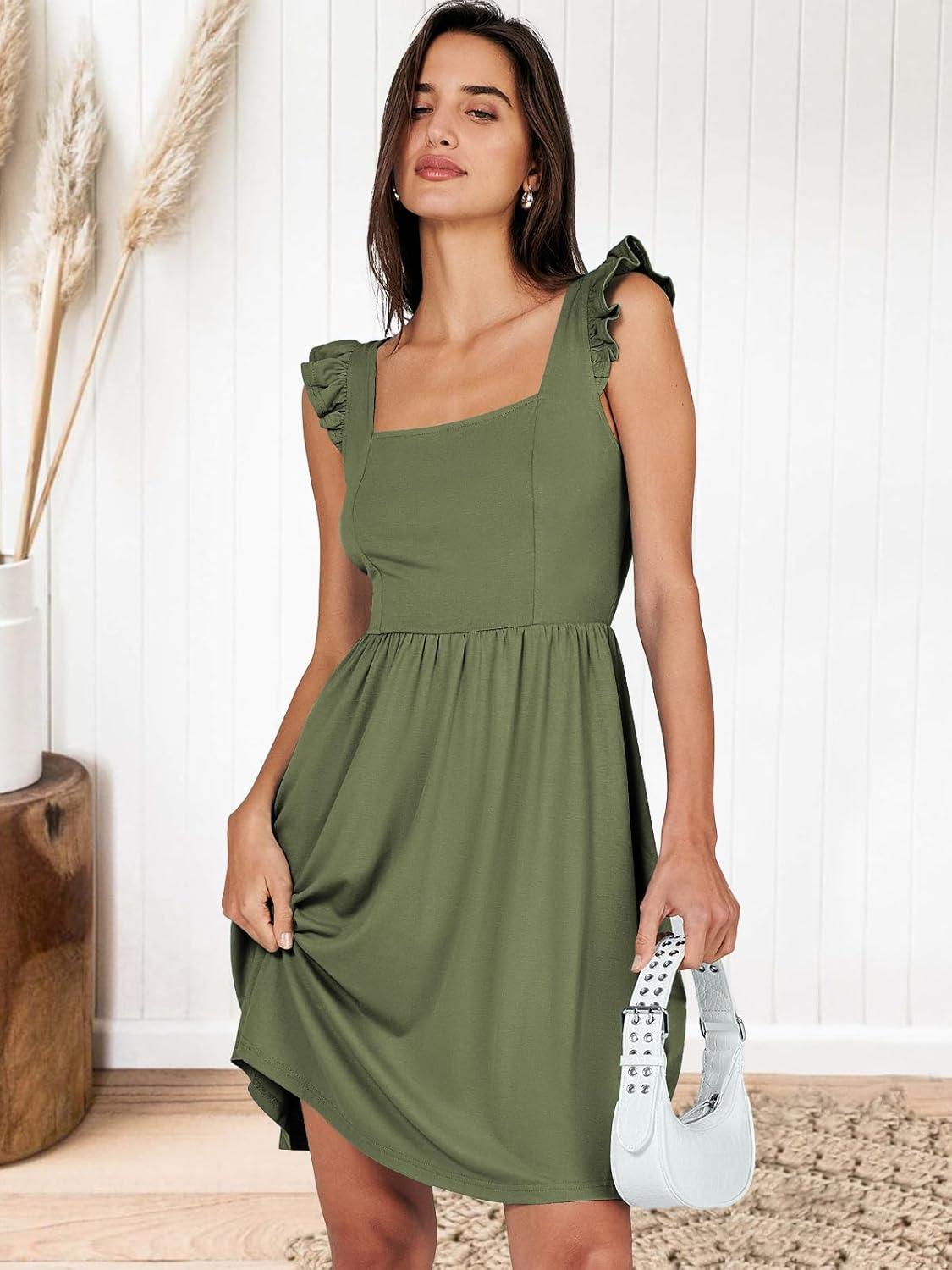 ANRABESS Womens Summer Short Dress 2025 Square Neck Sleeveless A Line Ruffled Wedding Casual Cute Teen Beach Mini Sundress(Olive)