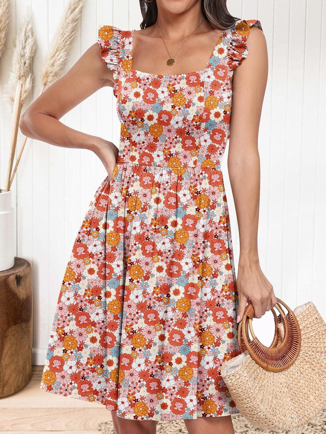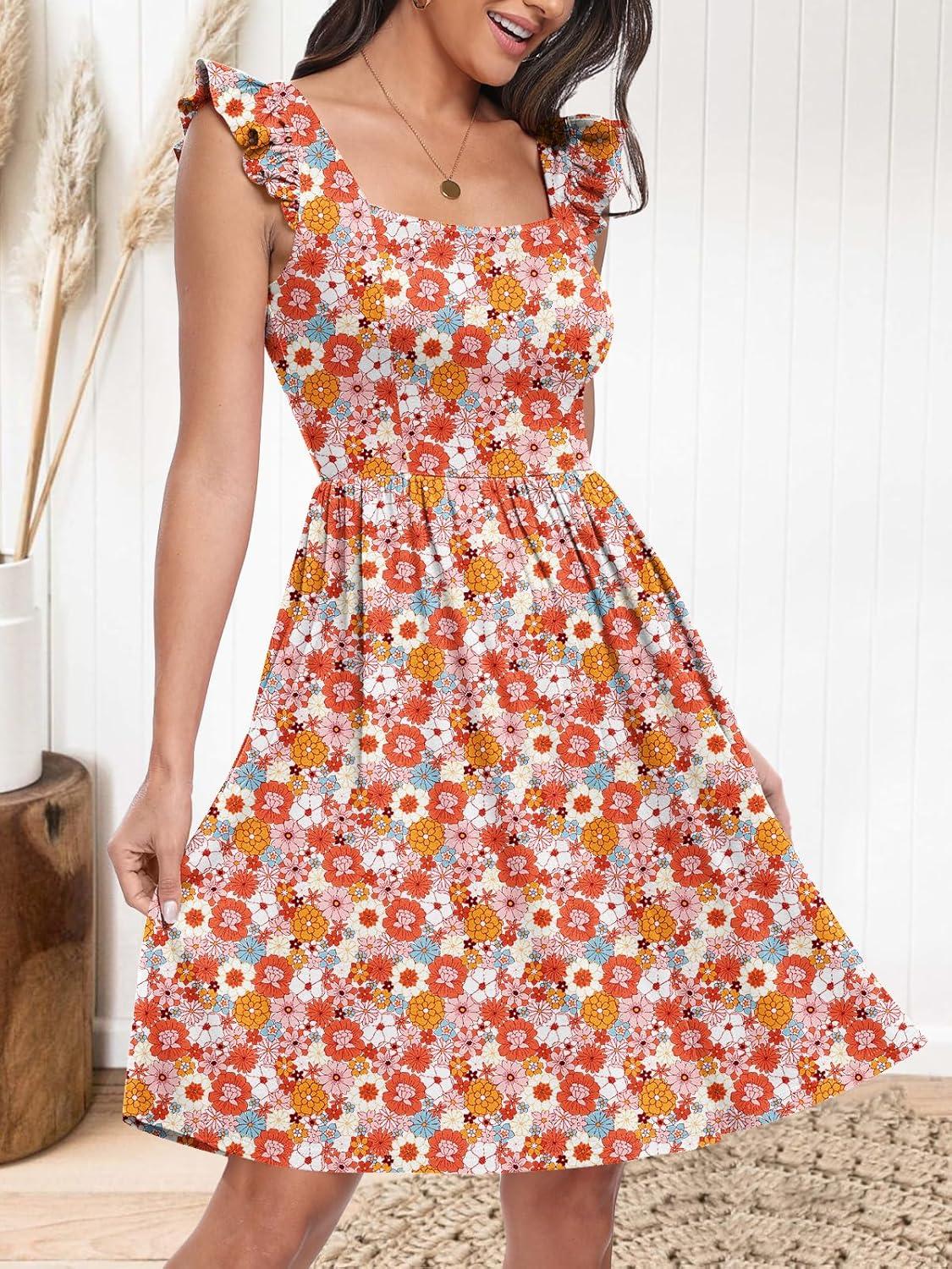 ANRABESS Womens Summer Short Dress 2025 Square Neck Sleeveless A Line Ruffled Wedding Casual Cute Teen Beach Mini Sundress(Orange Floral)