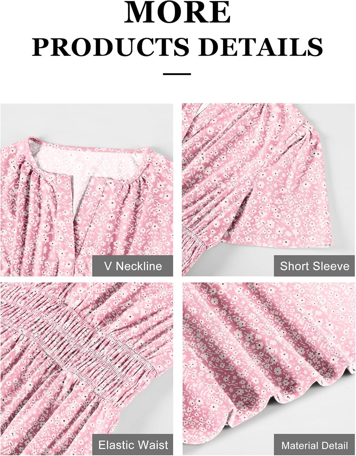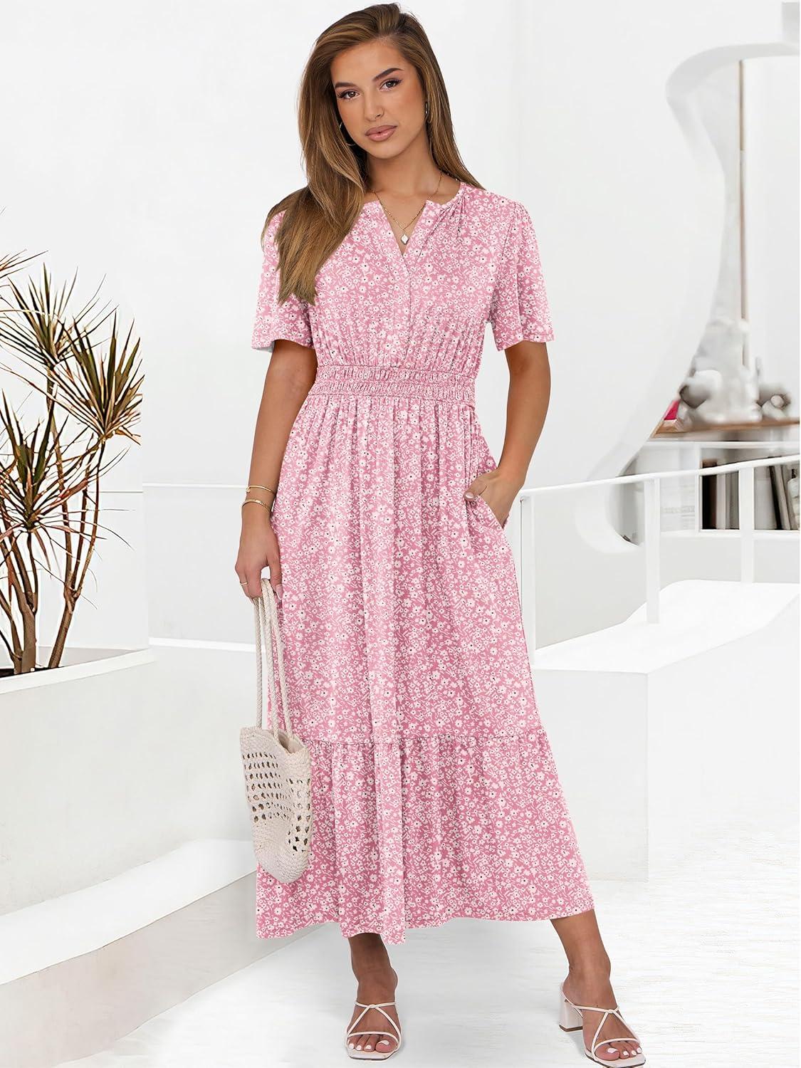 ANRABESS Women’s Summer Short Sleeve Maxi Dress 2025 Casual V Neck High Waist A-Line Flowy Loose Tiered Boho Long Dresses(Red Pink Floral)