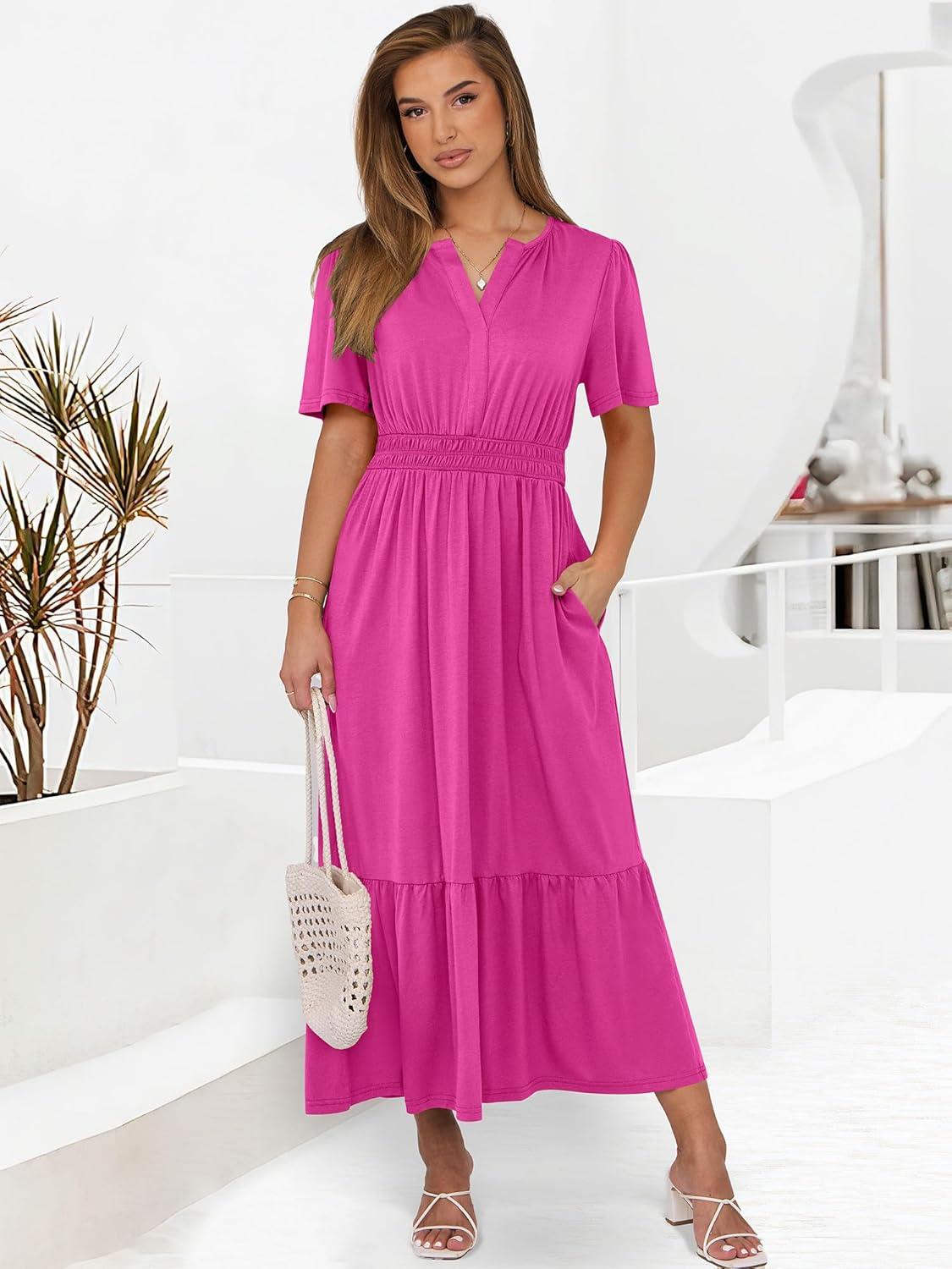 ANRABESS Women’s Summer Short Sleeve Maxi Dress 2025 Casual V Neck High Waist A-Line Flowy Loose Tiered Boho Long Dresses(Red)