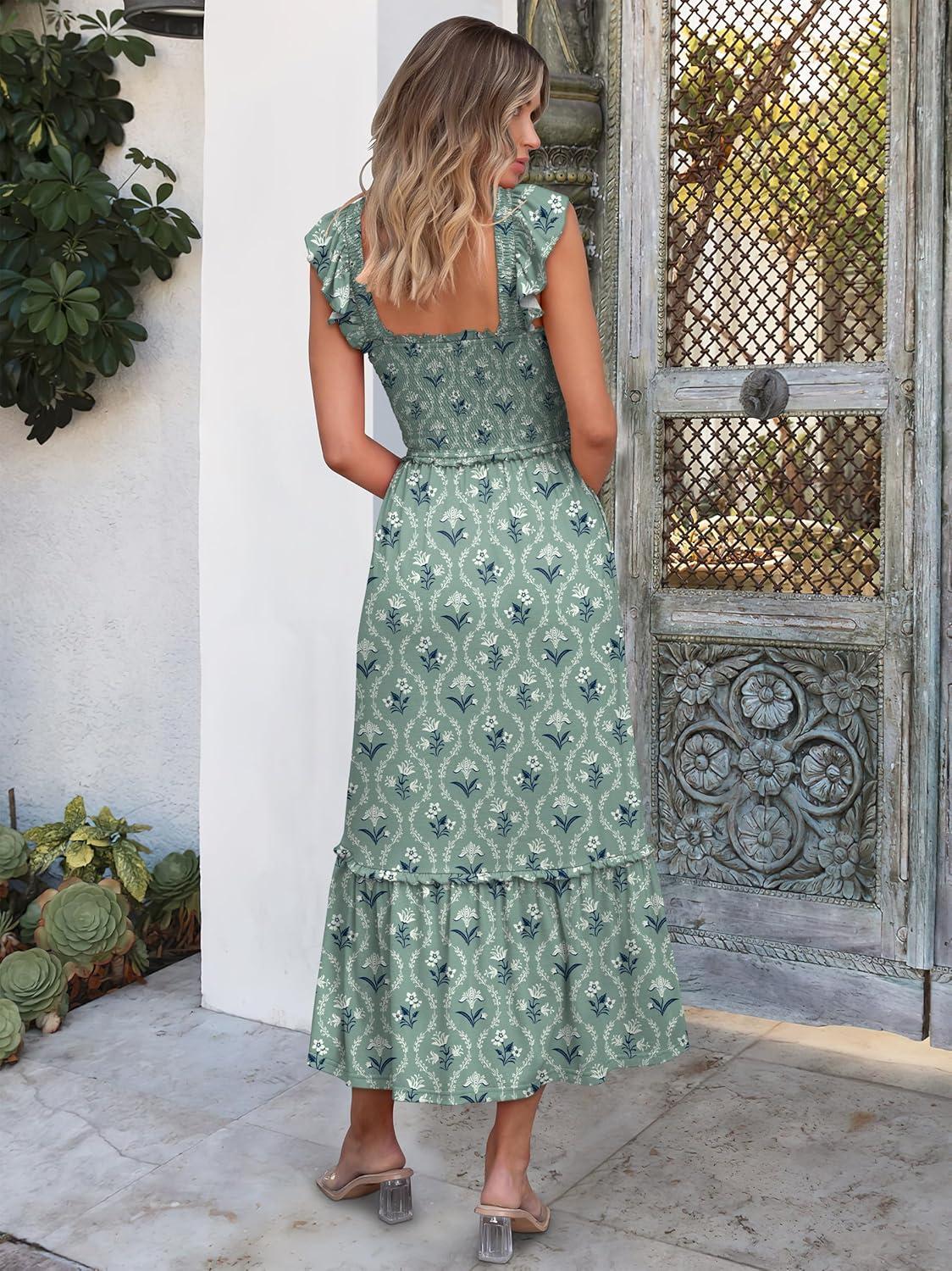 ANRABESS Womens Summer Sleeveless Maxi Dress Square Neck Smocked Boho Casual Ruffle Strap Flowy A-Line Long Beach Sundress(Light Green White Floral)
