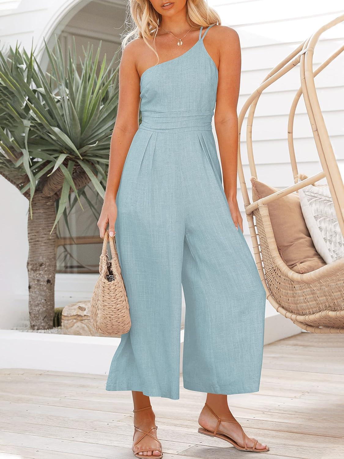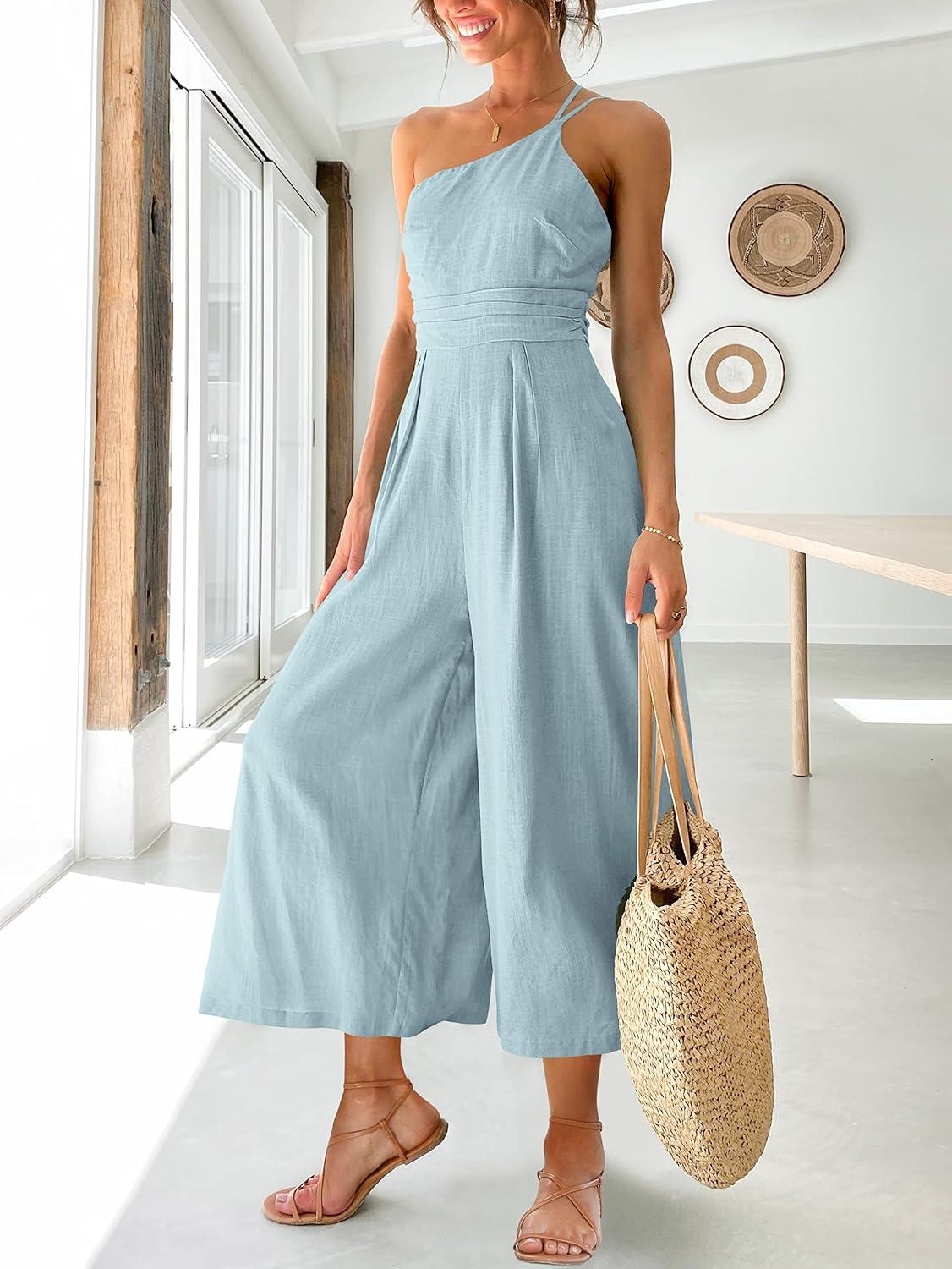 ANRABESS Women’s Summer Straps One Shoulder High Waist Dressy Casual Wide Leg Linen Jumpsuit Romper Beach Travel Outfits(Sky Blue)