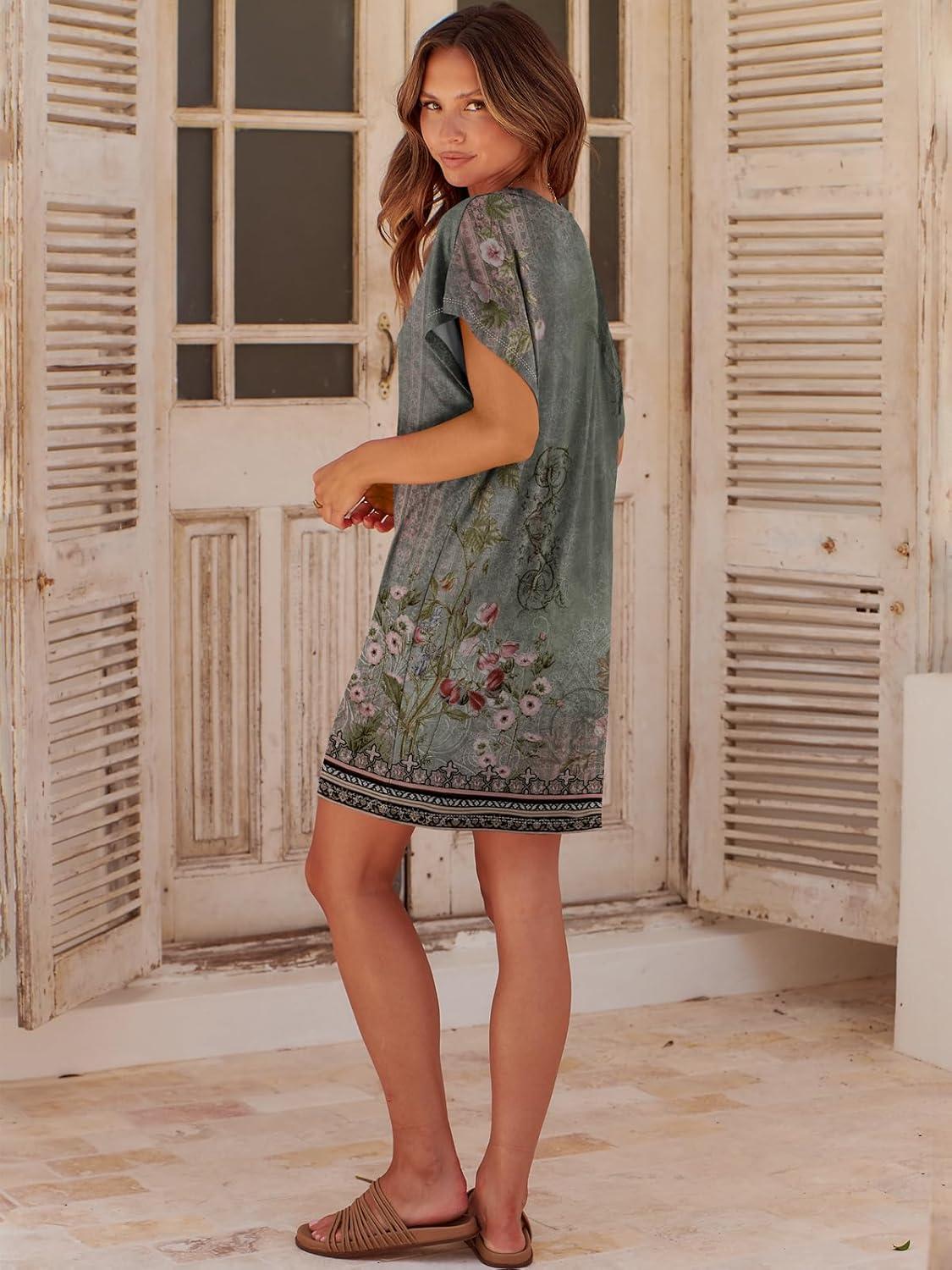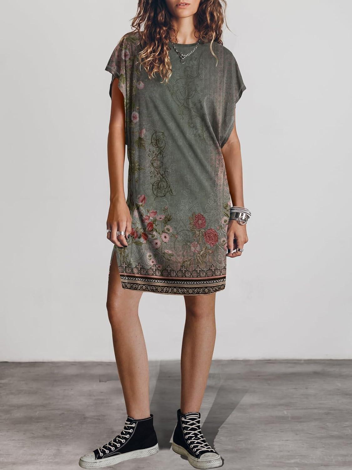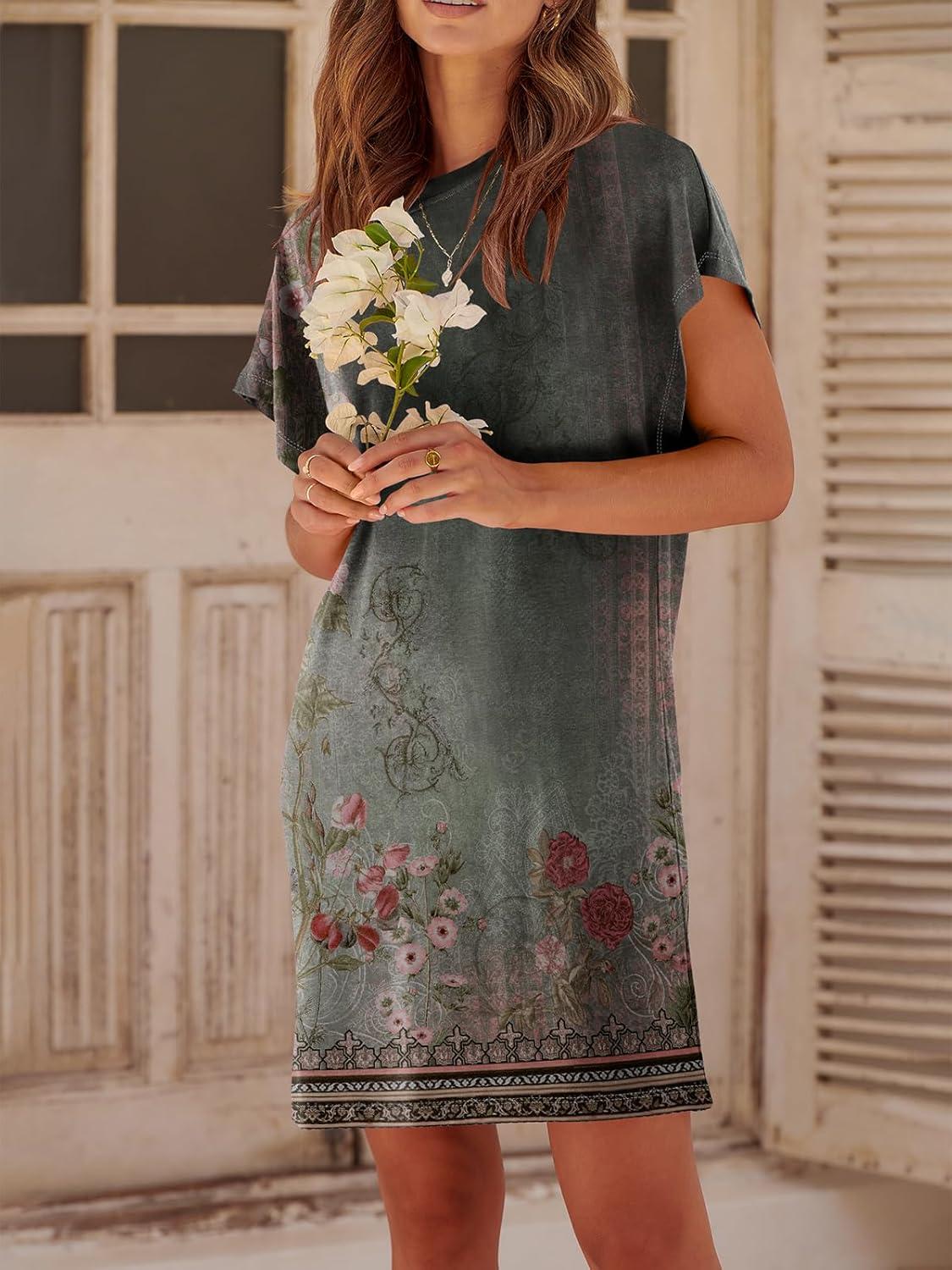 ANRABESS Women’s Summer T Shirt Dress 2025 Beach Vacation Travel Outfits Casual Simple Soft Mini Sundress Cover Up Clothes(Floral Grey)