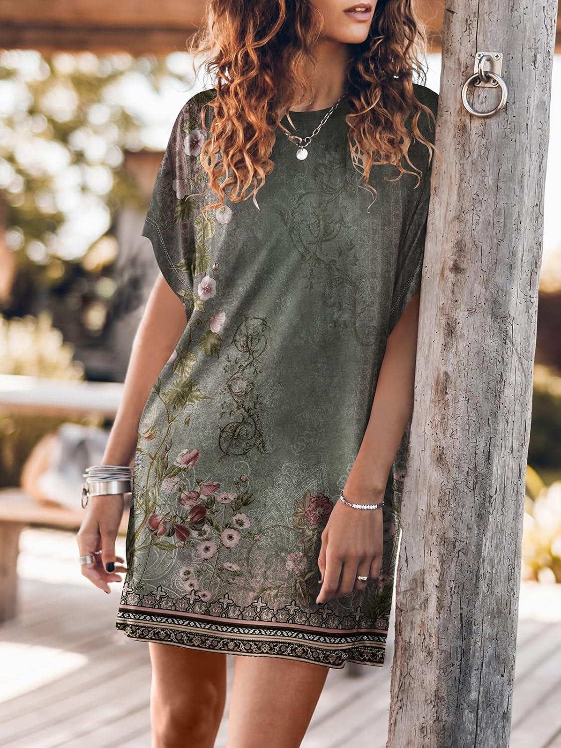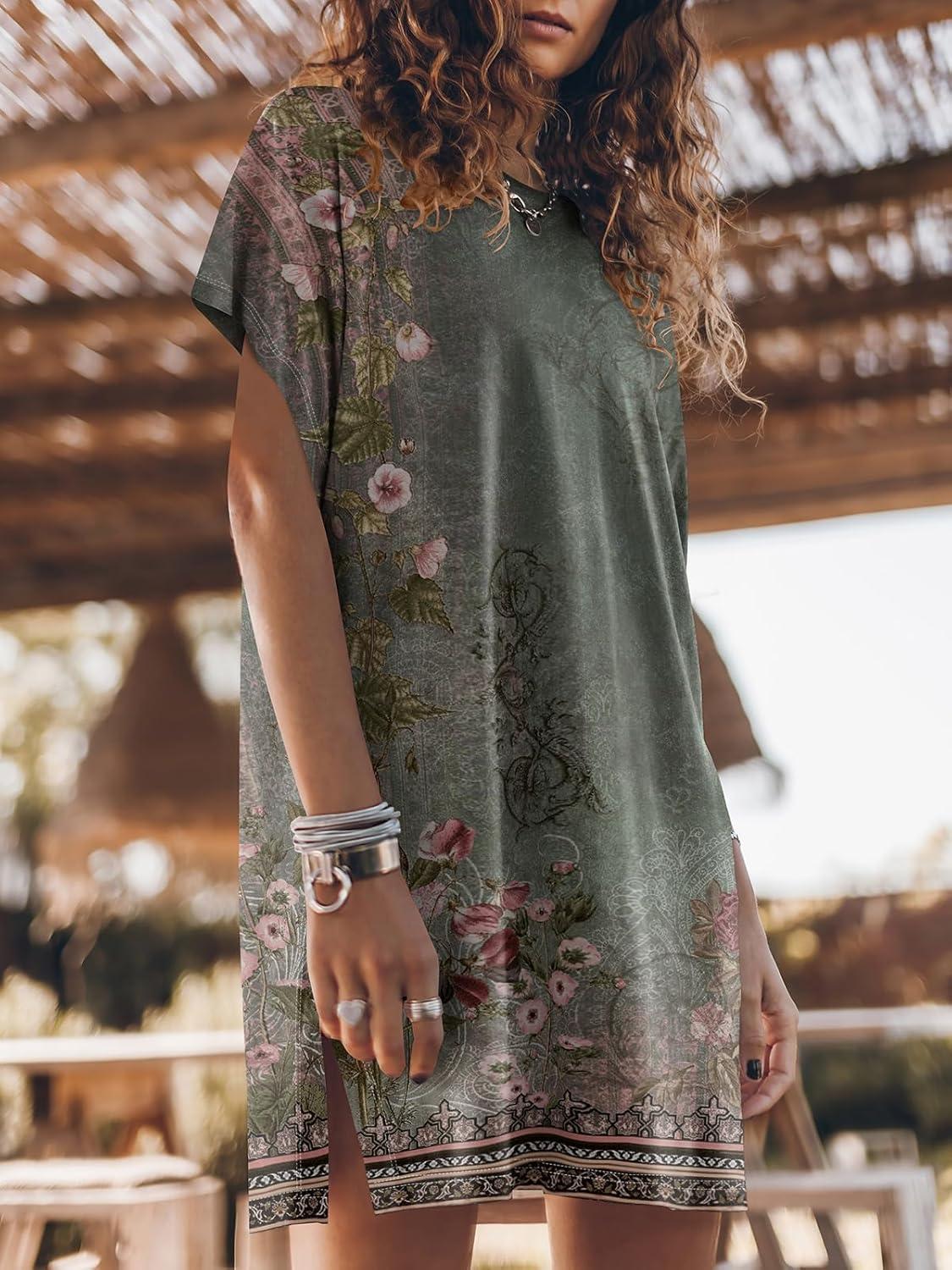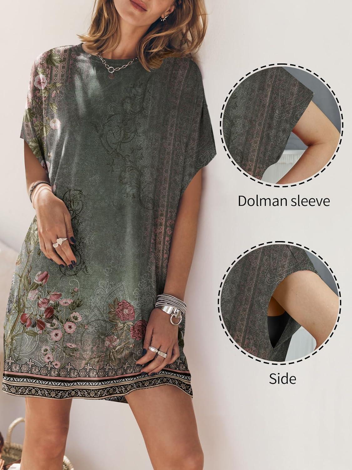 ANRABESS Women’s Summer T Shirt Dress 2025 Beach Vacation Travel Outfits Casual Simple Soft Mini Sundress Cover Up Clothes(Floral Grey)