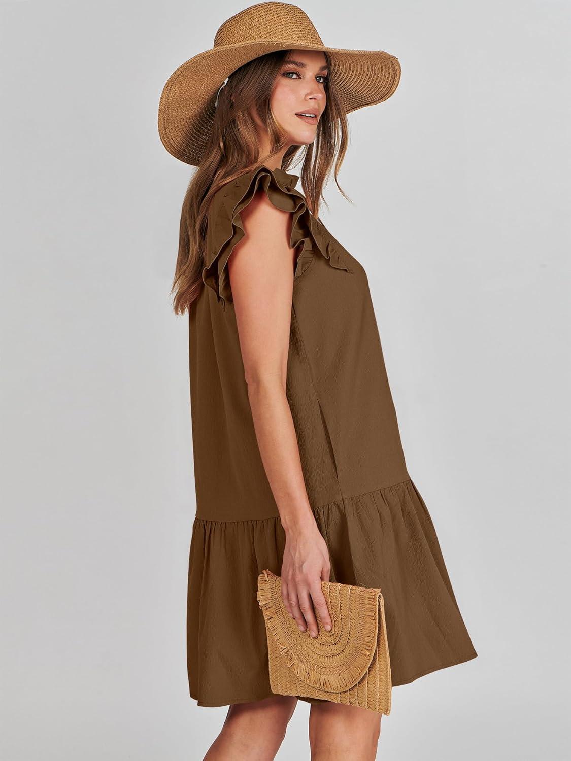 ANRABESS Womens Summer V-Neck Drawstring Ruffle Cap Short Sleeve Casual Shift Mini Dress with Pockets(Camel)