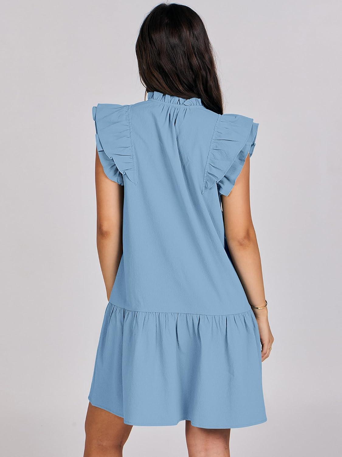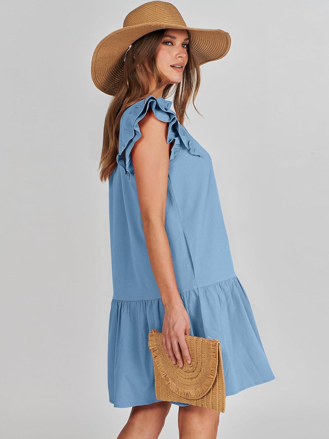 ANRABESS Womens Summer V-Neck Drawstring Ruffle Cap Short Sleeve Casual Shift Mini Dress with Pockets(Sky Blue)