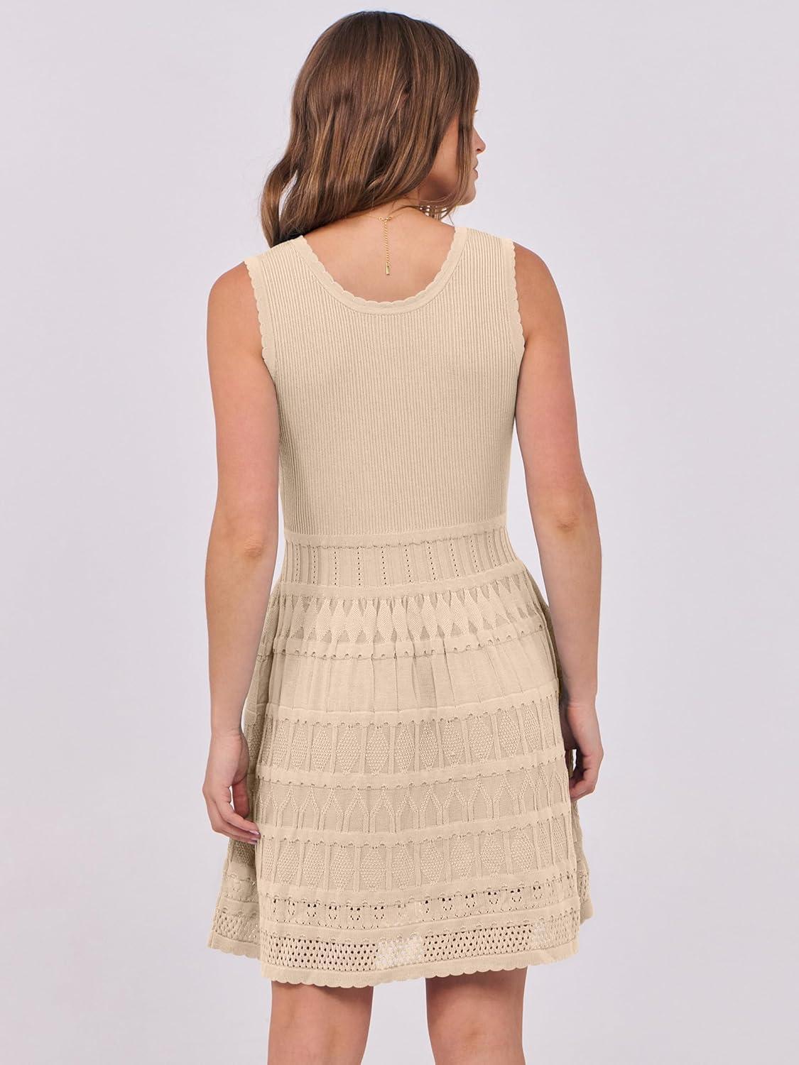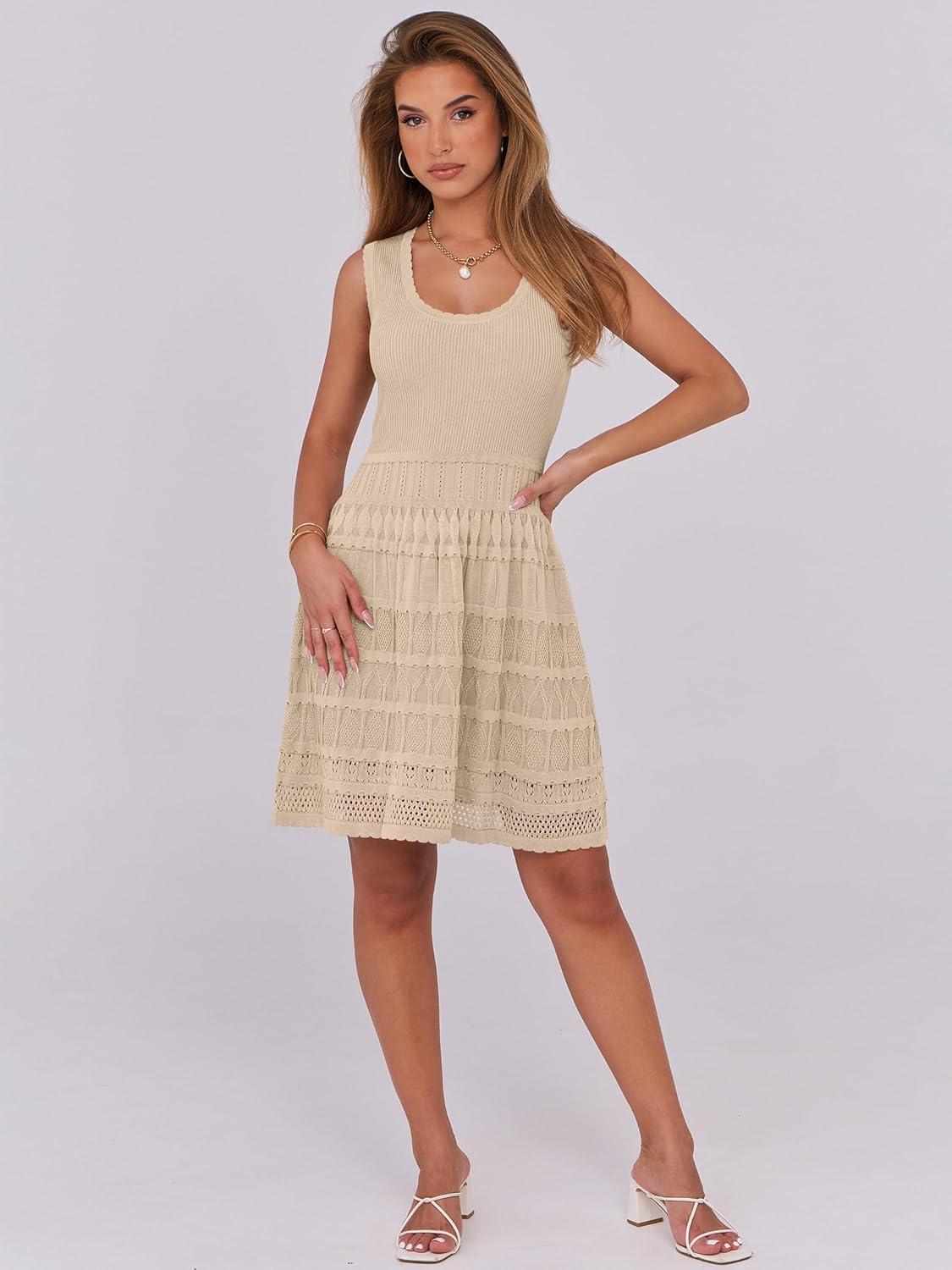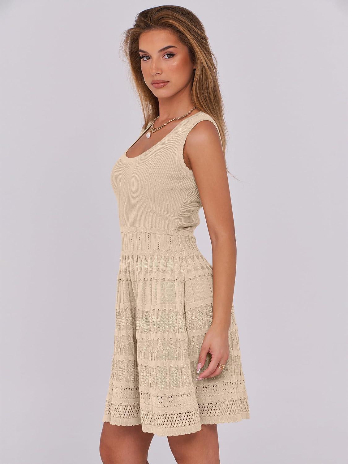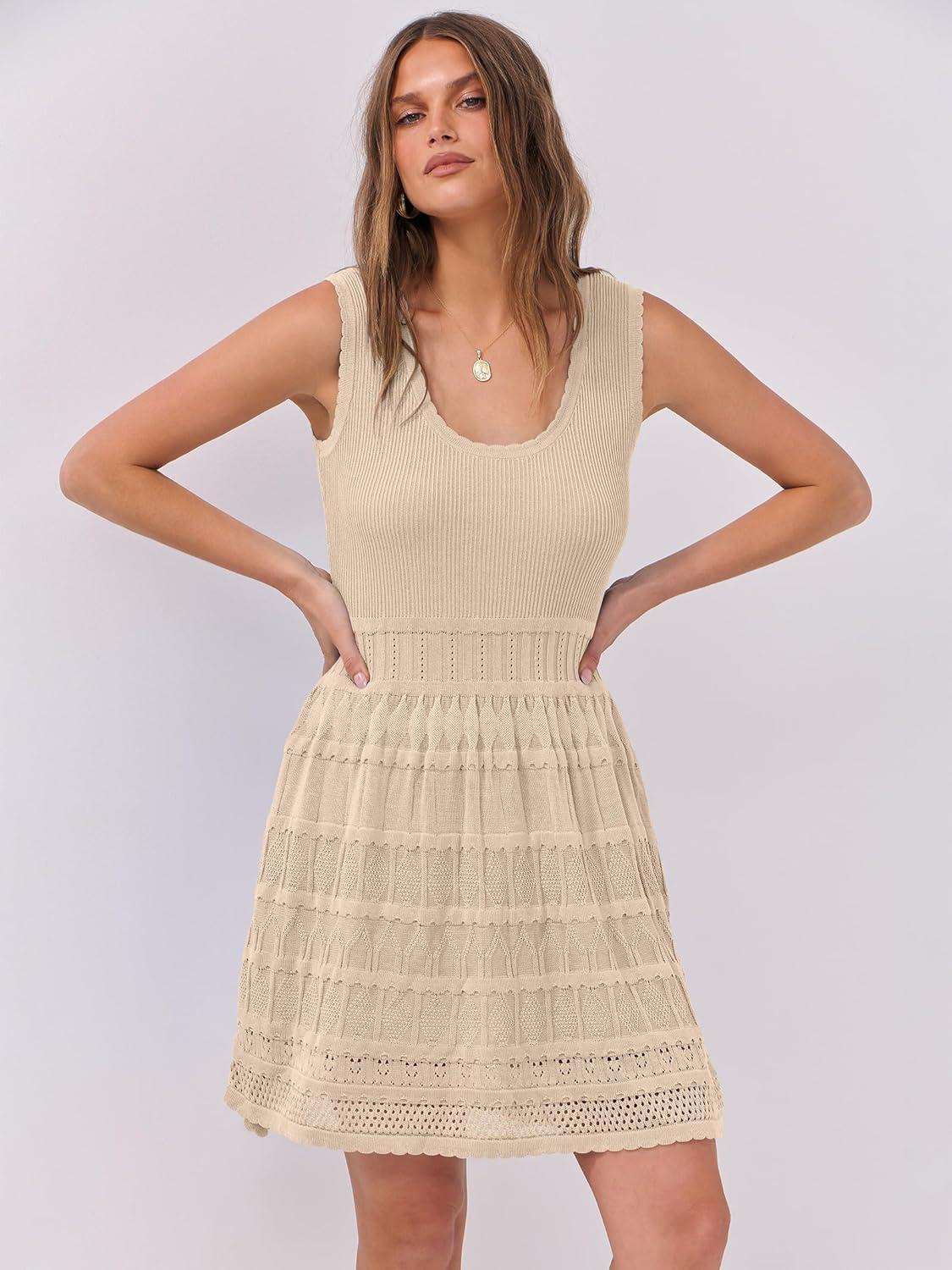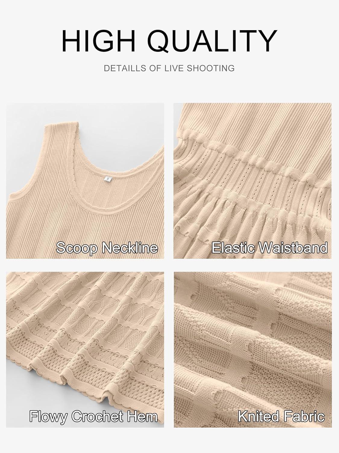 ANRABESS Womens Sundress Beach Vacation Mini Tank Dresses Summer Casual Crochet Knit Scoop Neck Sleeveless Dress(Beige)