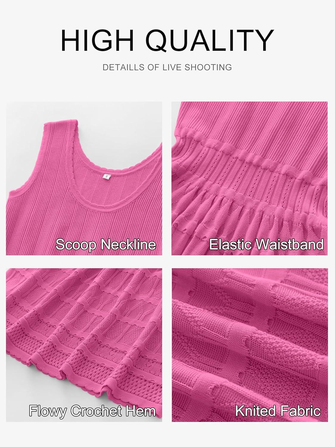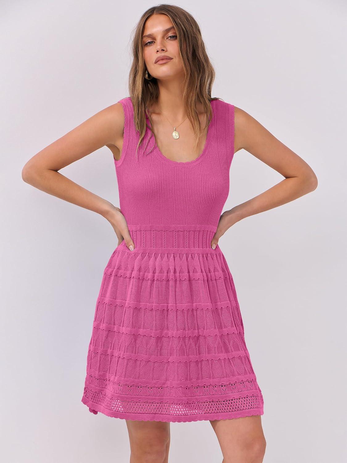 ANRABESS Womens Sundress Beach Vacation Mini Tank Dresses Summer Casual Crochet Knit Scoop Neck Sleeveless Dress(Hot Pink)