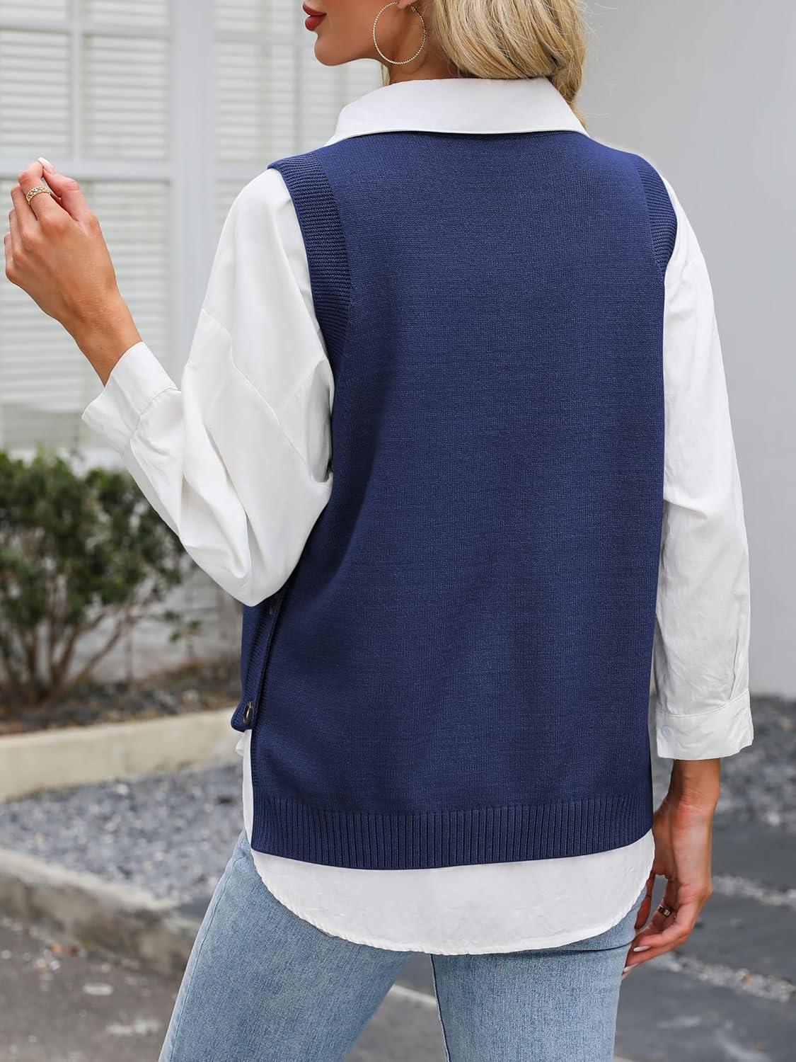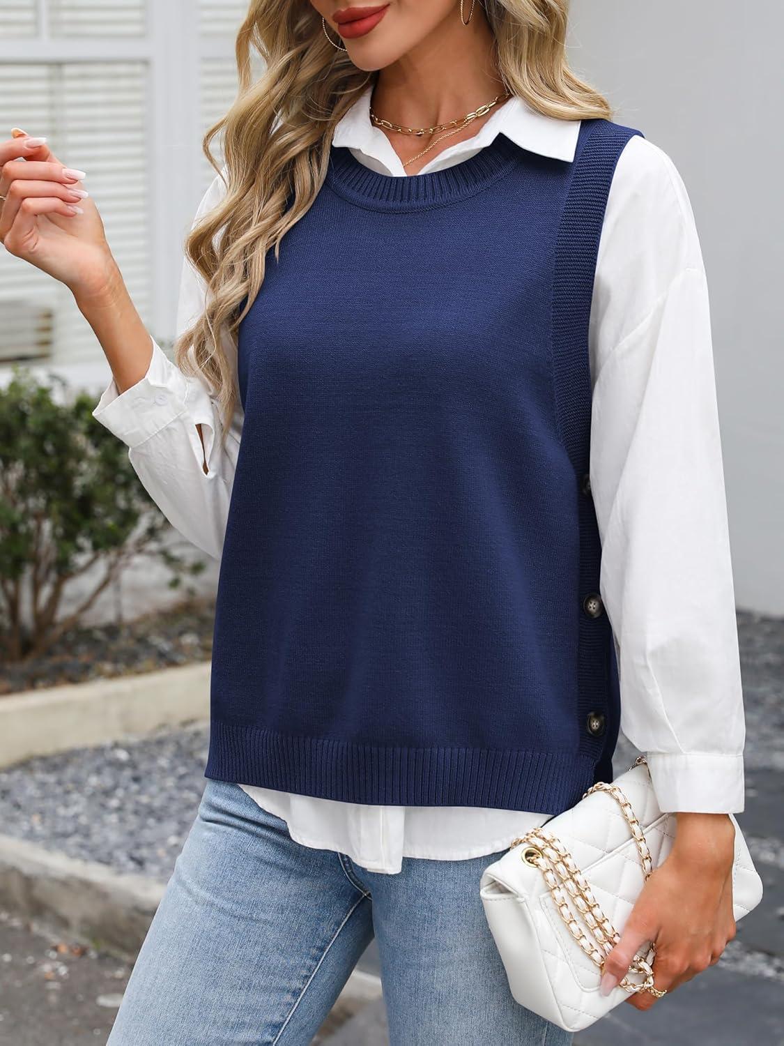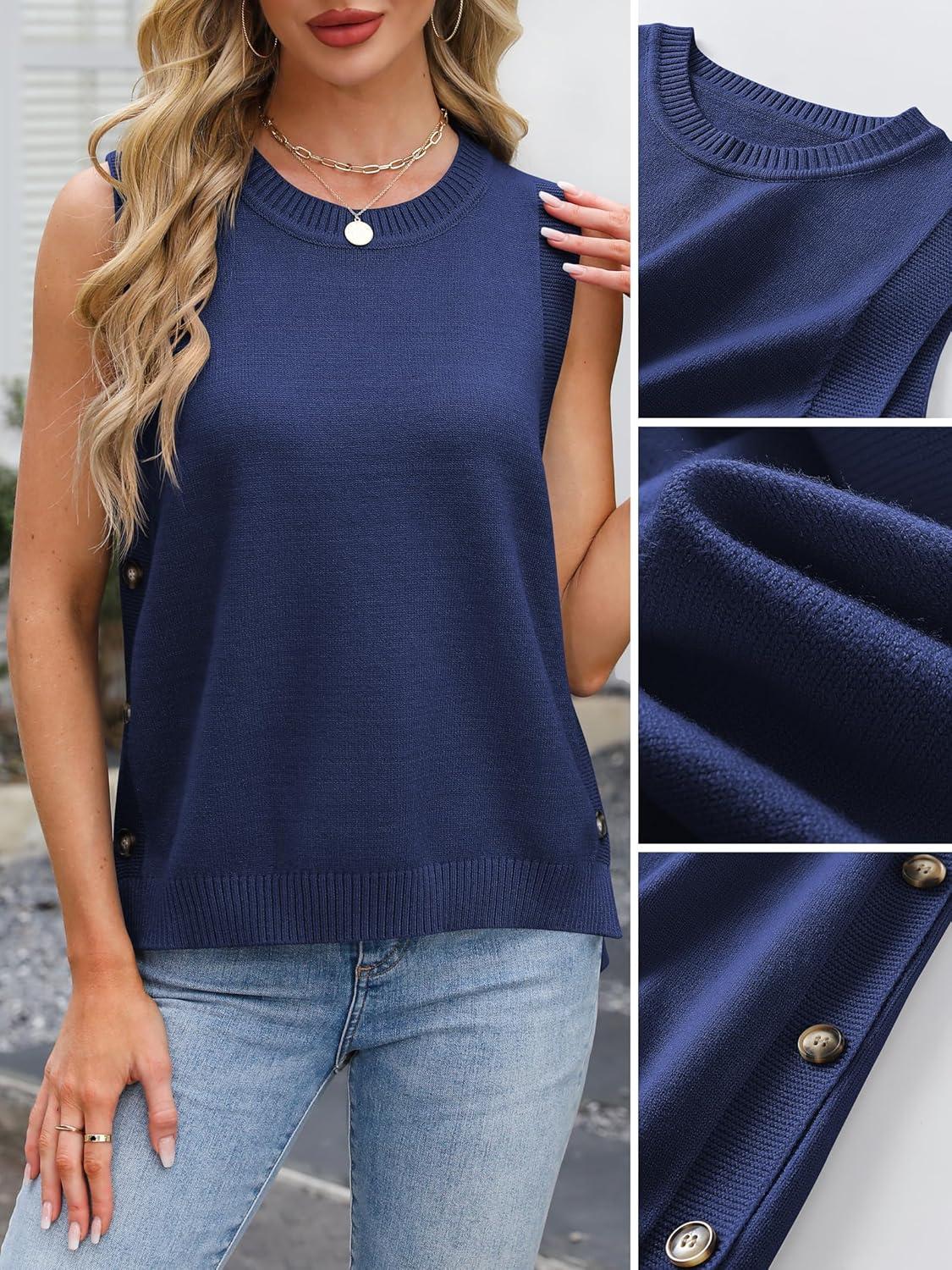 ANRABESS Womens Sweater Vest Summer Sleeveless Crewneck Ribbed Knit Side Button Loose Pullover Tank Tops 2025 Fall Outfits(Navy Blue)