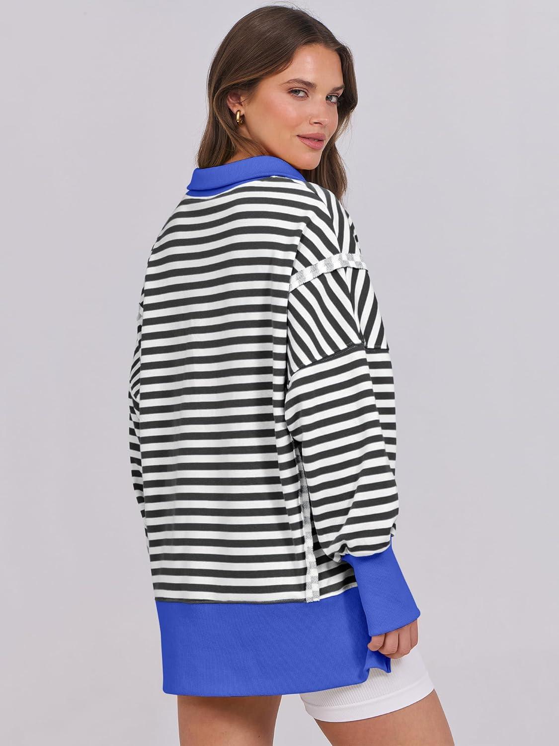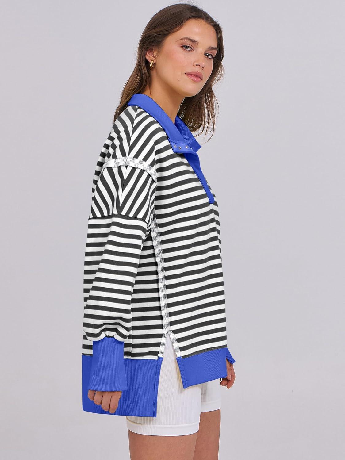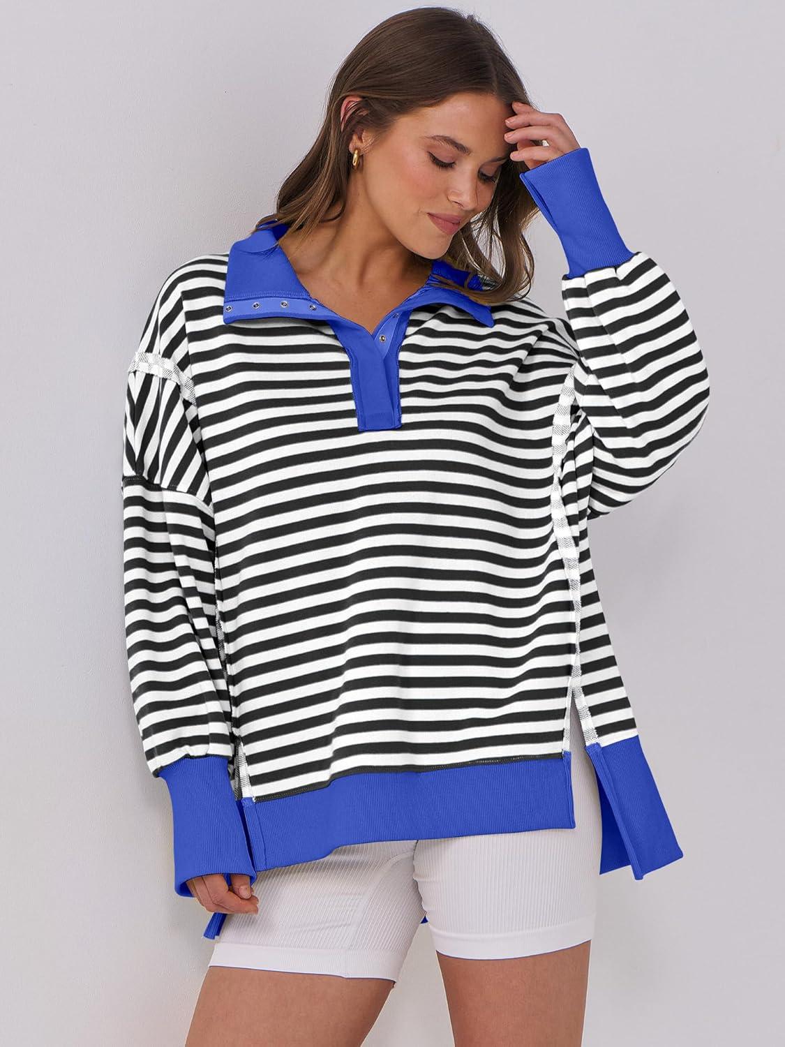 ANRABESS Women’s Sweatshirts Oversized Casual Loose Button Up Henley Pullover Top High Low Split 2025 Fall Fashion Outfits(Black White)