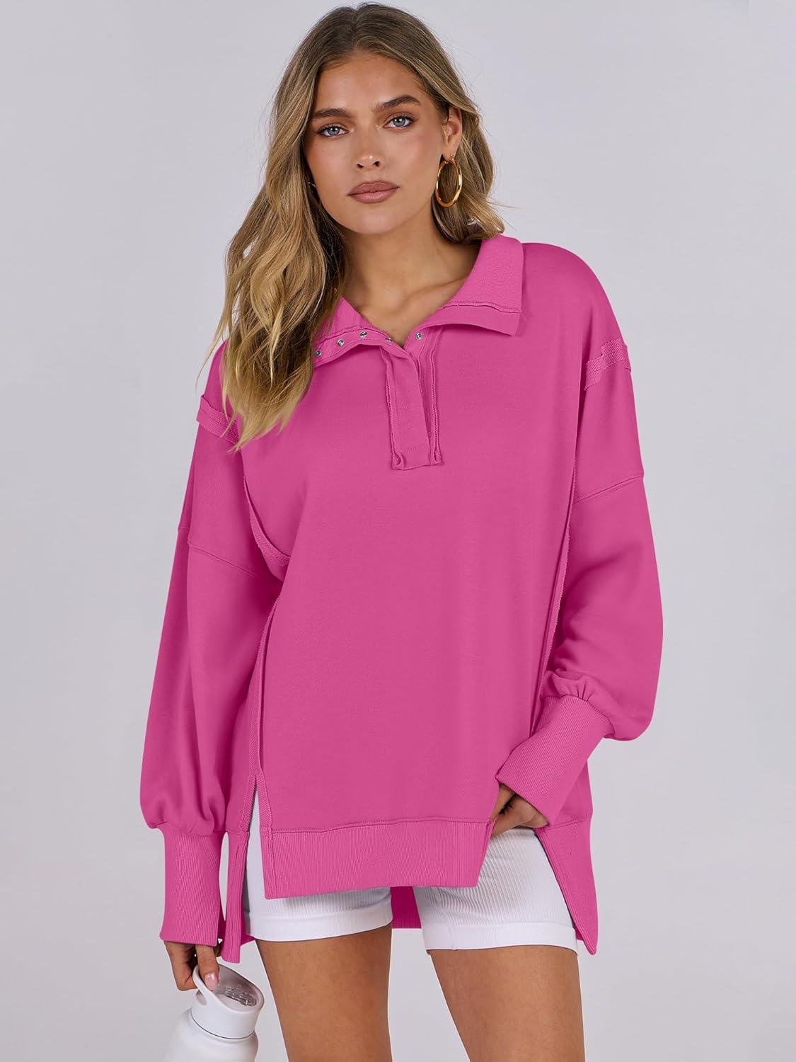 ANRABESS Women’s Sweatshirts Oversized Casual Loose Button Up Henley Pullover Top High Low Split 2025 Fall Fashion Outfits(Hot Pink)