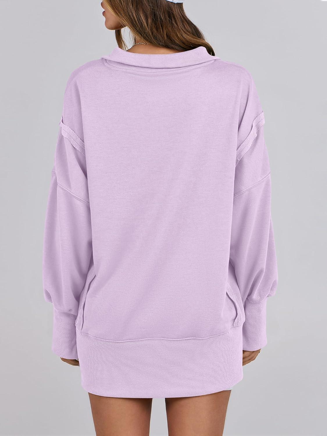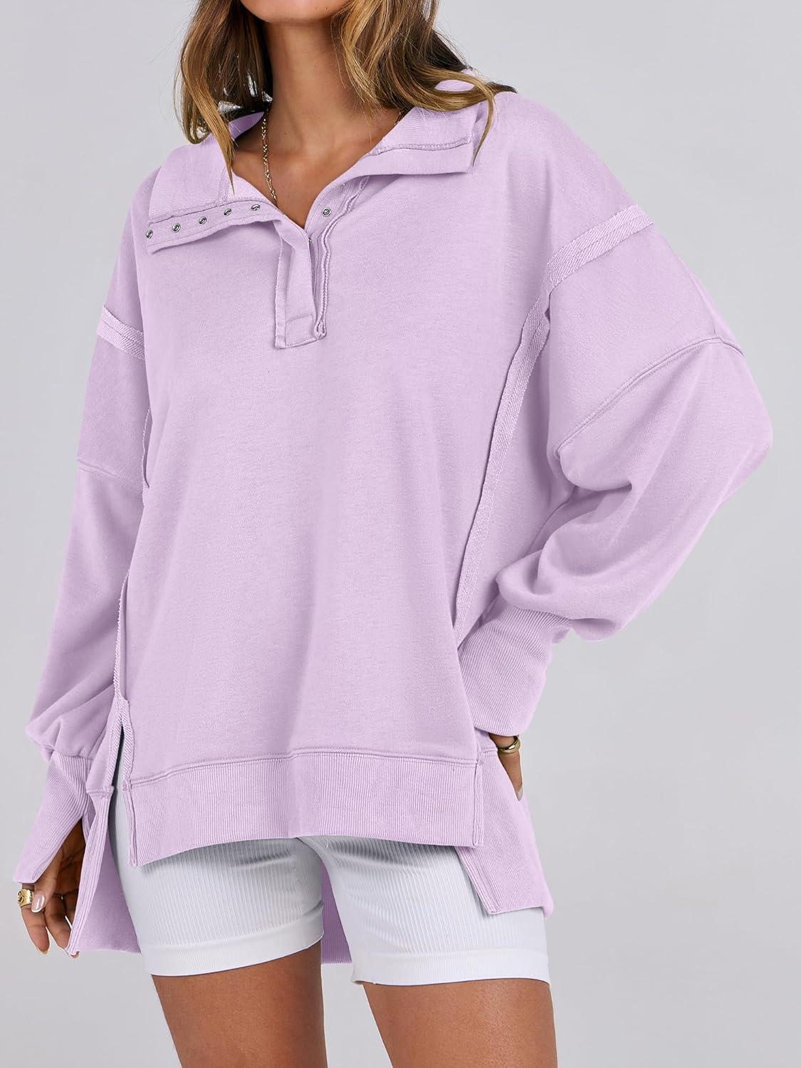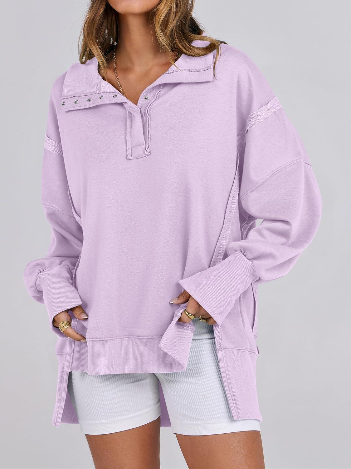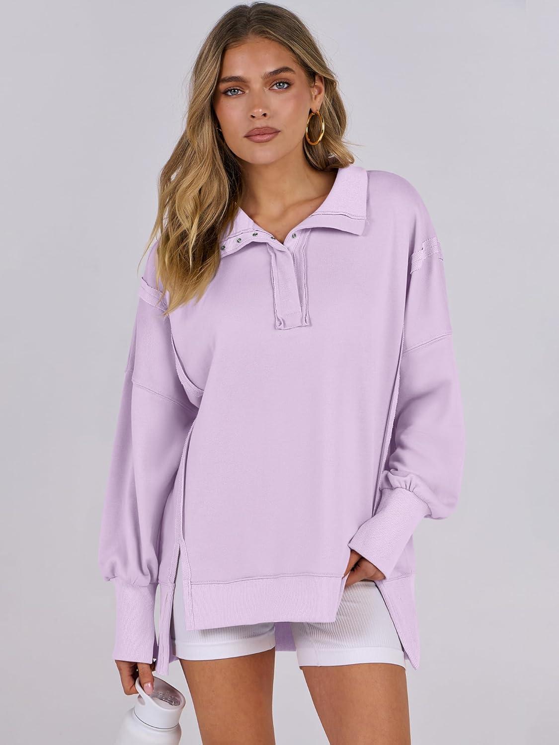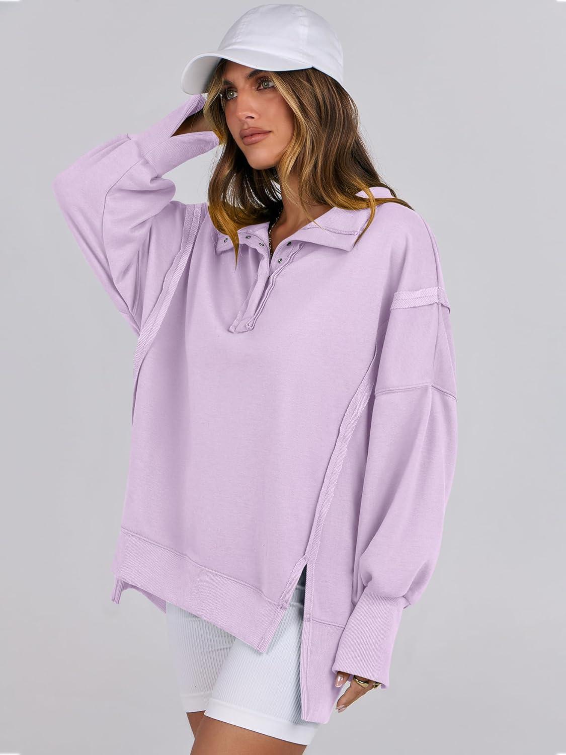 ANRABESS Women’s Sweatshirts Oversized Casual Loose Button Up Henley Pullover Top High Low Split 2025 Fall Fashion Outfits(Light Purple)