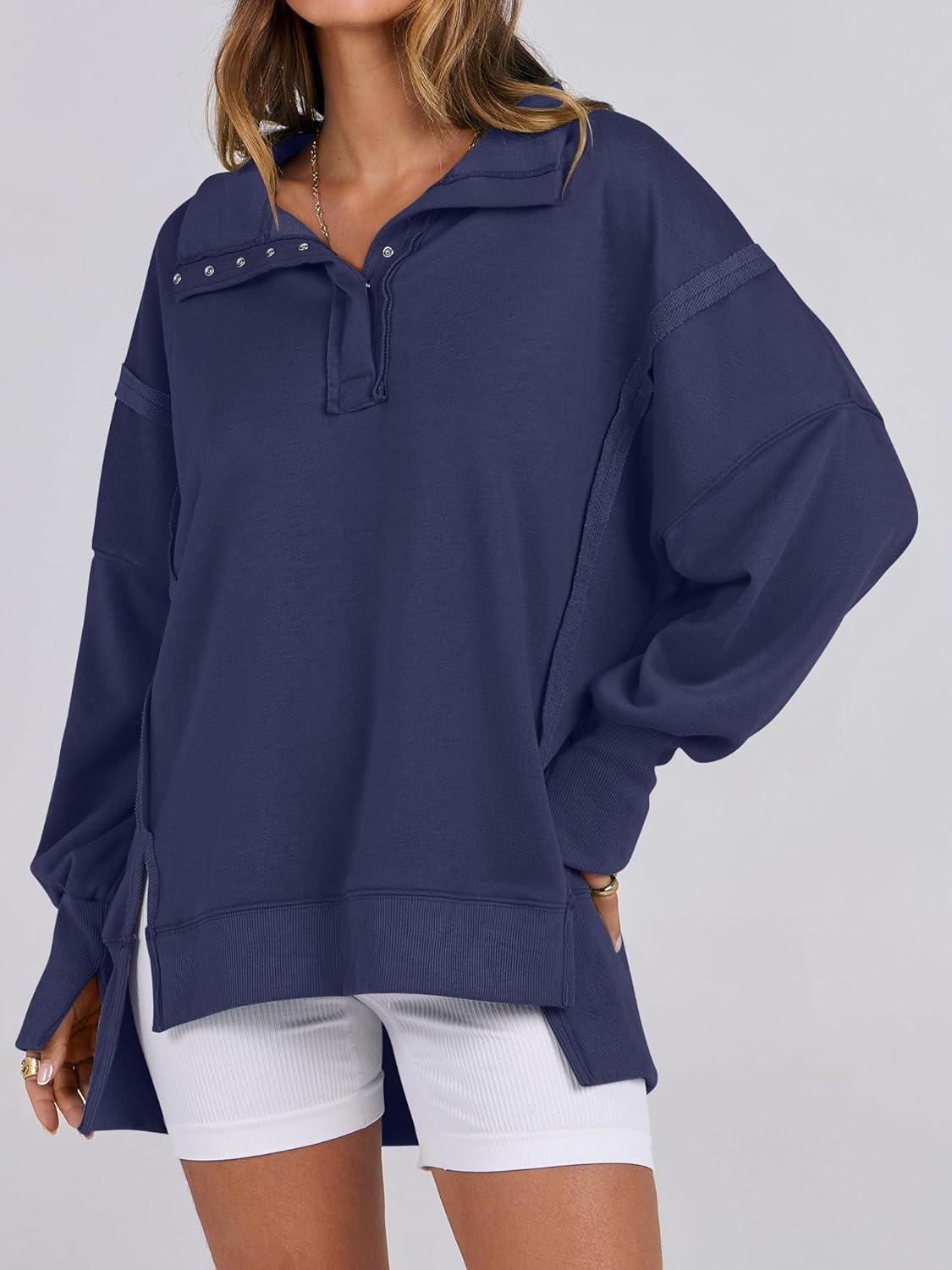ANRABESS Women’s Sweatshirts Oversized Casual Loose Button Up Henley Pullover Top High Low Split 2025 Fall Fashion Outfits(Navy Blue)