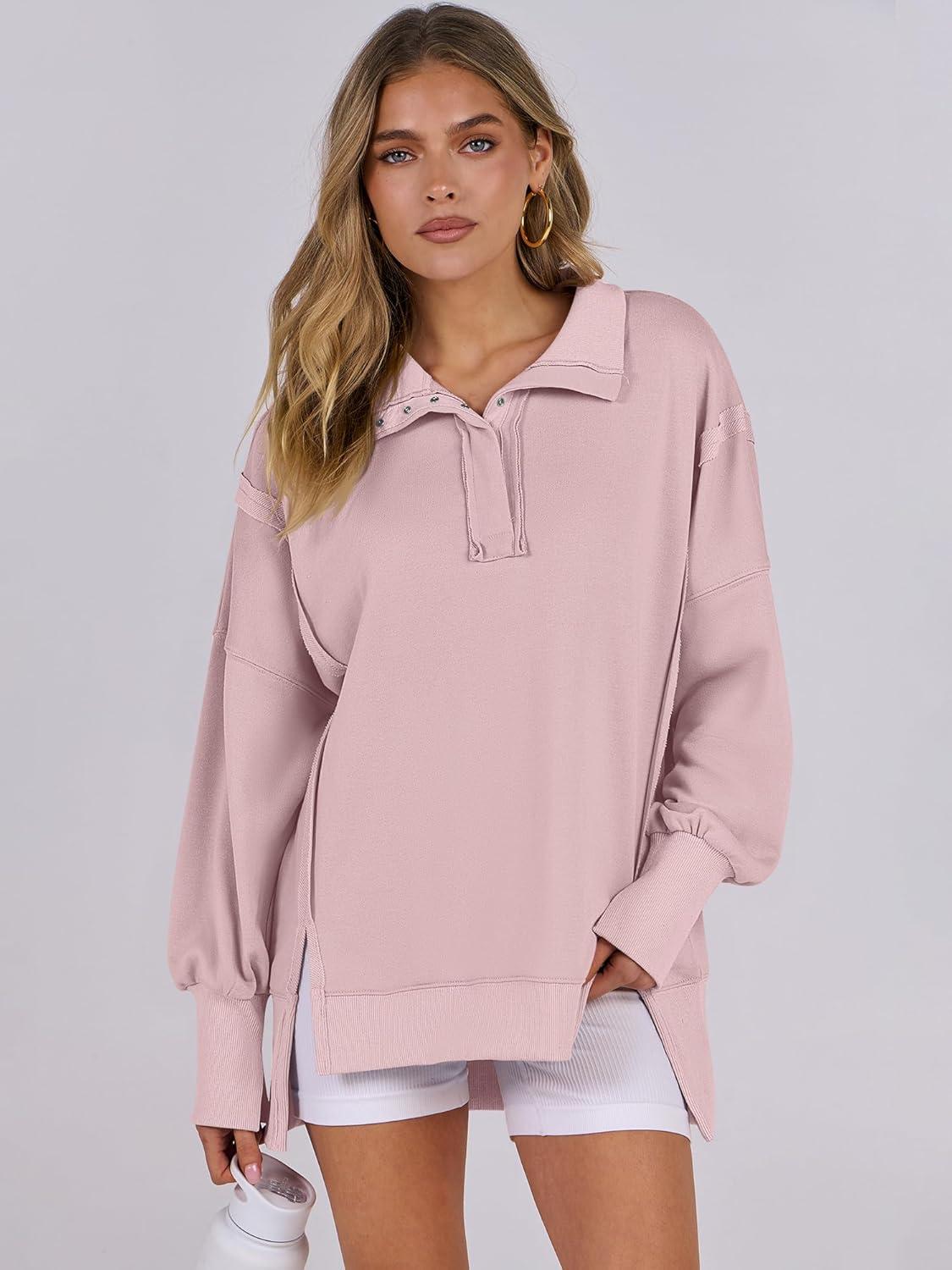 ANRABESS Women’s Sweatshirts Oversized Casual Loose Button Up Henley Pullover Top High Low Split 2025 Fall Fashion Outfits(Pink)