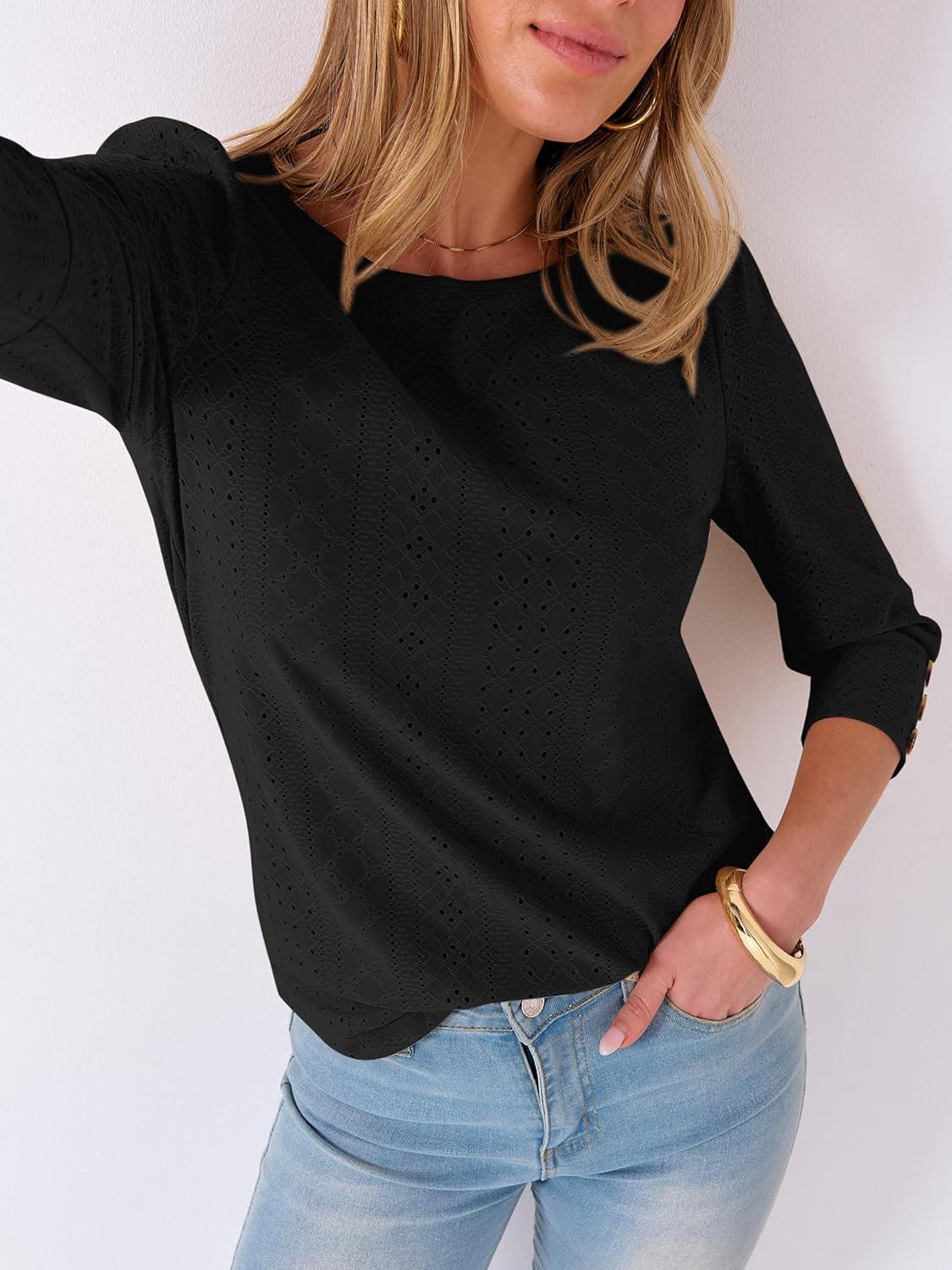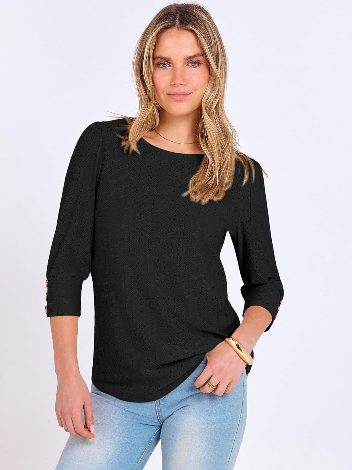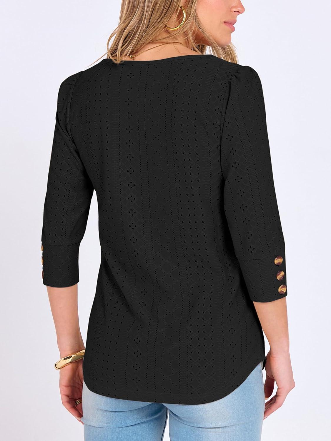 ANRABESS Womens Tops 3/4 Sleeve with Buttons Dressy Casual Blouses Summer Eyelet Shirts 2026 Spring Vacation Business Tunics(Black)
