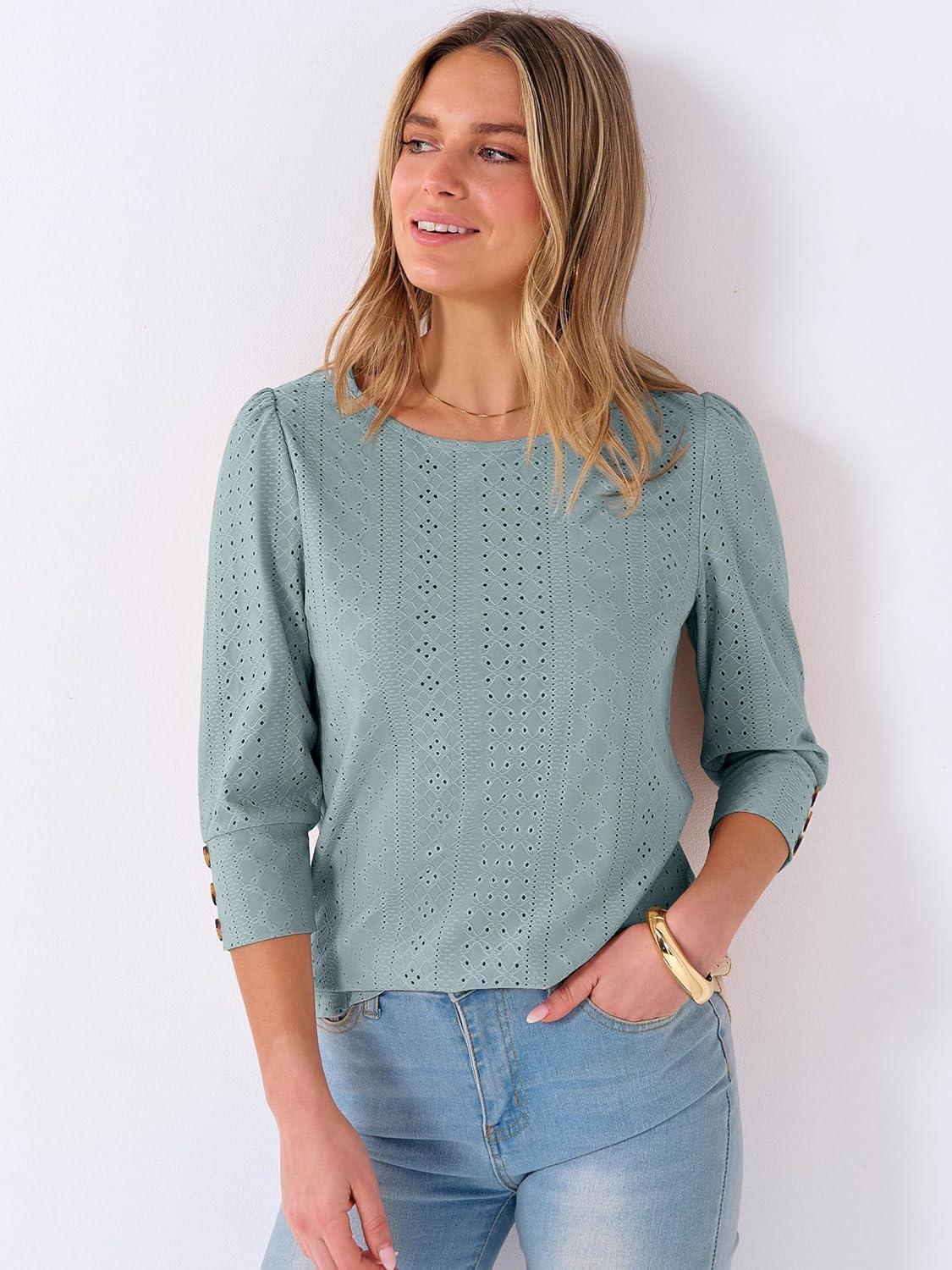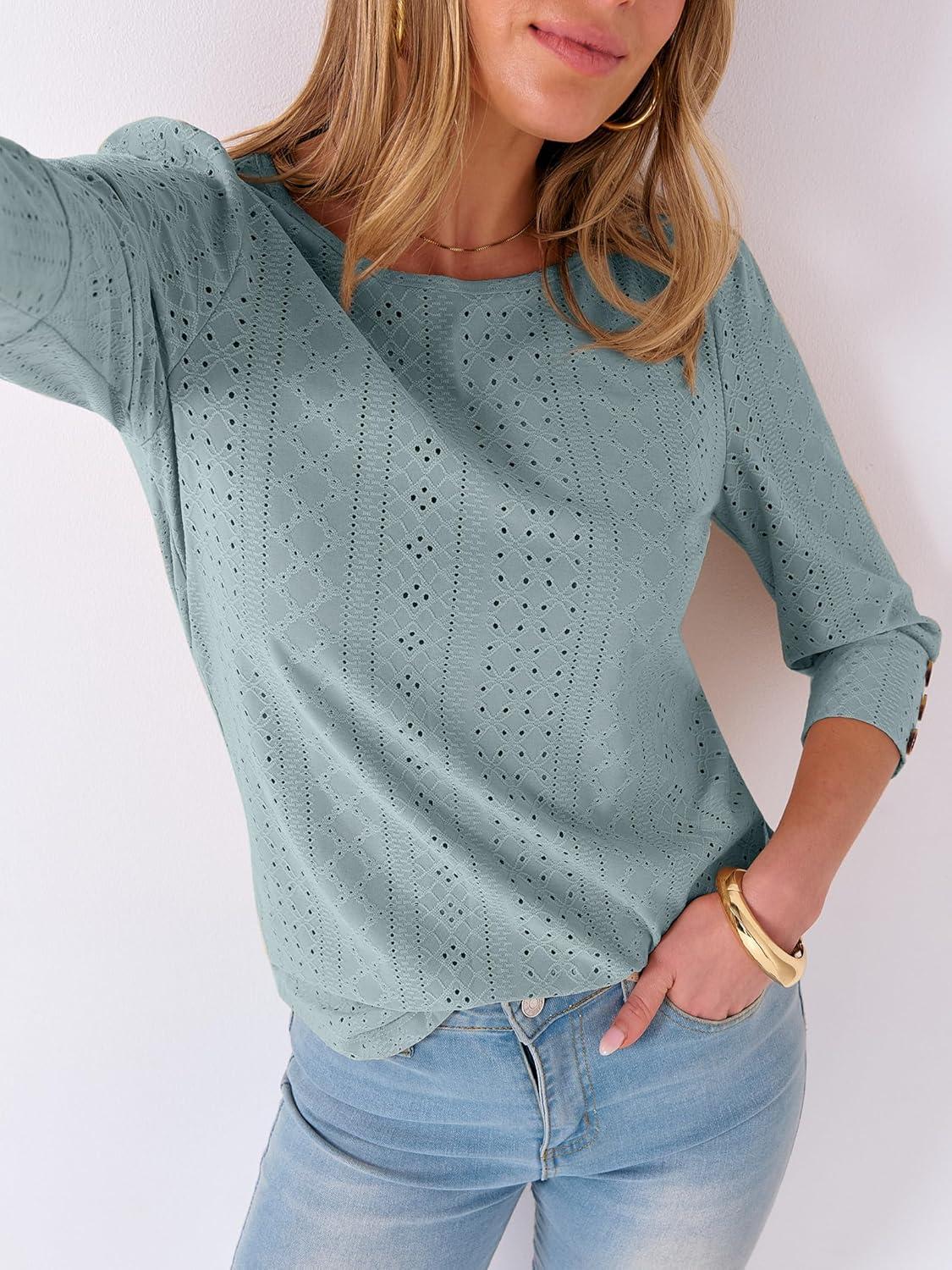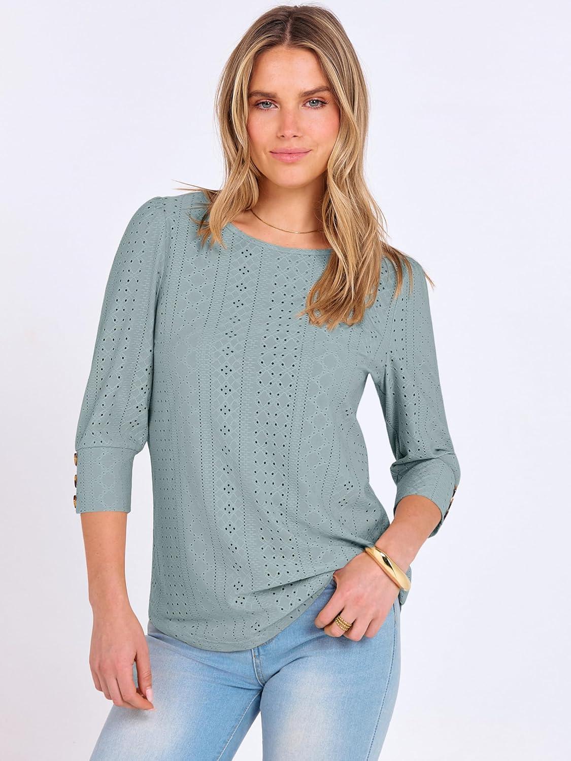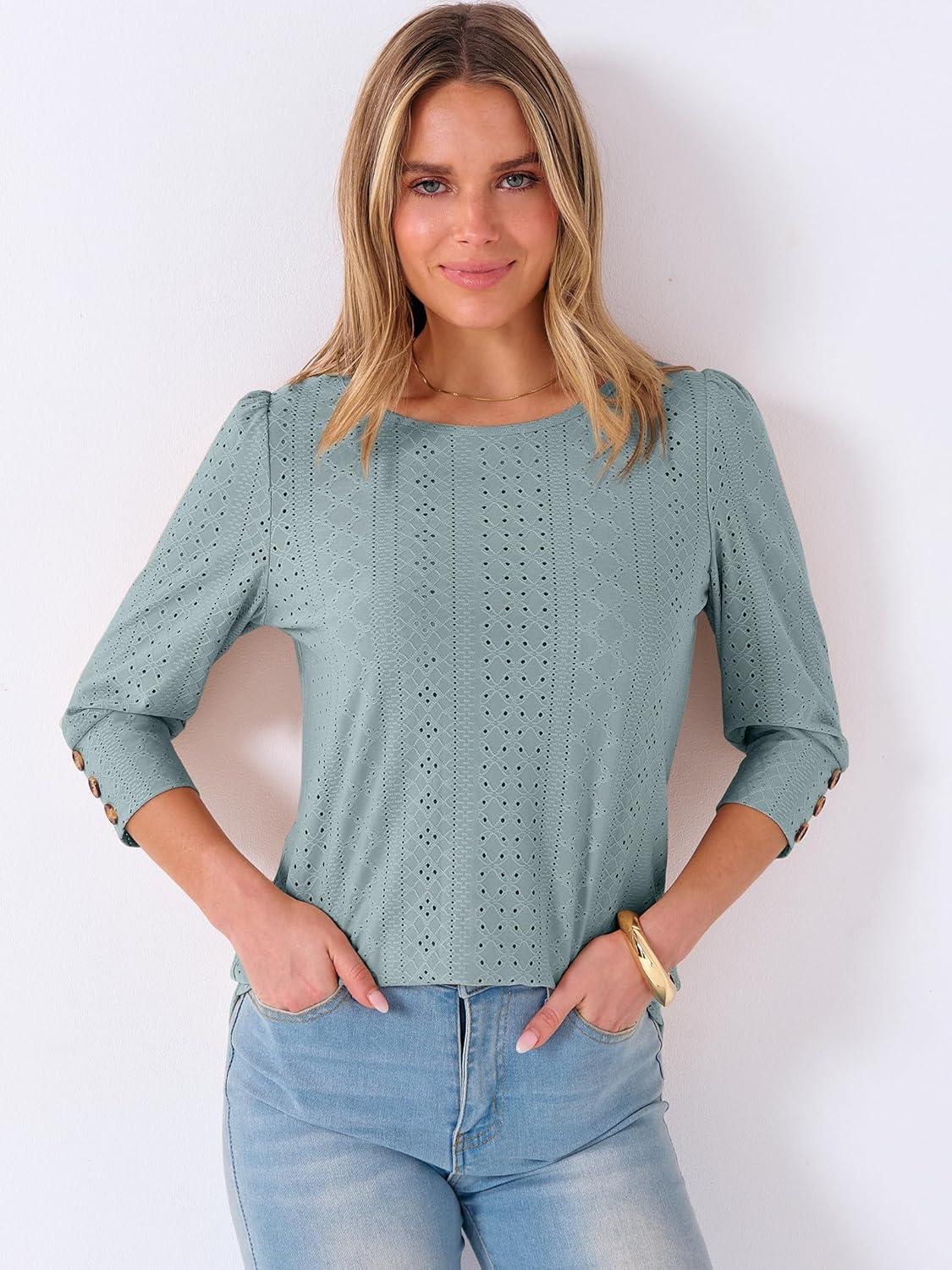 ANRABESS Womens Tops 3/4 Sleeve with Buttons Dressy Casual Blouses Summer Eyelet Shirts 2026 Spring Vacation Business Tunics(Green)