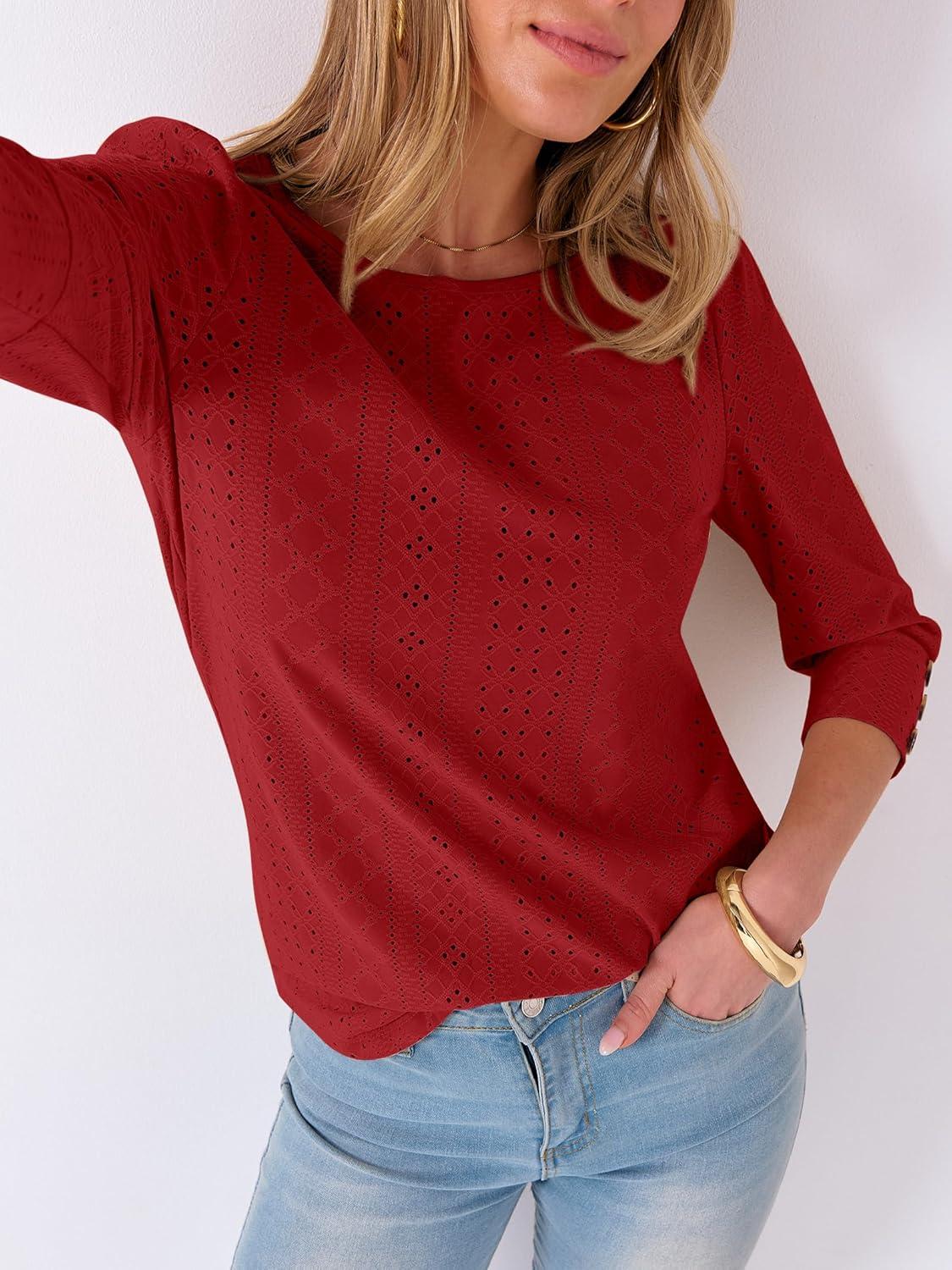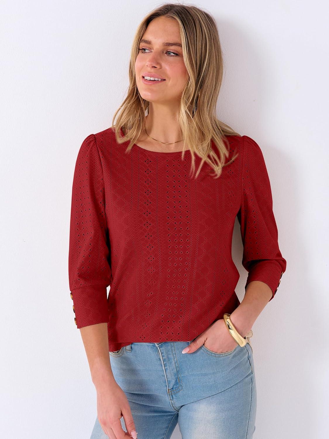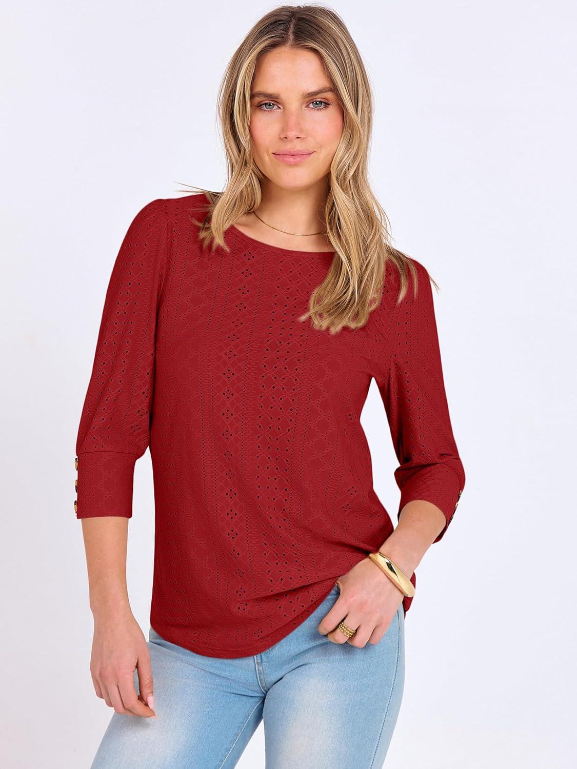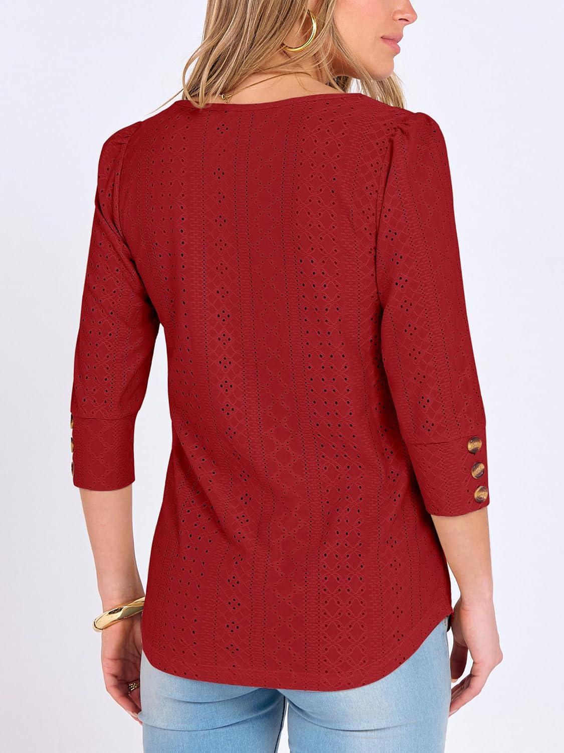 ANRABESS Womens Tops 3/4 Sleeve with Buttons Dressy Casual Blouses Summer Eyelet Shirts 2026 Spring Vacation Business Tunics(Red)