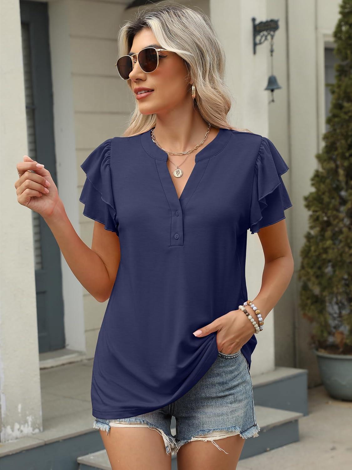 ANRABESS Womens Tops Dressy Casual Ruffle Short Sleeve V Neck Blouses Summer Button Down Business Work Elegant Shirts(Navy Blue)
